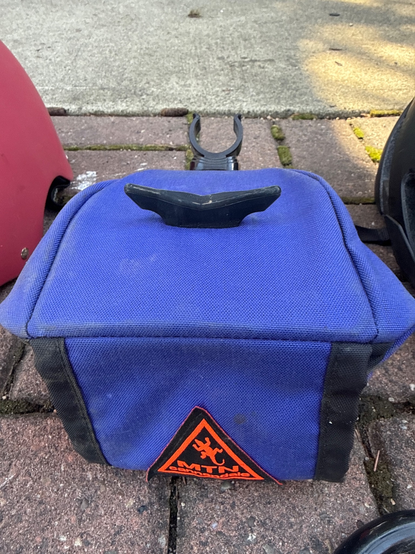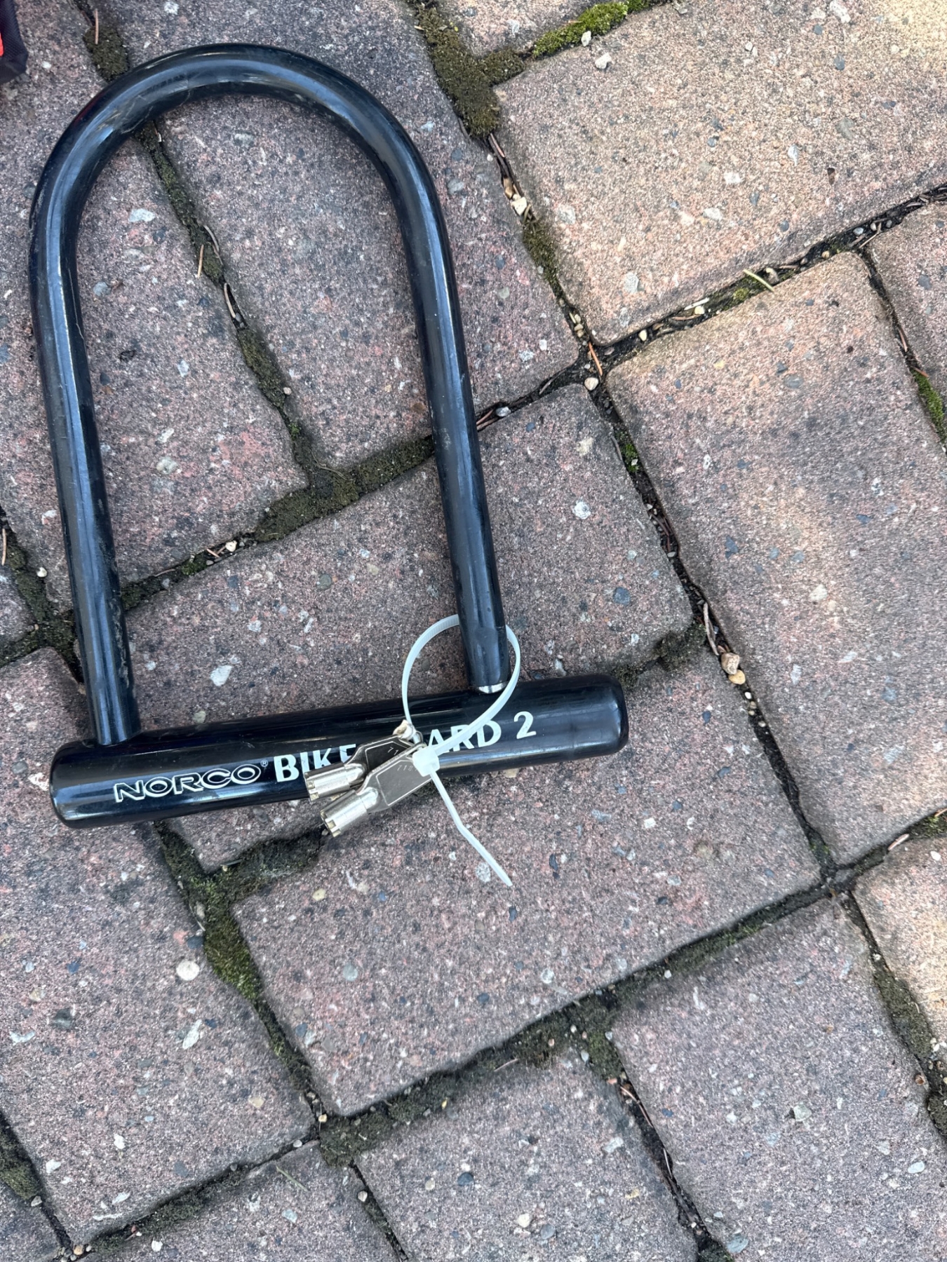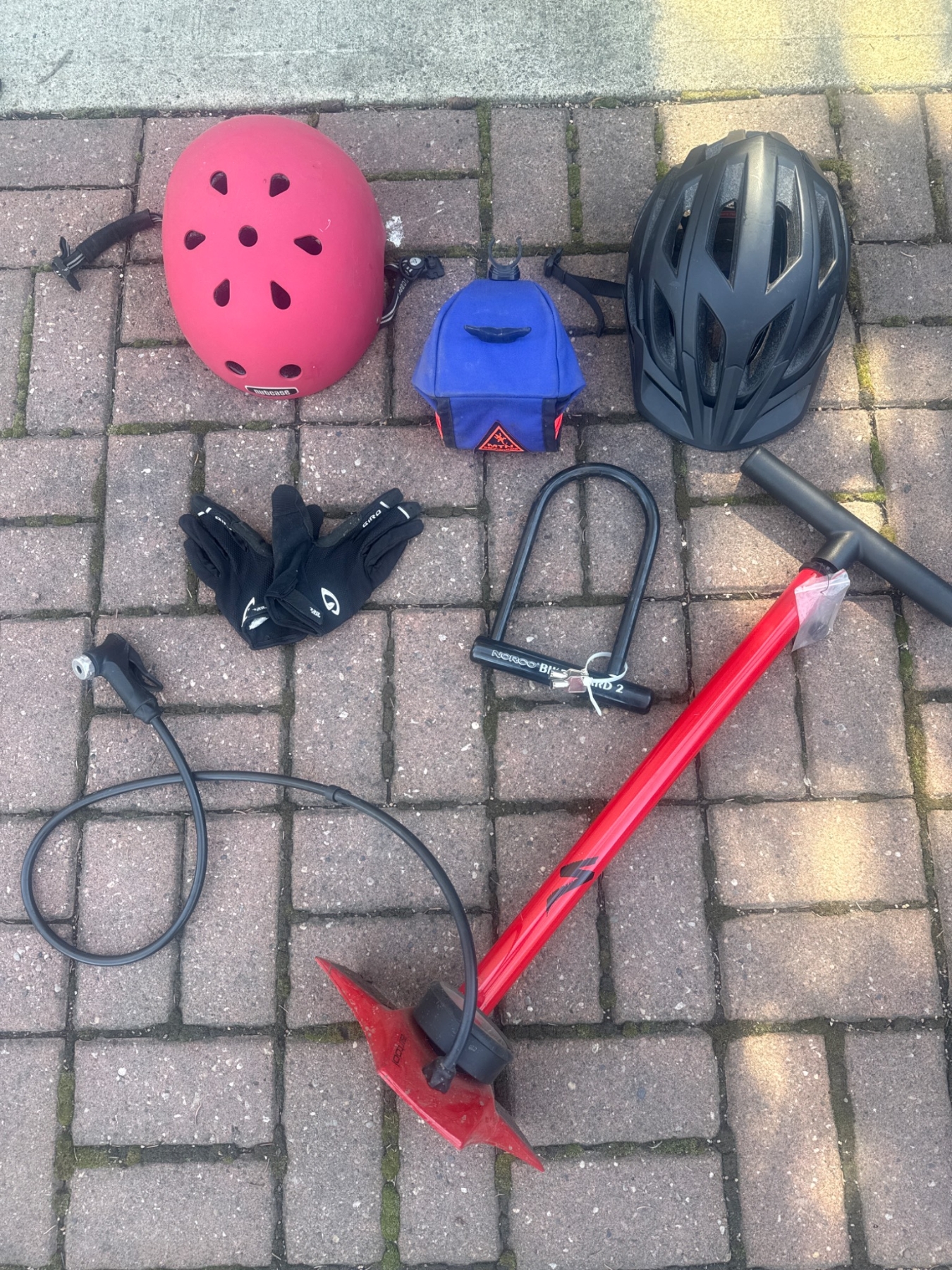 Complete cycling accessory bundle featuring a matte red nutcase helmet and a black ventilated helmet, both ideal for safety. Includes a Norco Bike Guard 2 U-lock for secure bike locking, a pair of lightweight, black Giro gloves for comfort, a red hand pump with hose for on-the-go inflation, and a blue carrying case suitable for compact storage. Dimensions: Helmets approximately 10x8x6 inches each, pump 24 inches tall. Some items show light use.