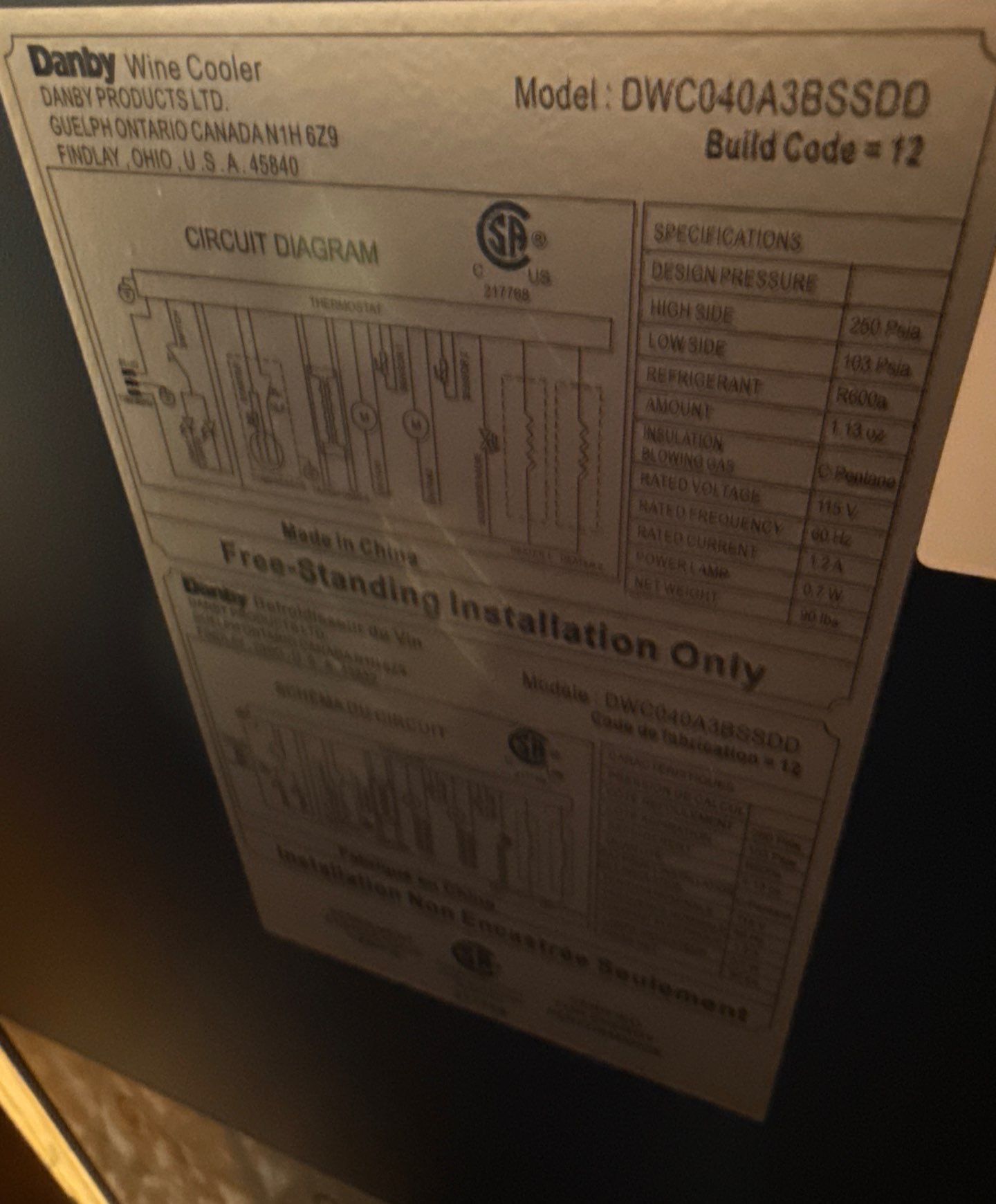 DANBY Wine Cooler, contents NOT Included, Model No. DWC040A3BSSDD 20W, 33T