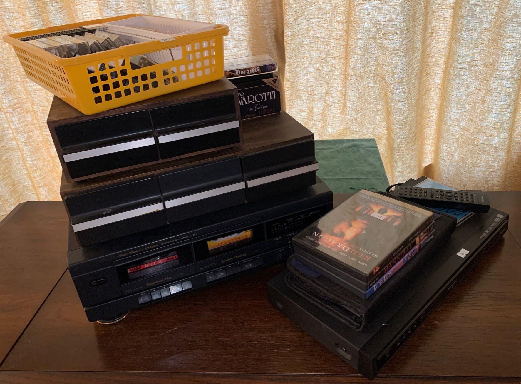 DVD Player (Magnavox, Model No. DP170MW8B), Cassette Player (Fisher, Model No. CR-W9005) & Cassettes