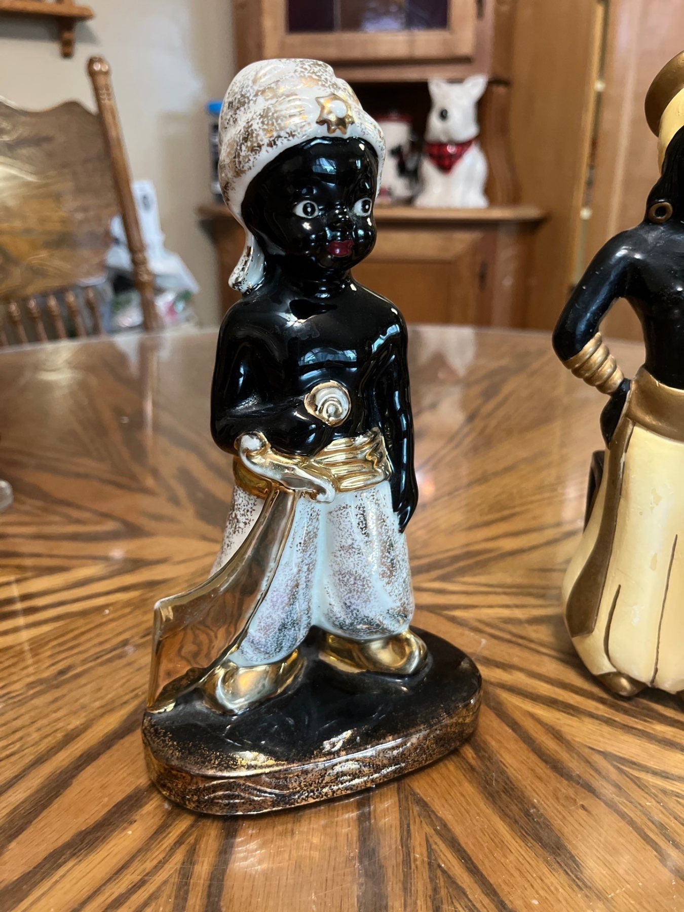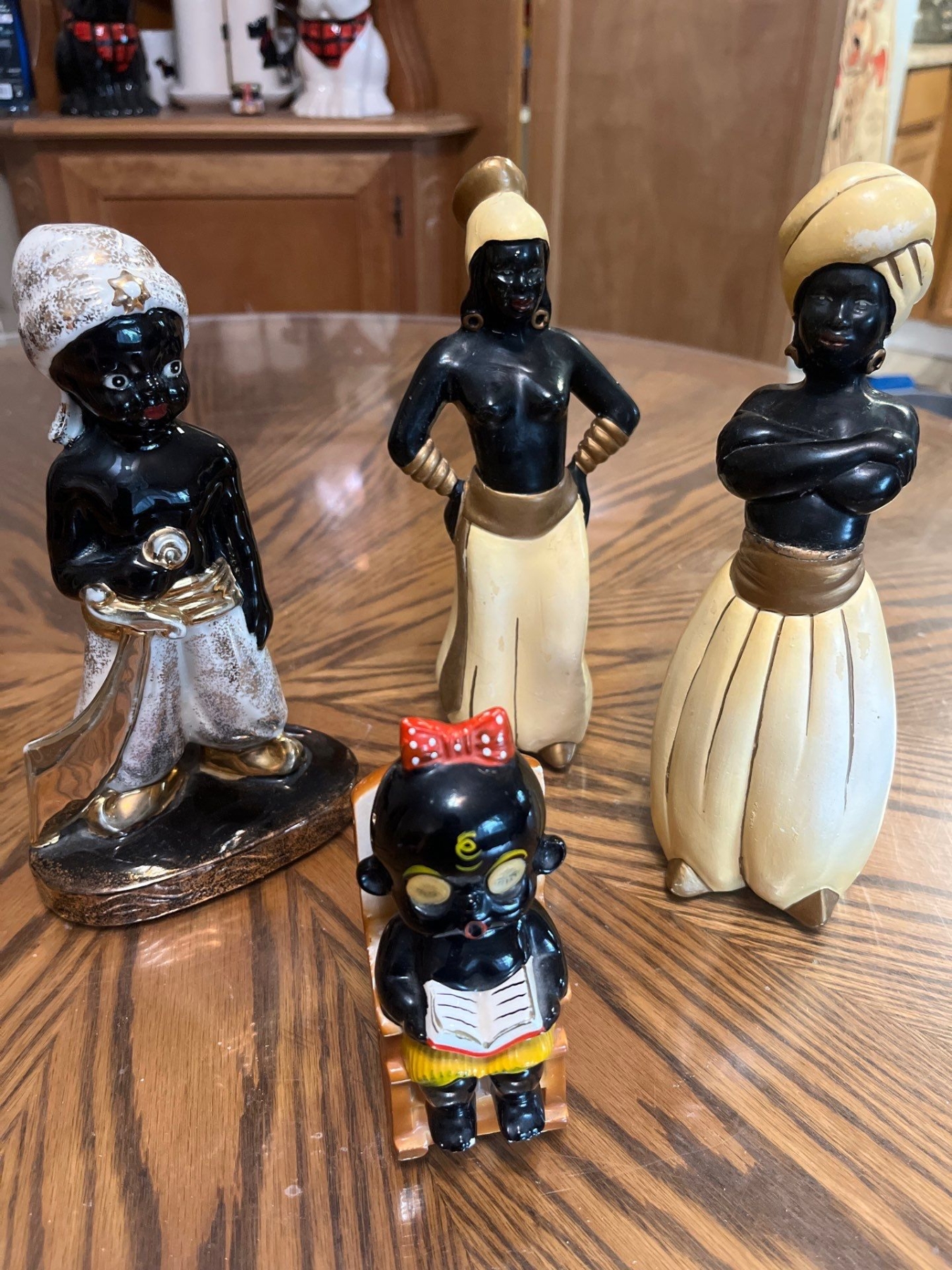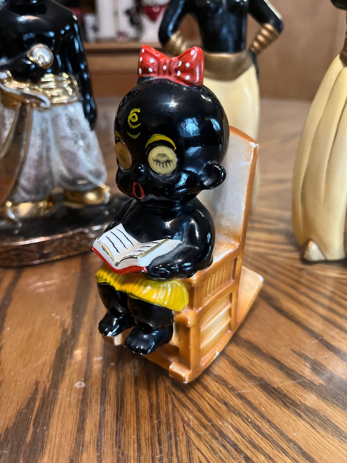 Dakko-chan doll, a controversial Japanese doll that became popular in the 1960s.Blackamoor figurine, a type of decorative art depicting a figure of a man of Sub-Saharan African descent, often in clothing suggesting high vintage Blackamoor or Nubian Genie-style chalkware set of 2