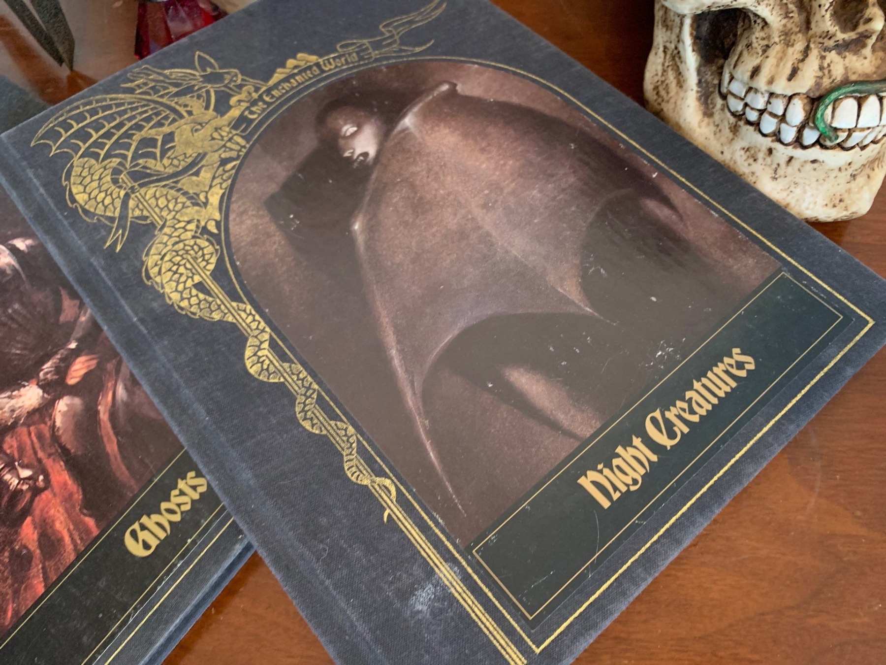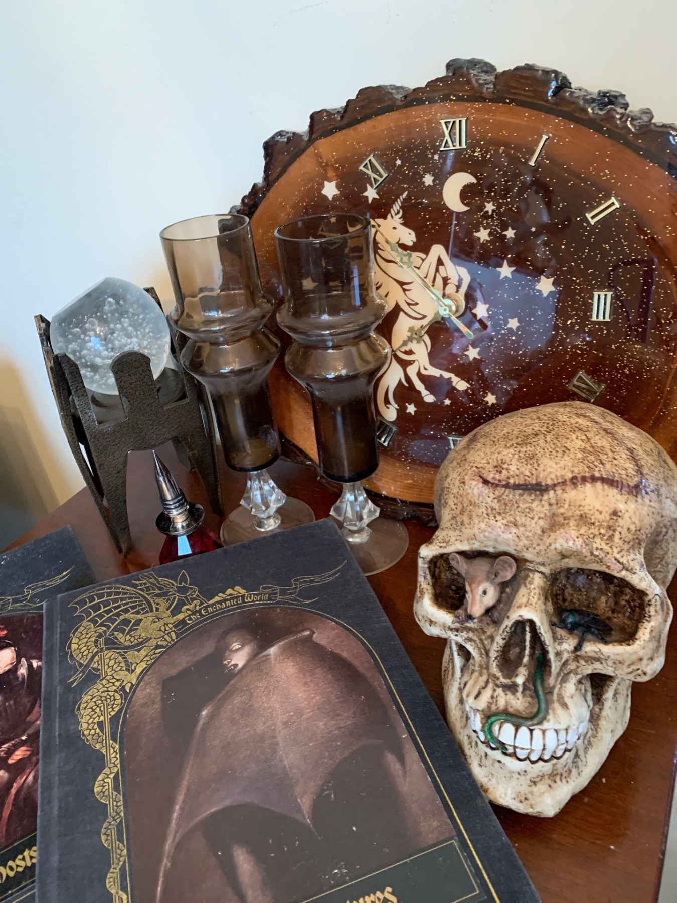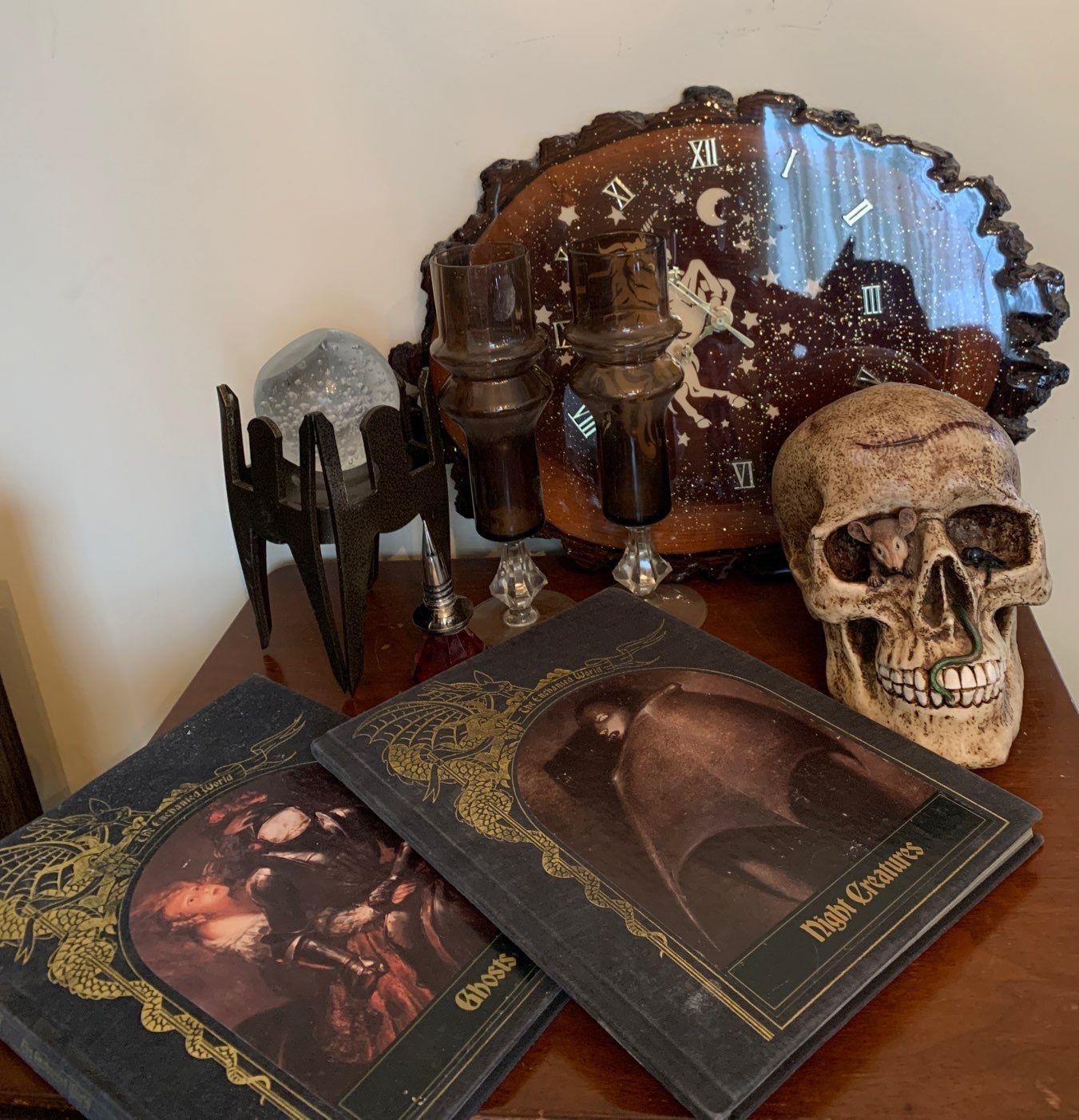 Dark Arts Collection - Burlwood Zodiac Clock  w/ Gothic Cocktail Glasses Crystal Ball Demon Books
