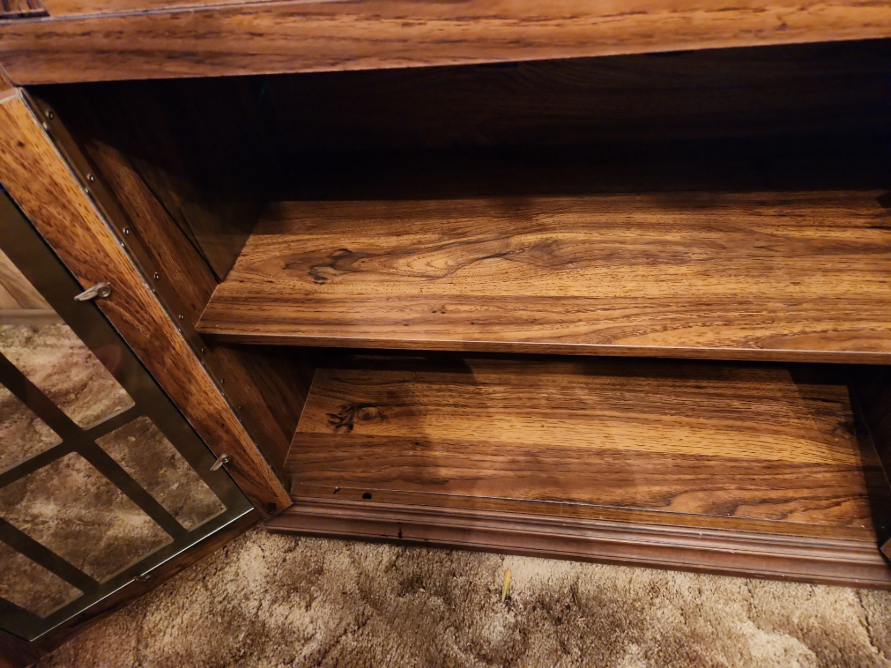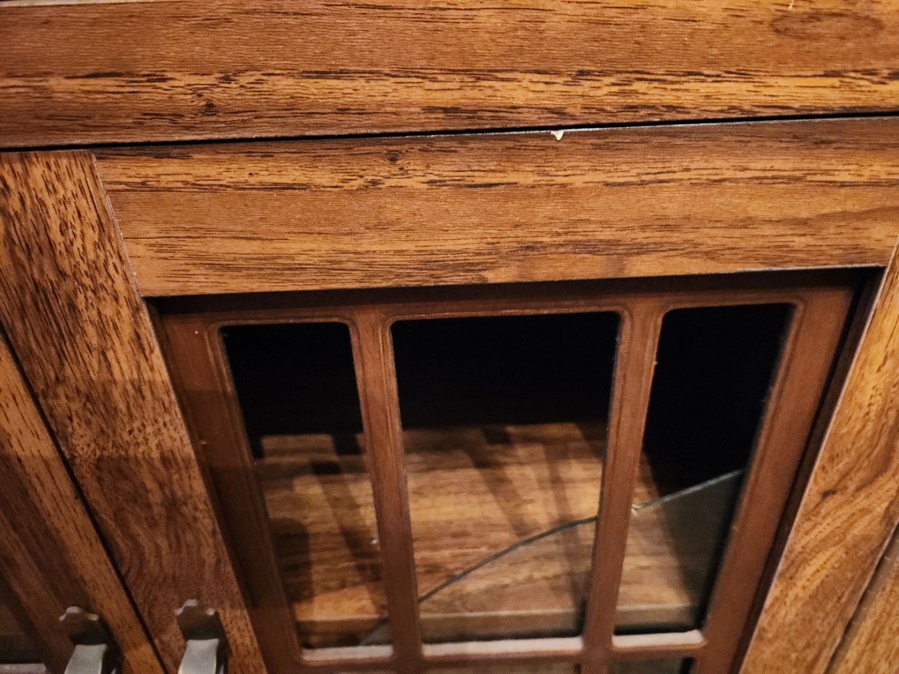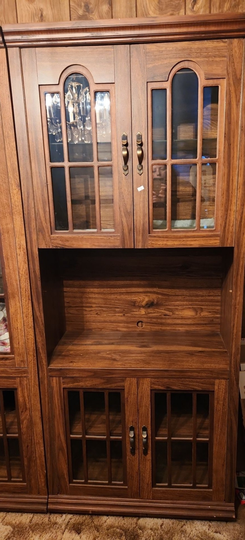 Middle Shelf Not Included from Open Piece, Some Scuffs, 1 Broken Glass Door, 2 Pieces Side by Side, Contents Not Included