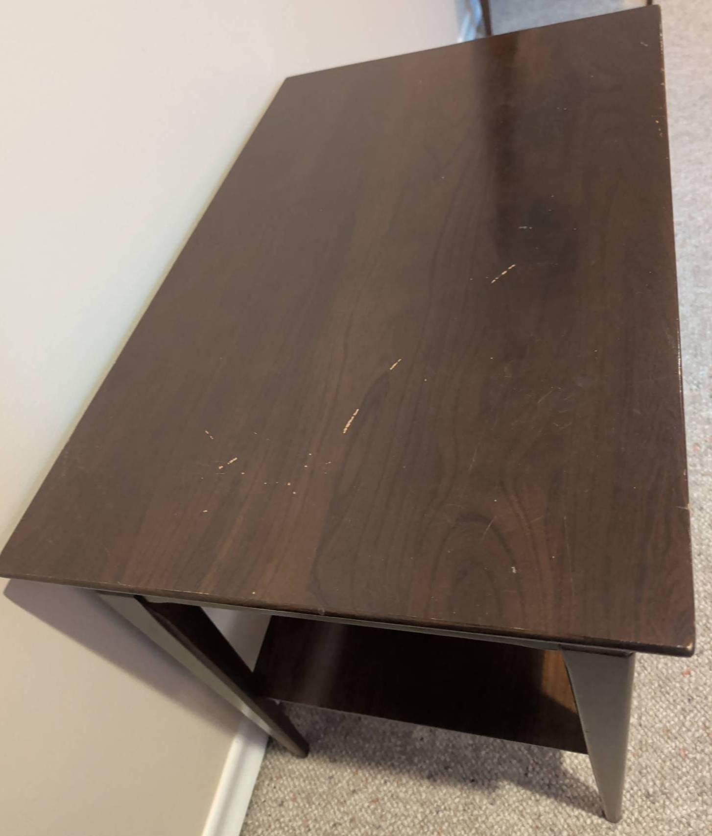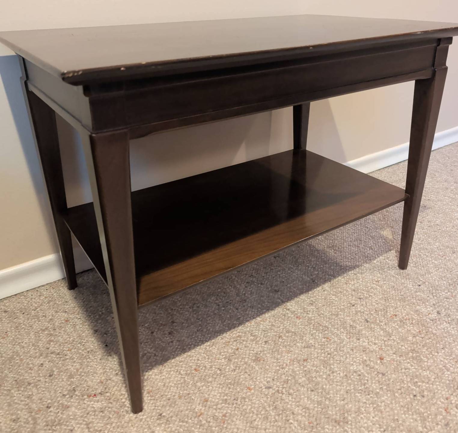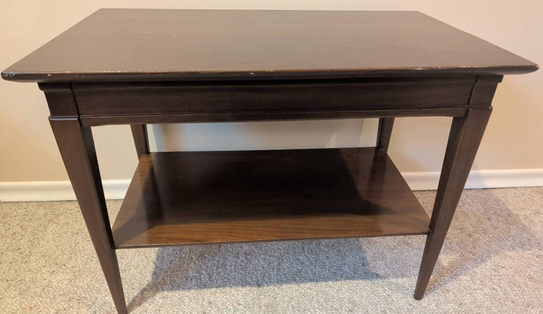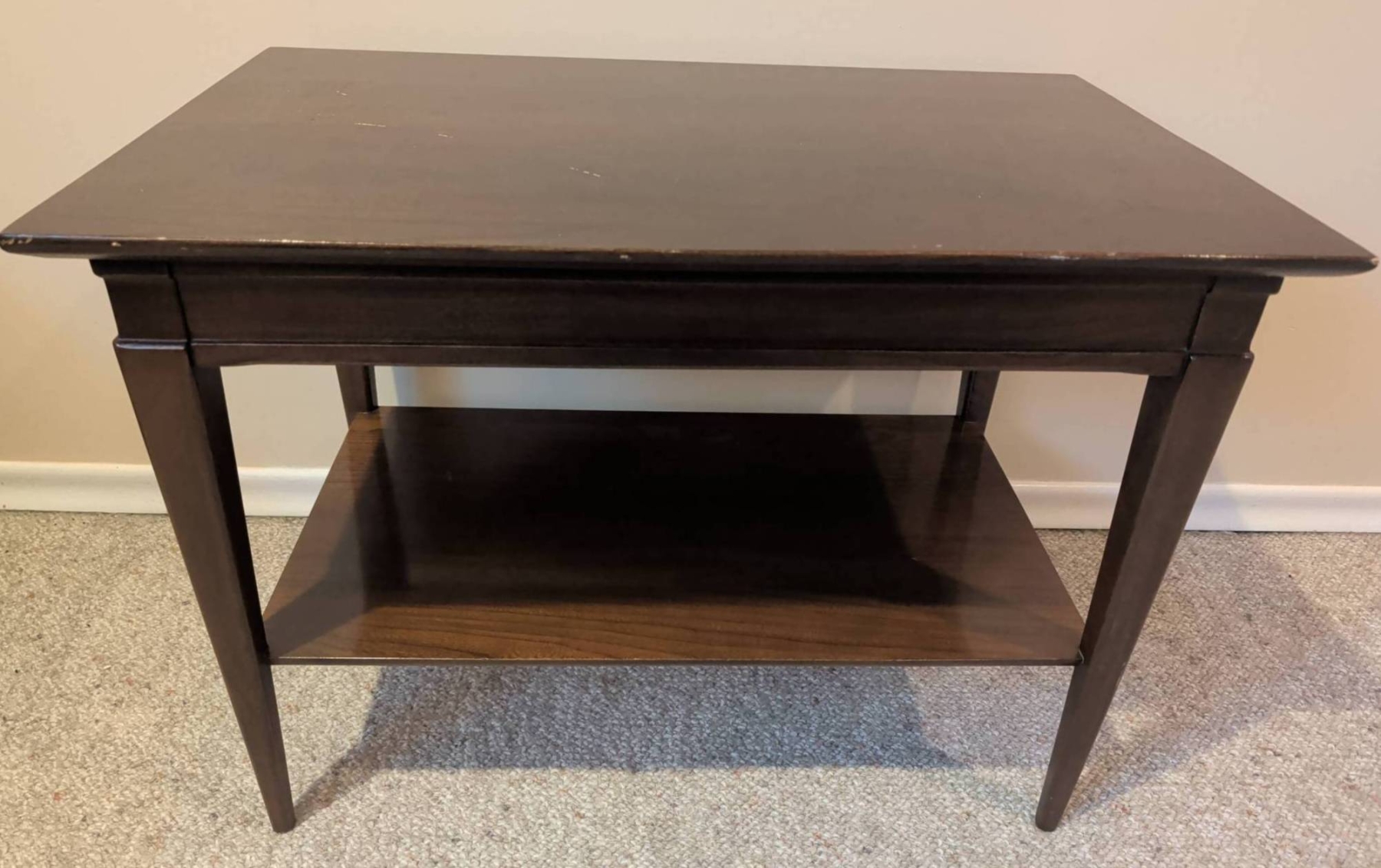 Classic dark wood side table featuring a rectangular top and sleek tapered legs. The table includes a single lower shelf for added functionality and storage. This piece measures 28 inches wide, 18 inches deep, and 24 inches high. Some surface wear is visible, adding character to the timeless design. Ideal for use as an accent table, end table, or small workspace.