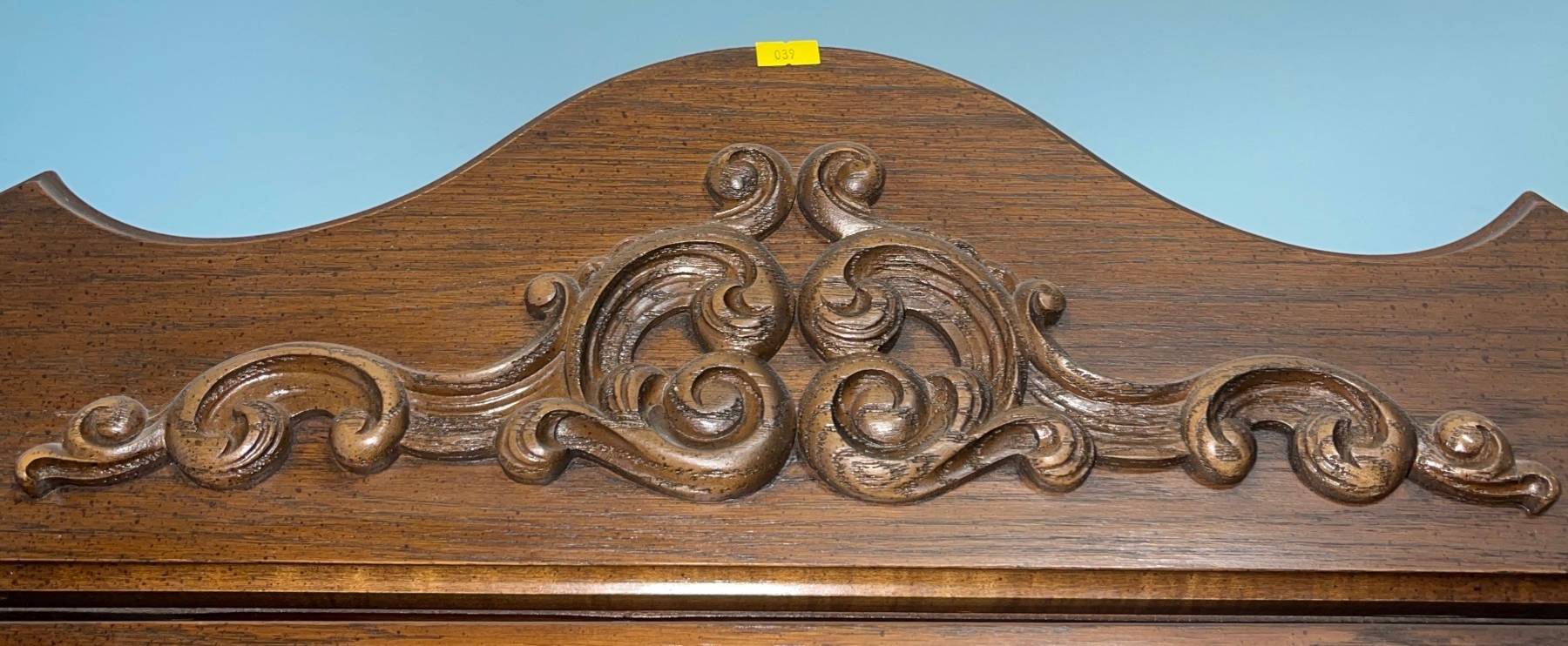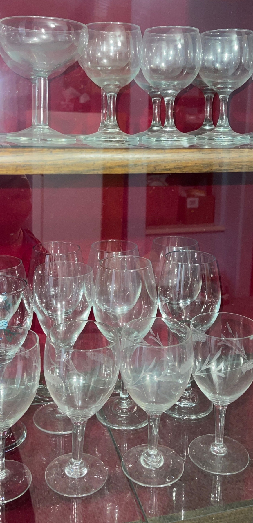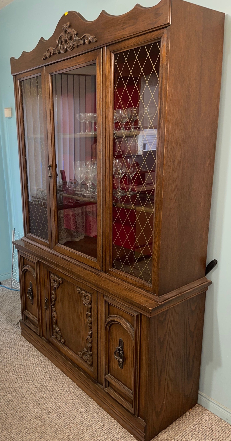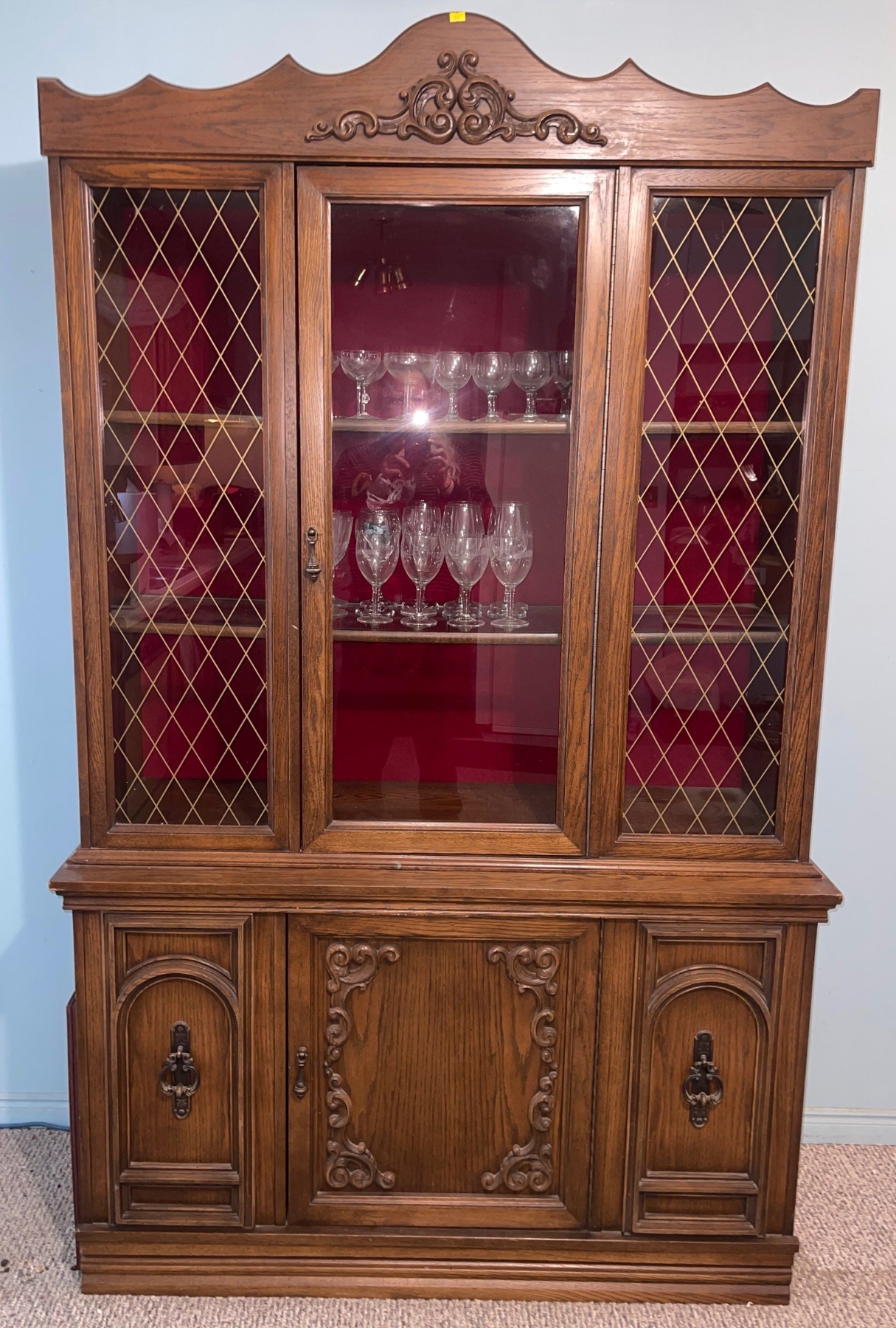 Dark Wood China Cabinet w/Cool Design on Glass Doors Wine Glasses Included