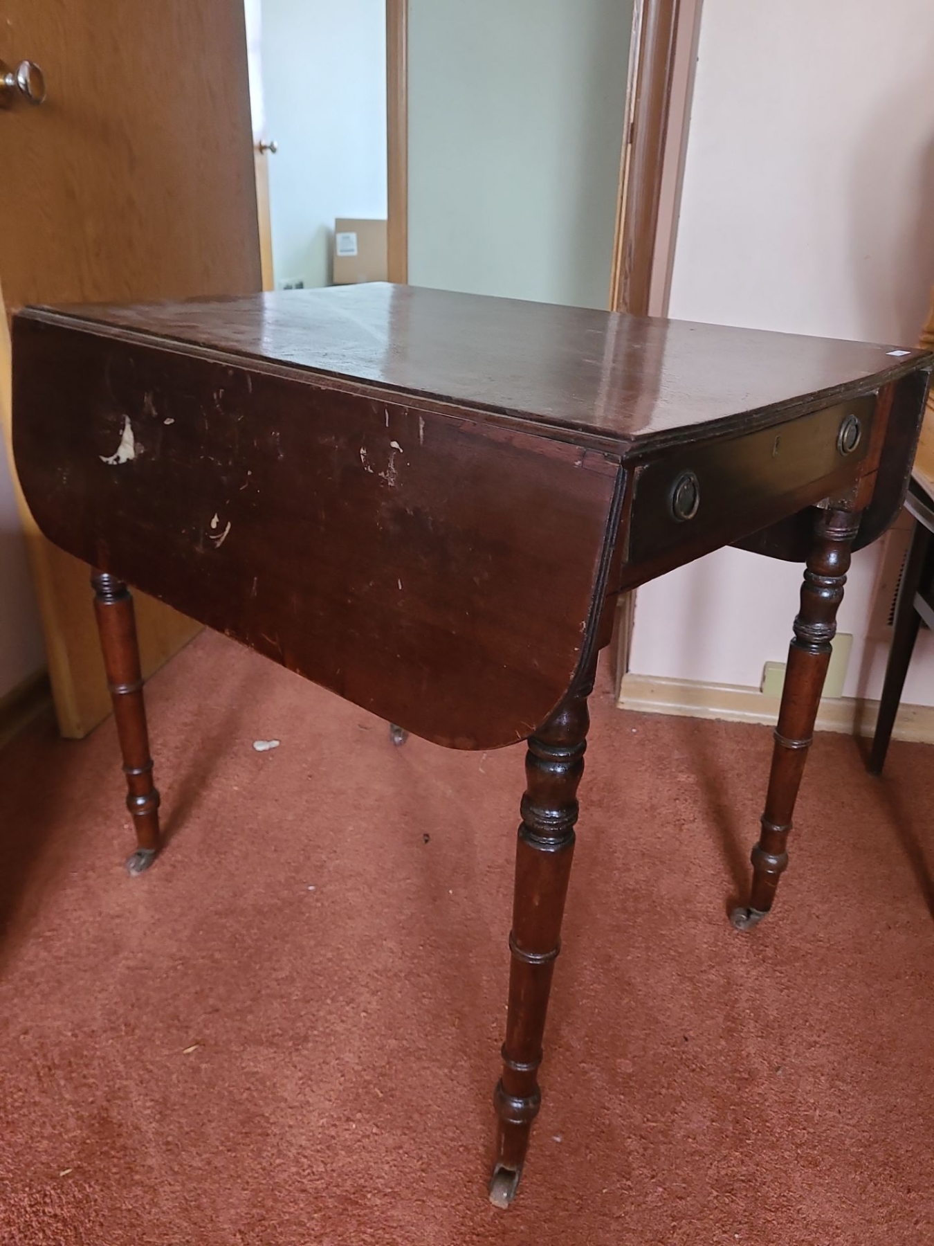 Dark Wood Table on Wheels with Drawer- With Side Flaps Opened 37 L,  29 W,  27 T