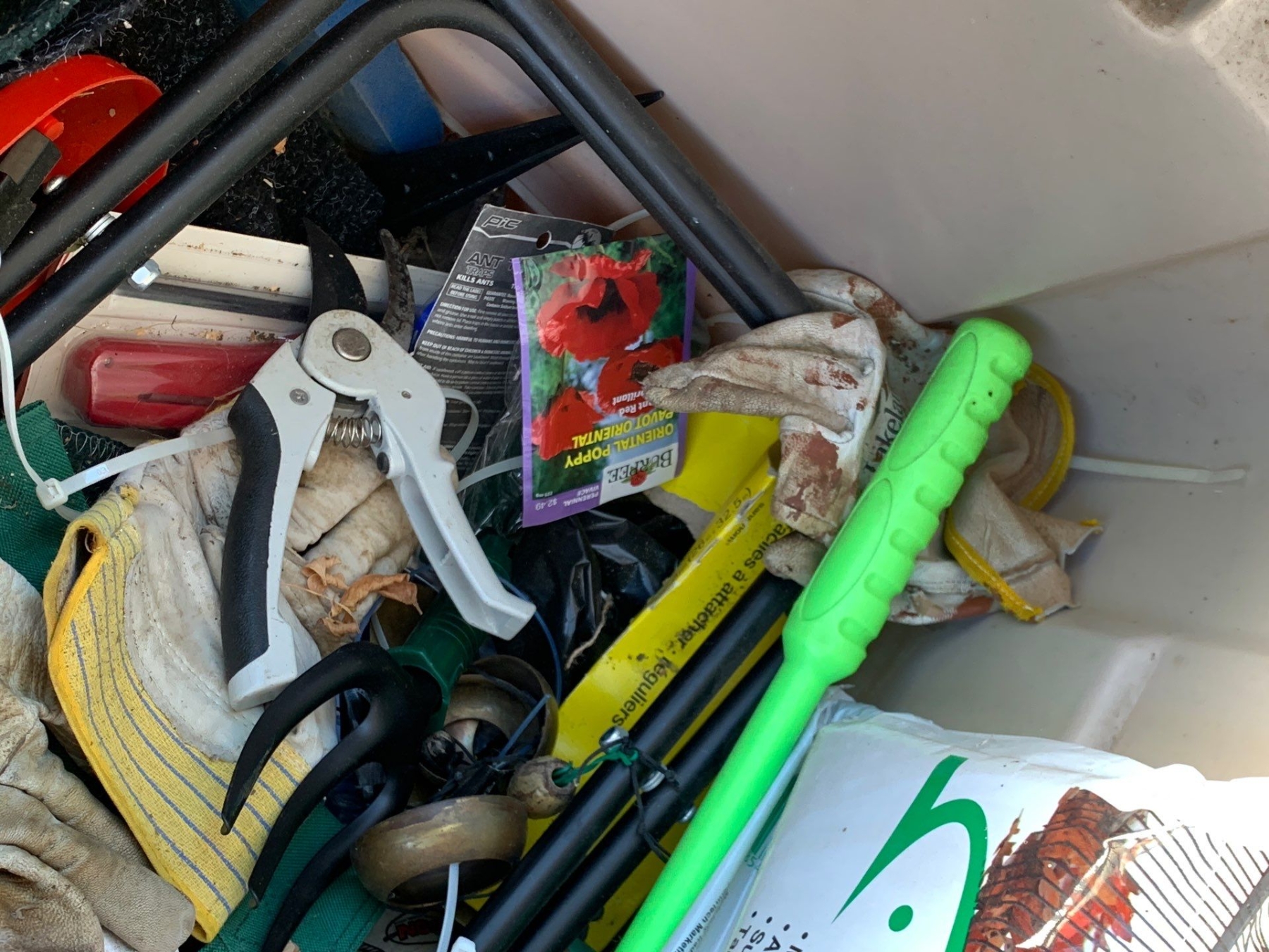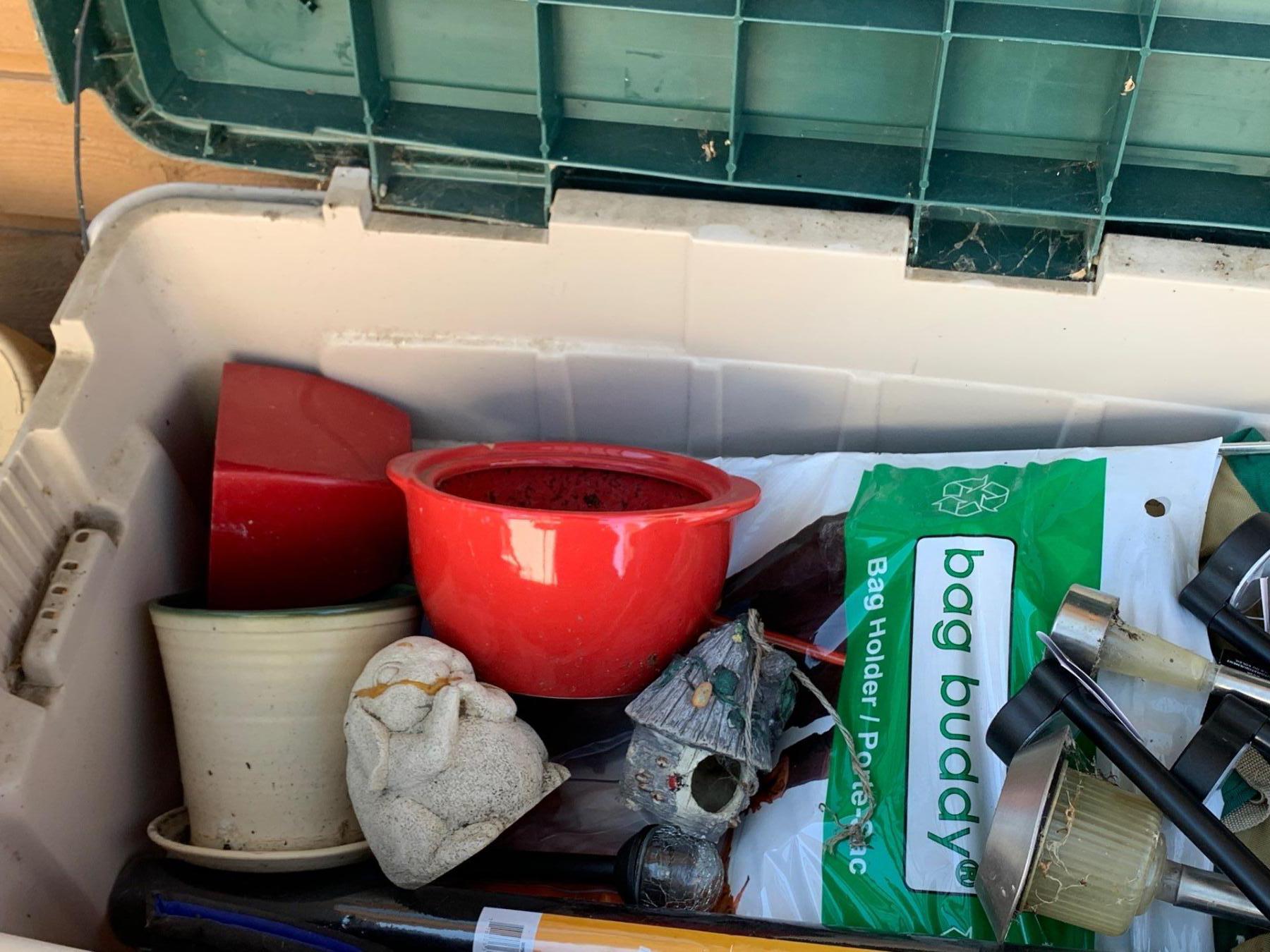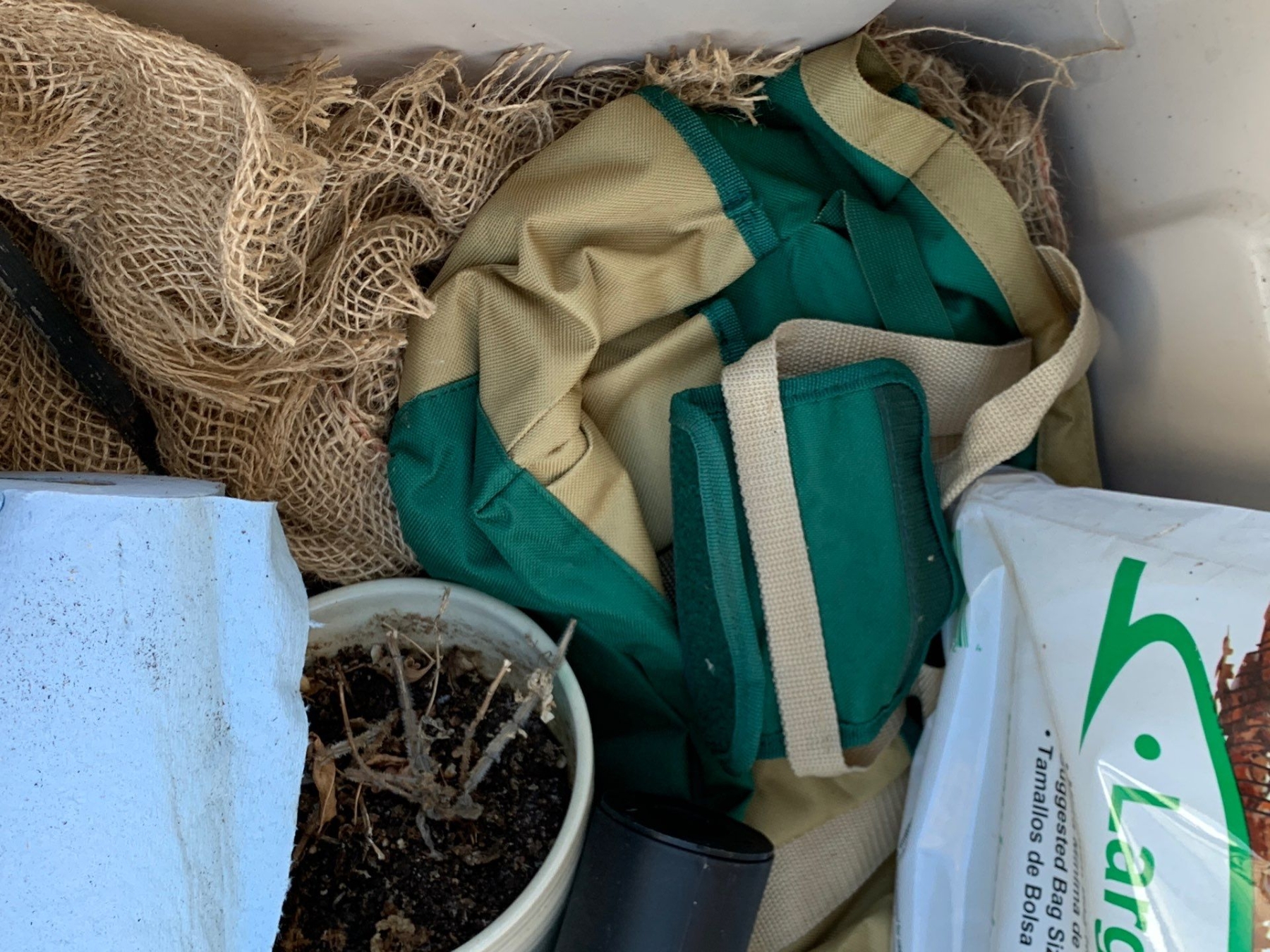 Deck Box Full of Garden Tools, Hand Tools, Burlap, Solar Lights, miracle-grow and Planter Pots