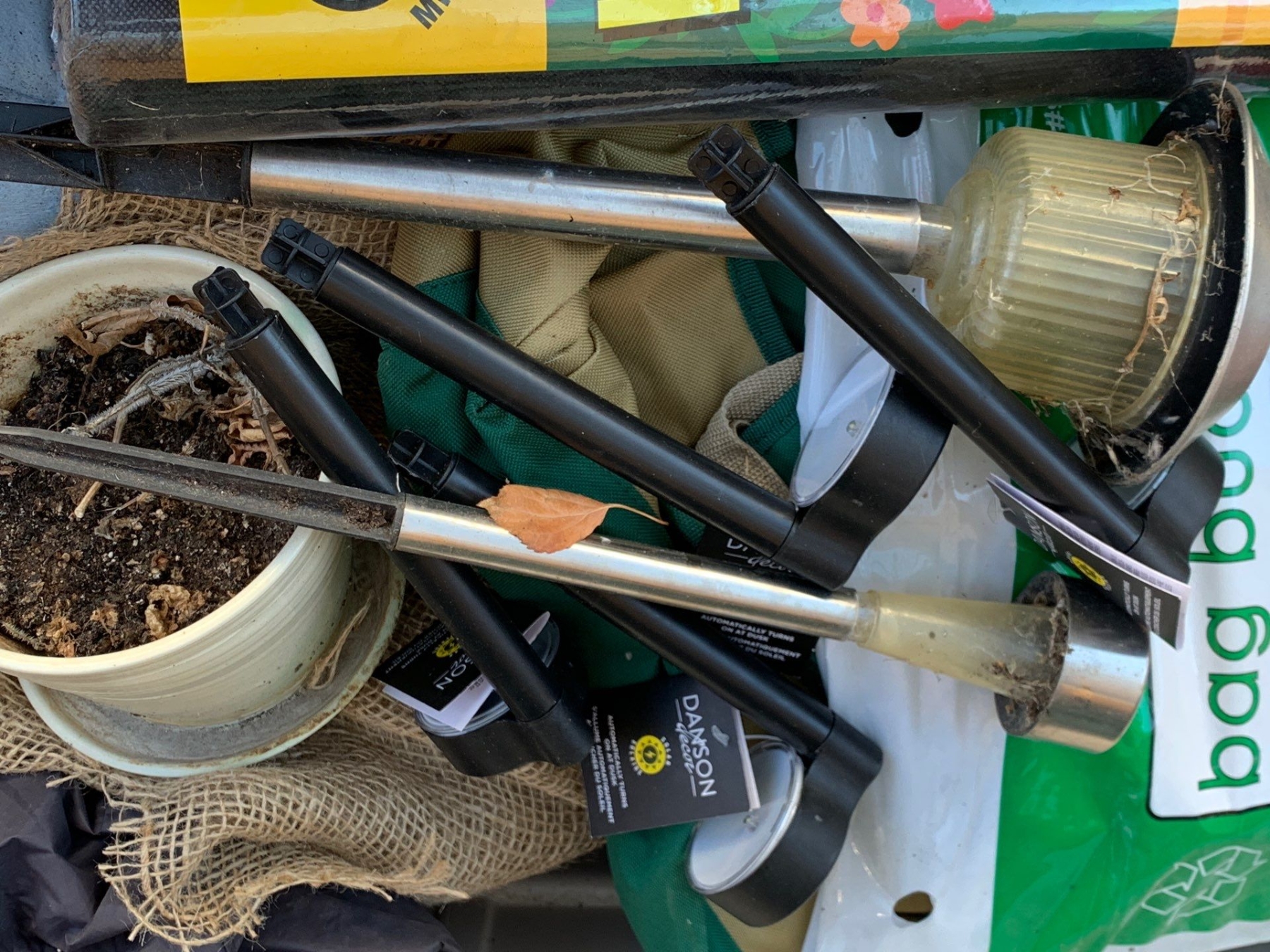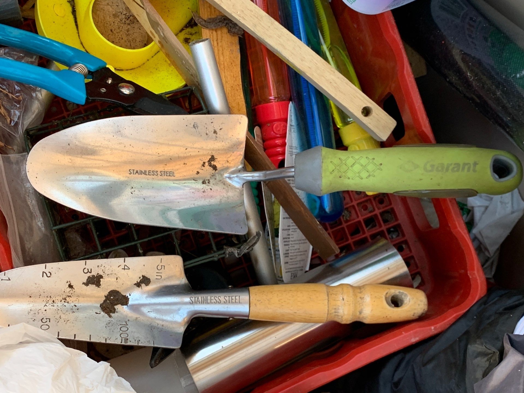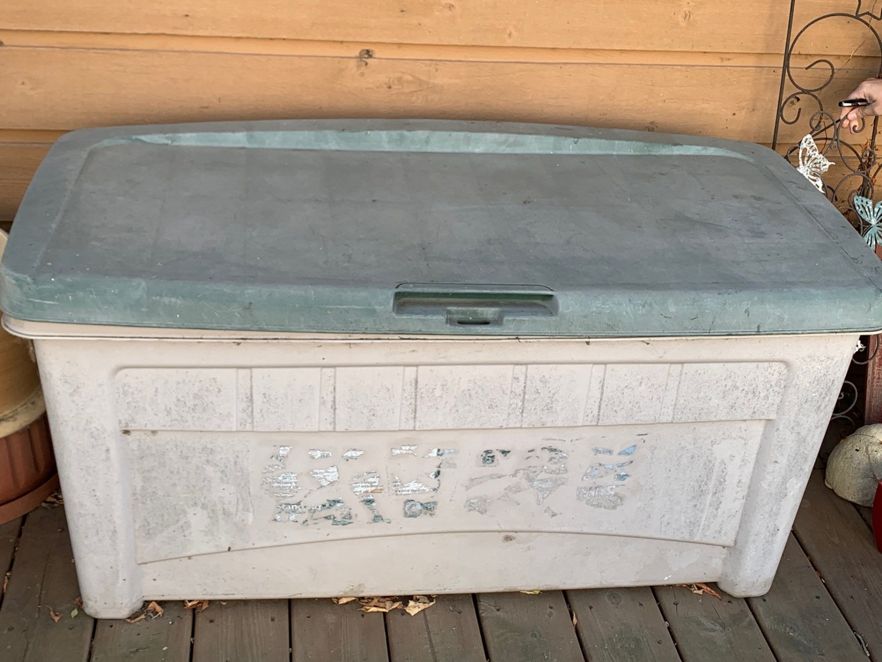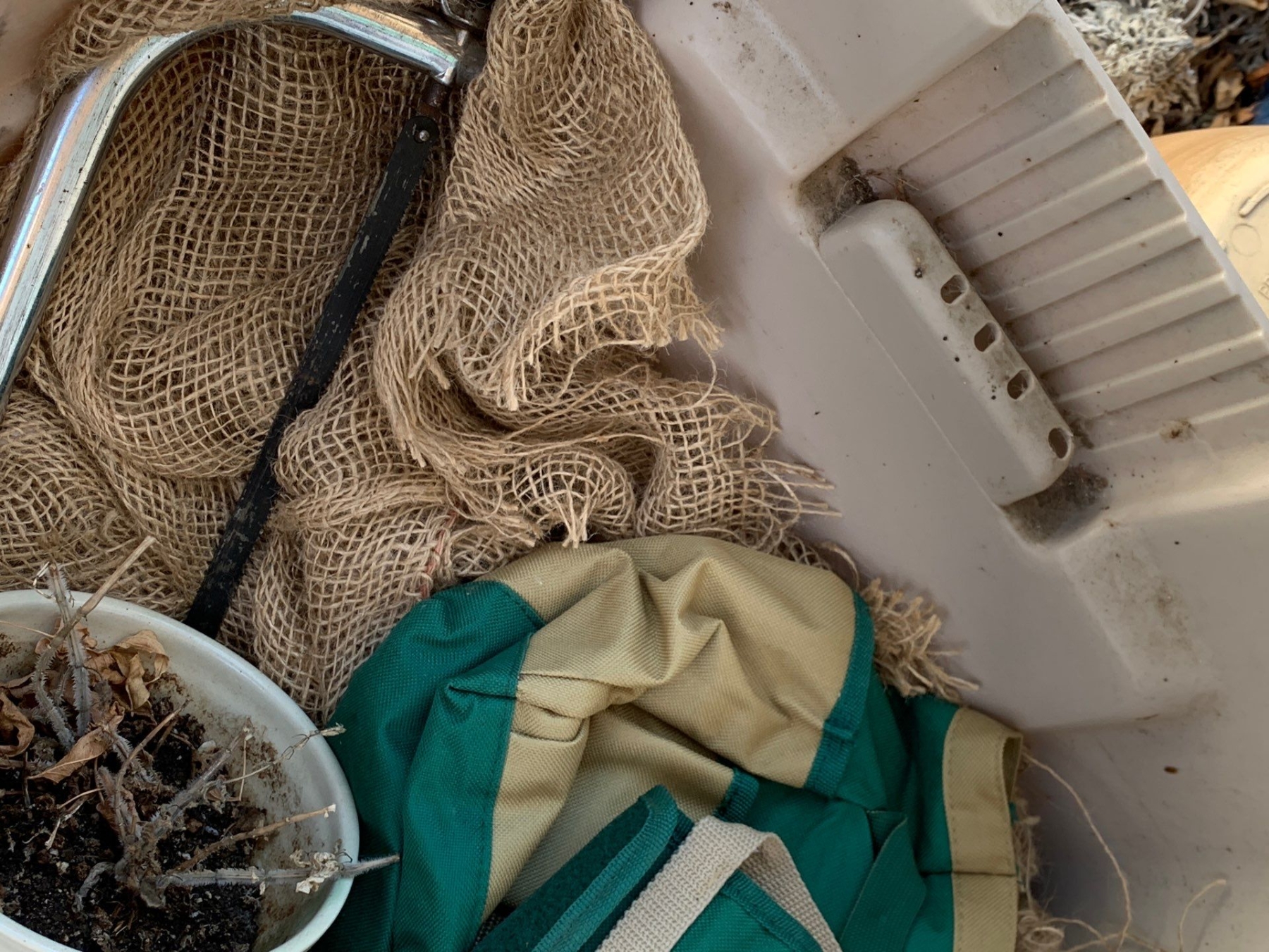 Deck Box Full of Garden Tools, Hand Tools, Burlap, Solar Lights, miracle-grow and Planter Pots