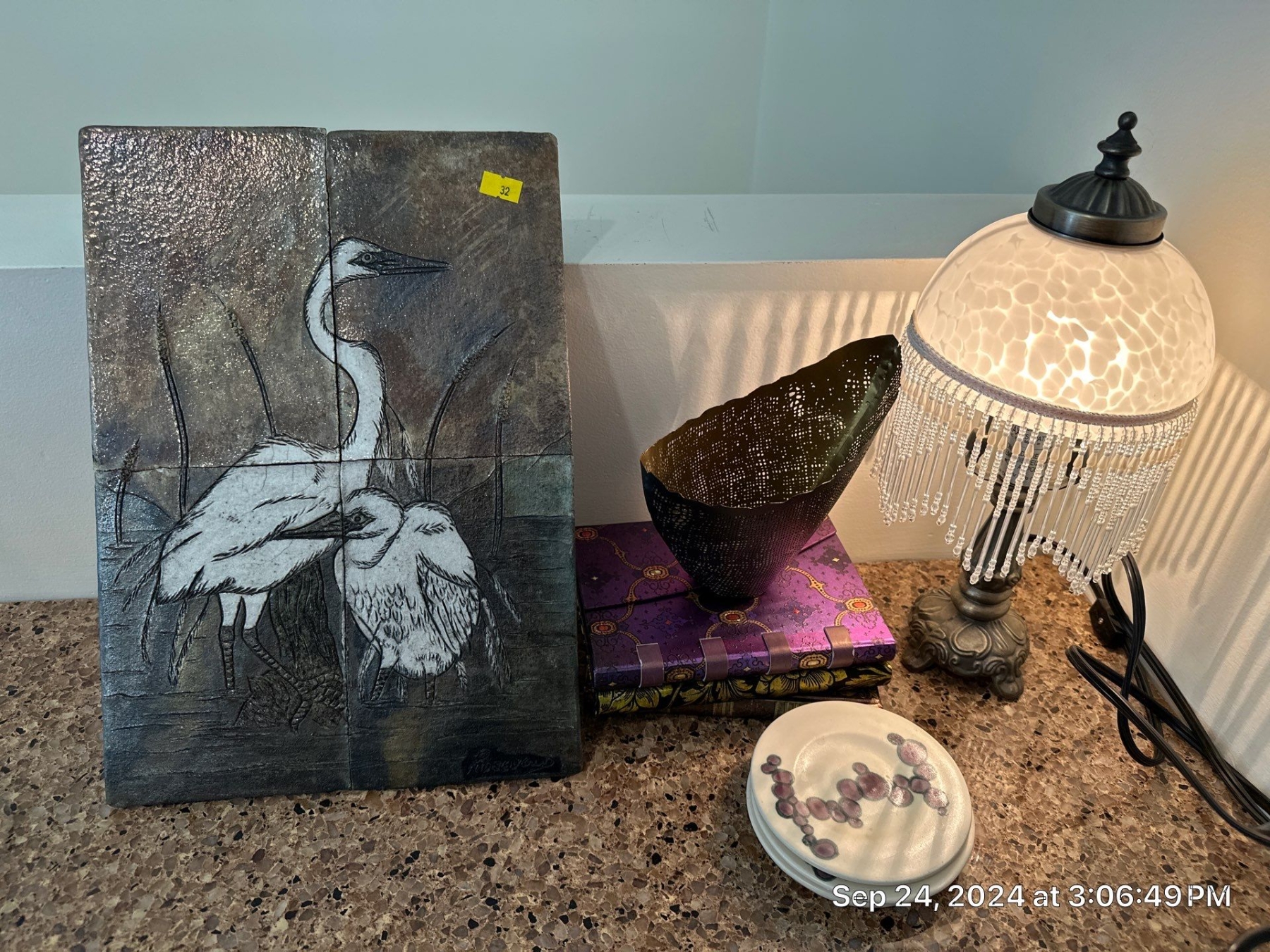 Decor Including Bird Tiles w/ Art Deco Style Lamp