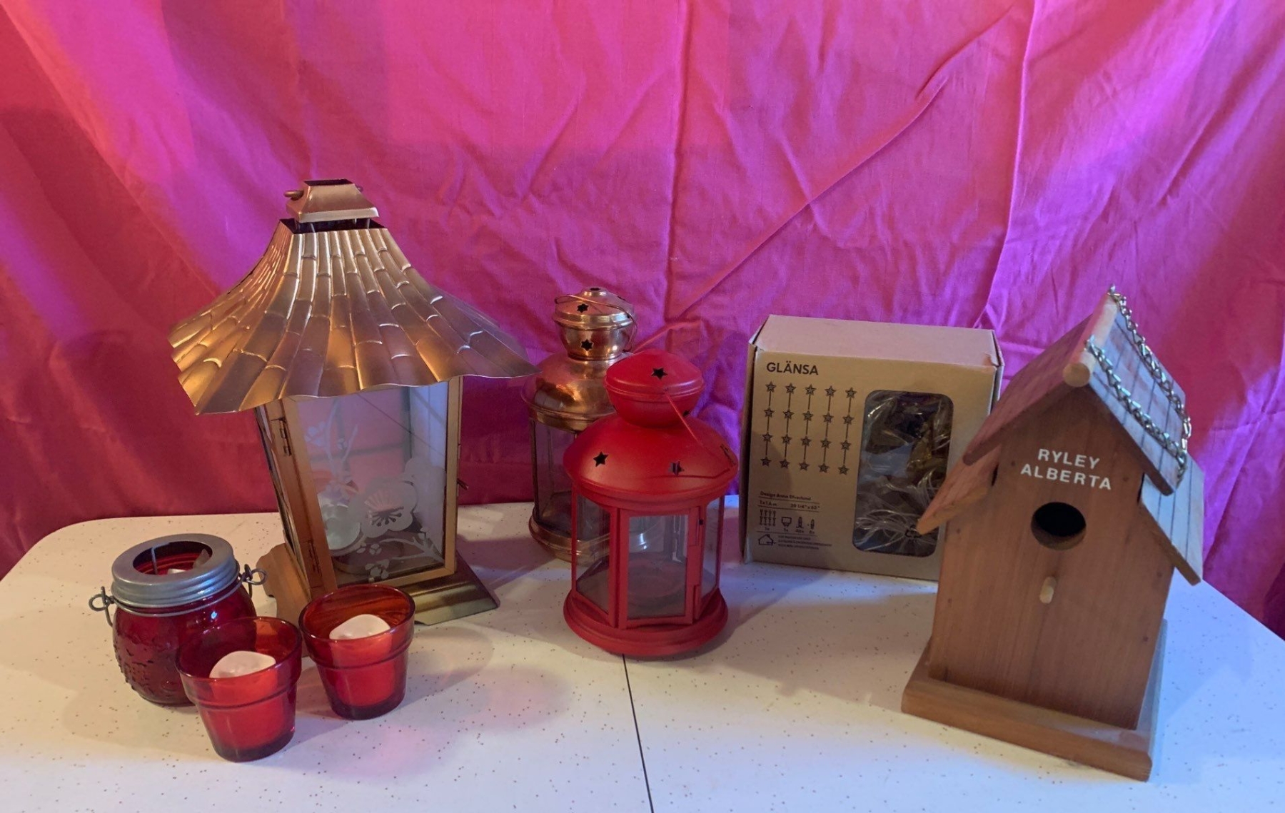 Decor Lot, Lanterns, Lights, and Birdhouse