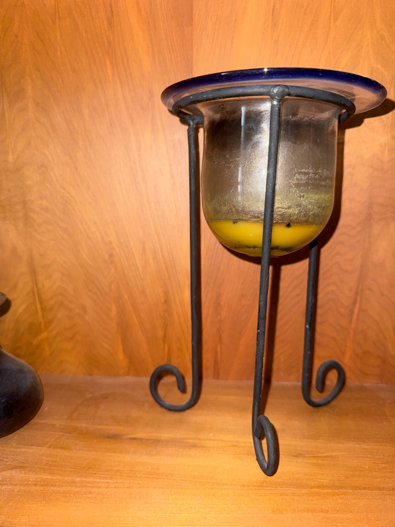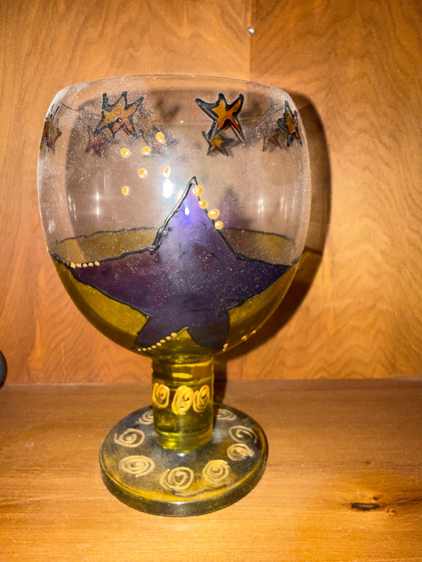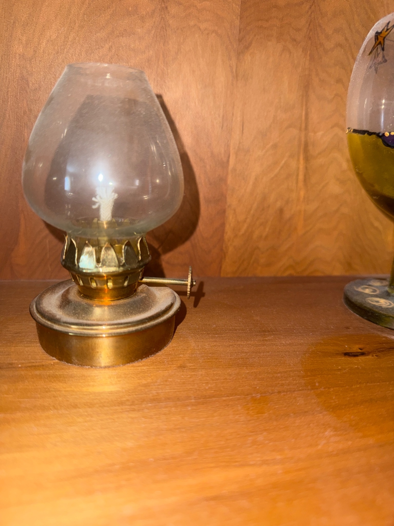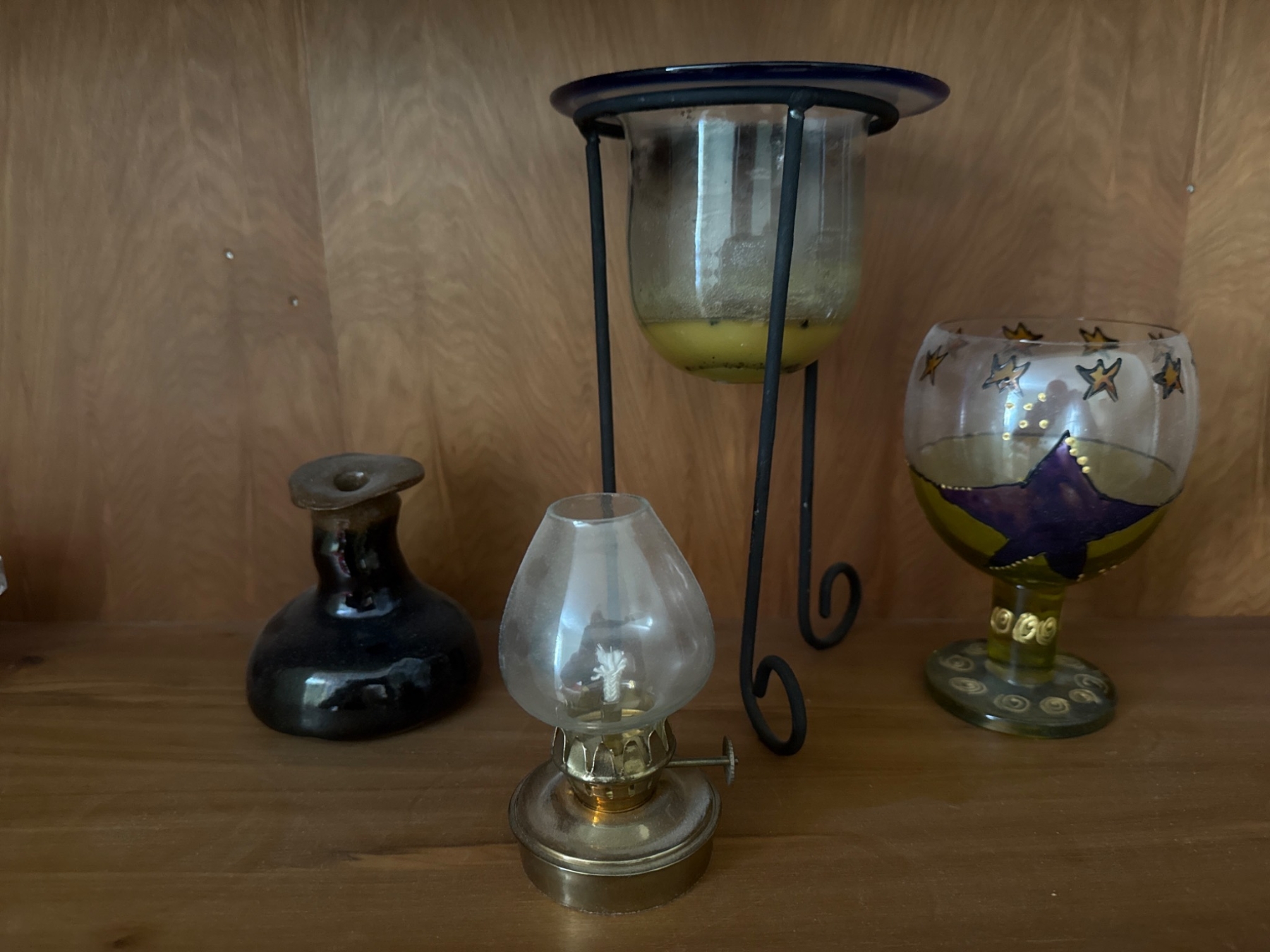 - Includes 4 unique items: a small brass-and-glass oil lamp, a painted glass goblet, an iron-frame candle holder with a glass base, and a squat decorative black vase. | - The brass oil lamp measures approximately 4 in tall and features a clear flower-patterned glass shade. | - Painted glass goblet includes star and swirl designs with a base featuring additional decorative elements, approximately 8 in tall. | - Metal-framed candle holder measures approximately 10 in tall with a transparent glass candle container. | - Black vase displays a glazed finish and measures approximately 6 in tall.