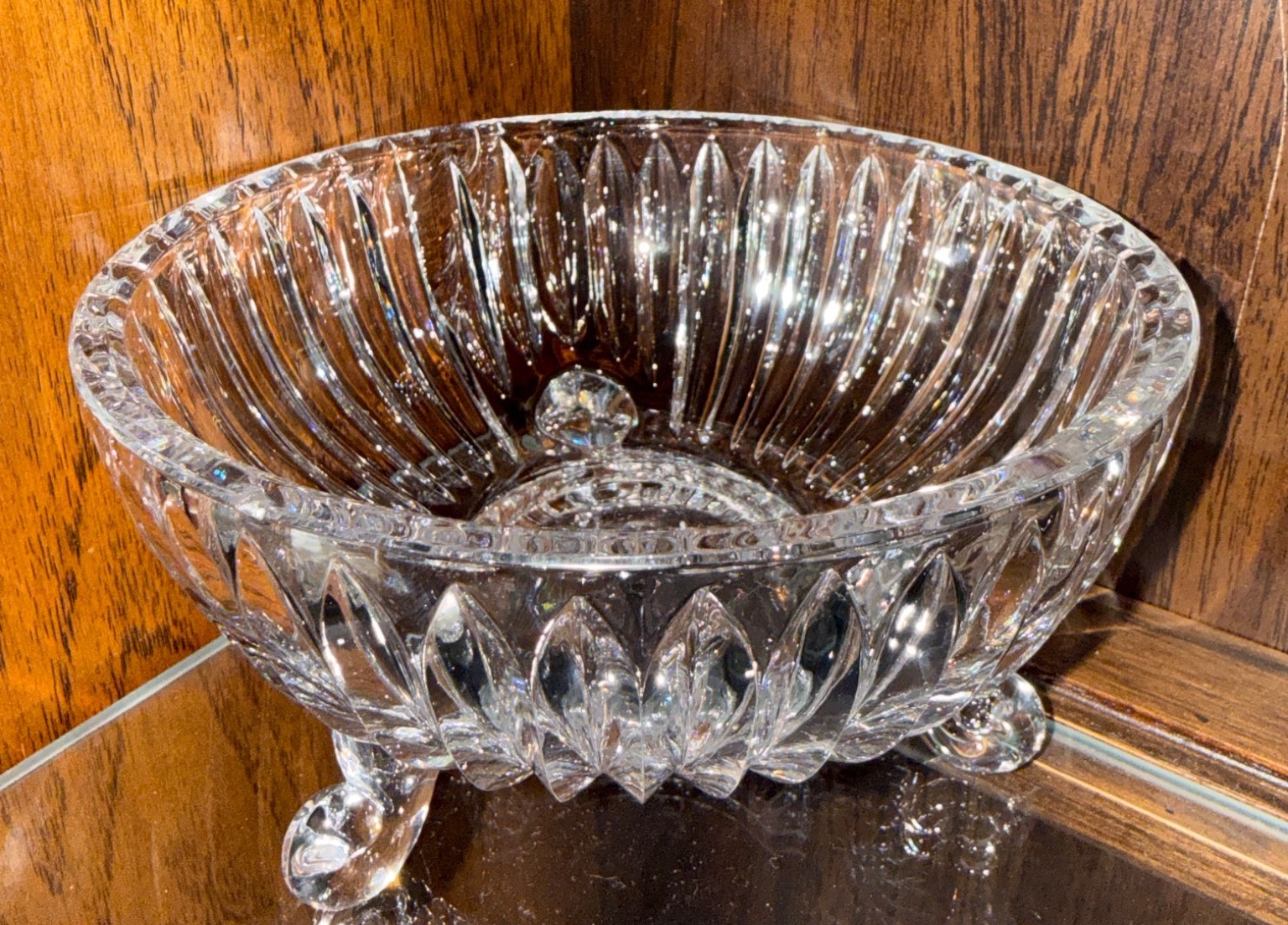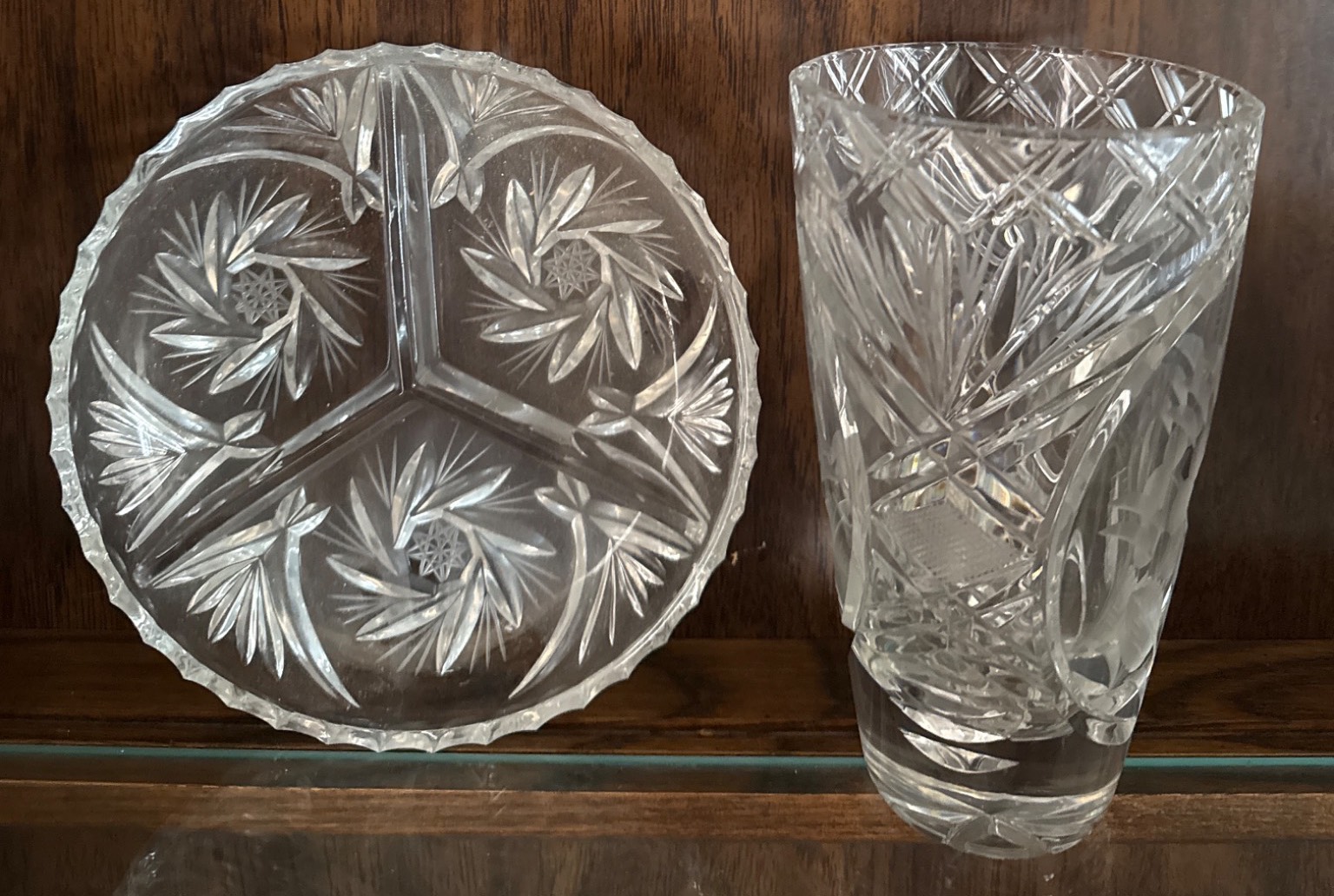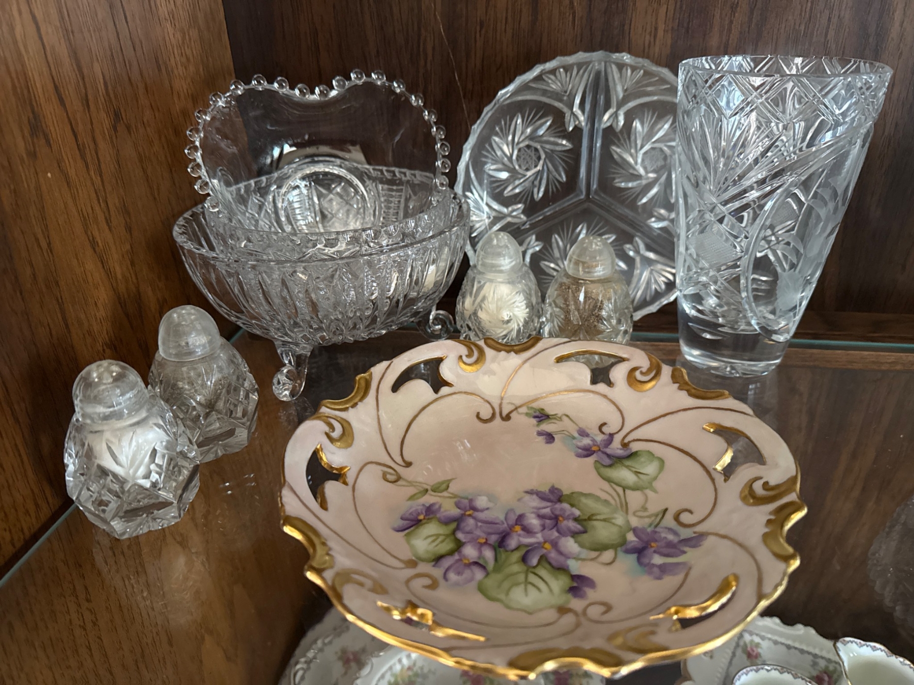 Collection featuring elegant glassware and one hand-painted porcelain plate. Includes a delicate pierced porcelain plate with a floral violet design and gold accents (approximately 8.5 inches in diameter). The glassware comprises cut glass bowls with intricate patterns, a set of salt and pepper shakers with clear cut-glass bases, an etched divided serving plate (approximately 8 inches in diameter), a textured cylindrical vase, and a glass bowl with trim details. Perfect for display, dining, or gifting.