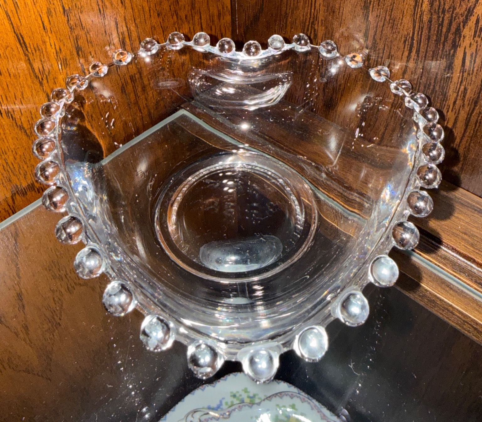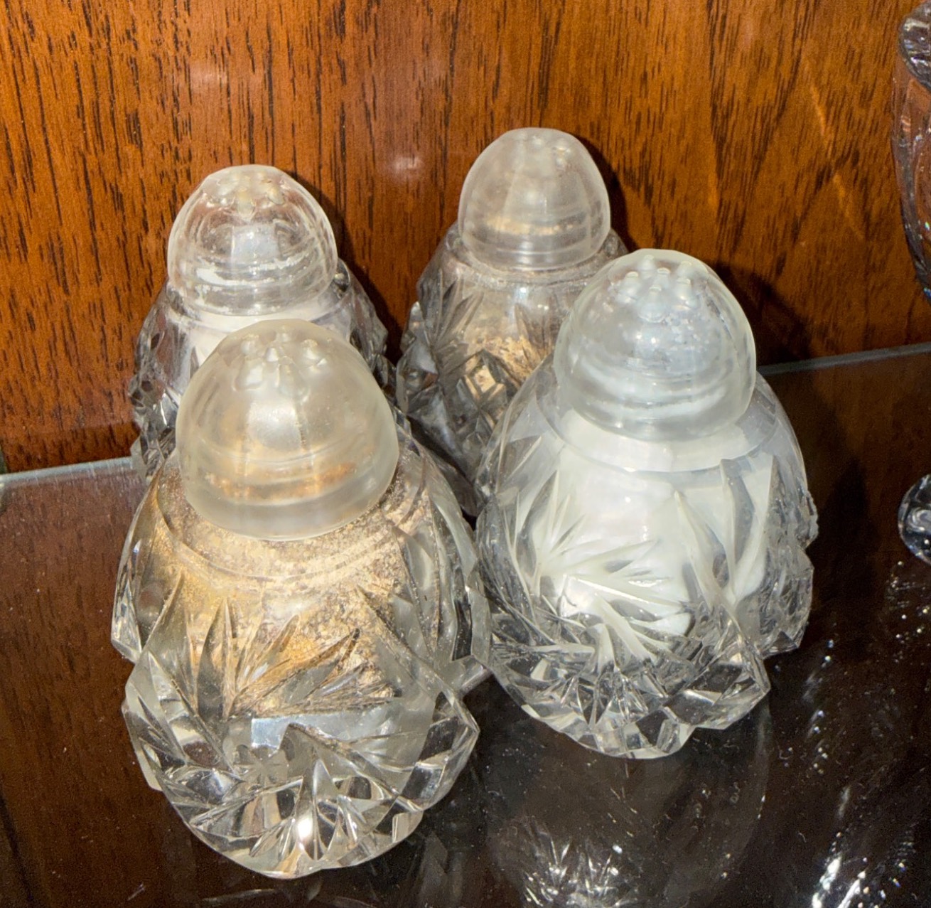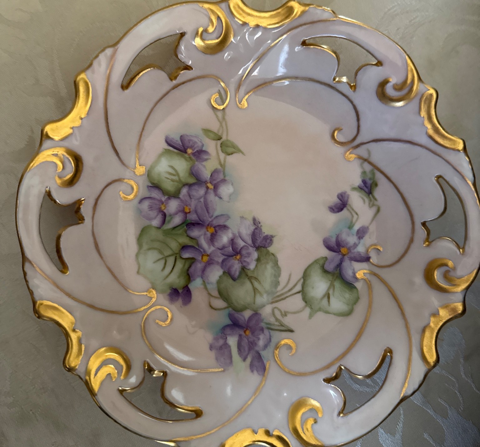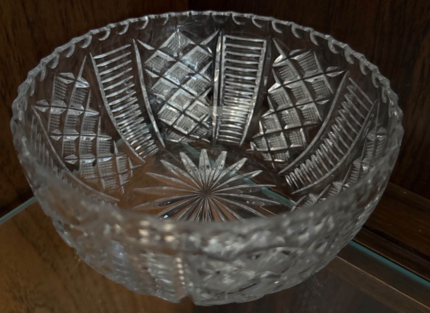 Collection featuring elegant glassware and one hand-painted porcelain plate. Includes a delicate pierced porcelain plate with a floral violet design and gold accents (approximately 8.5 inches in diameter). The glassware comprises cut glass bowls with intricate patterns, a set of salt and pepper shakers with clear cut-glass bases, an etched divided serving plate (approximately 8 inches in diameter), a textured cylindrical vase, and a glass bowl with trim details. Perfect for display, dining, or gifting.