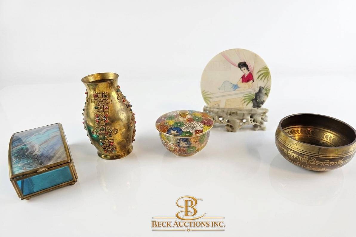 Decorative Items Featuring Vase, Bowl, Disc, Singing Bowl, and Music Box