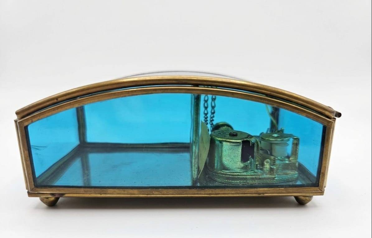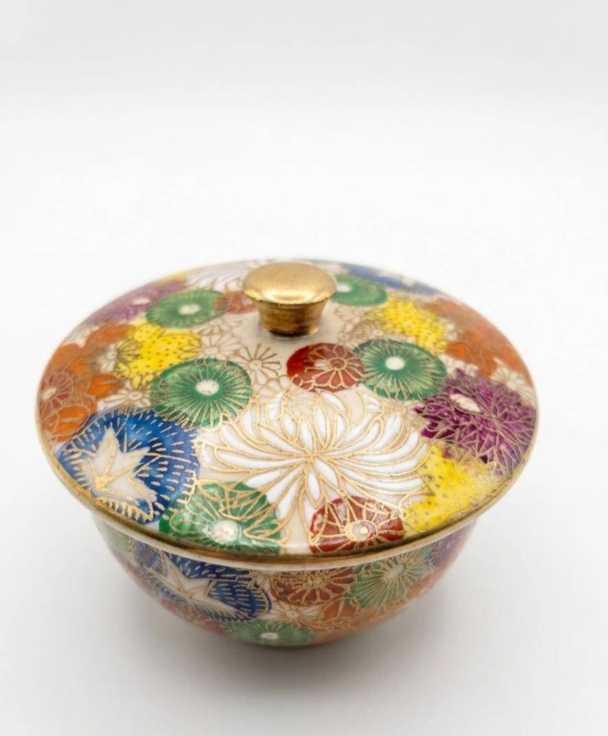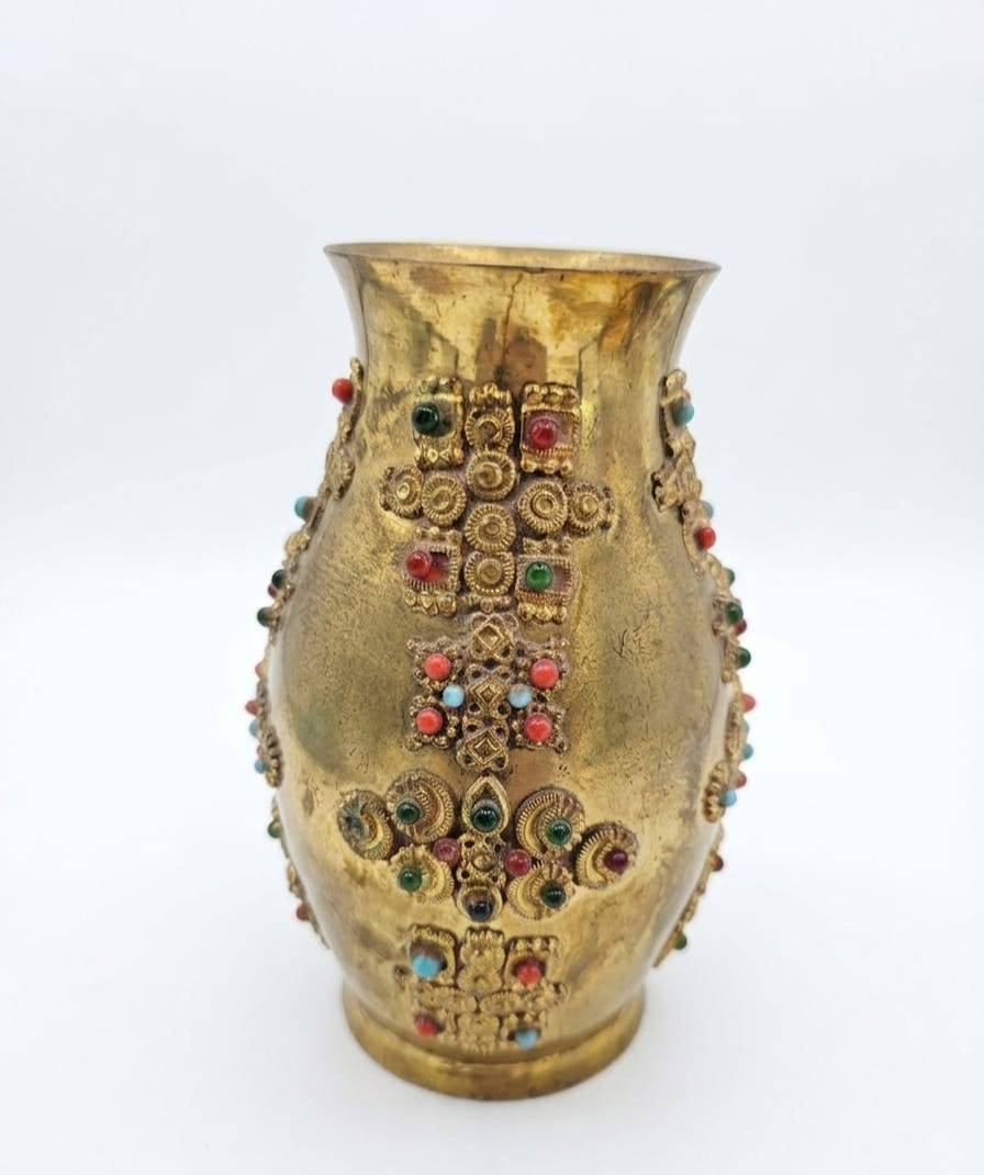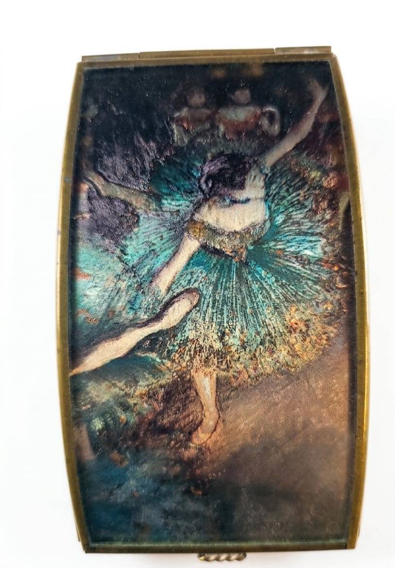 Impressive collection of decorative objects, including a gold-toned vase with colorful embellishments (approx. 10 in. tall), a lidded bowl adorned with vibrant floral motifs (approx. 4 in. diameter), a disc with a painted scene on a carved stone stand (approx. 6 in. diameter), a brass and bronze singing bowl with inscribed script (approx. 5 in. diameter), and a glass music box with a Degas ballet dancer design, gold-tone framework, and mirrored base. Stamped ‘Made in Mexico,’ measures approx. 4 x 6 x 3 in.