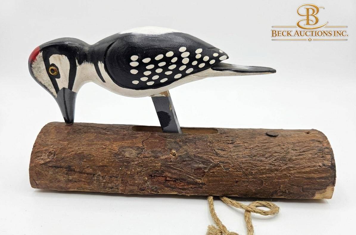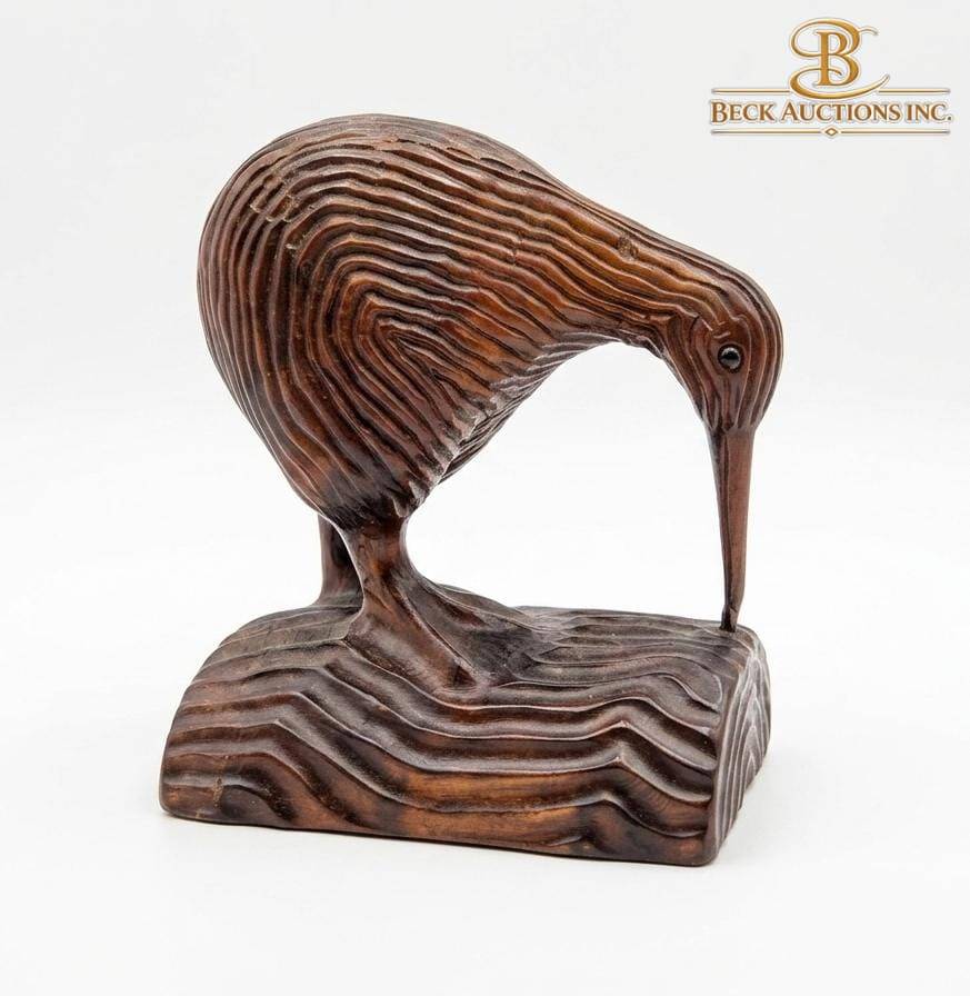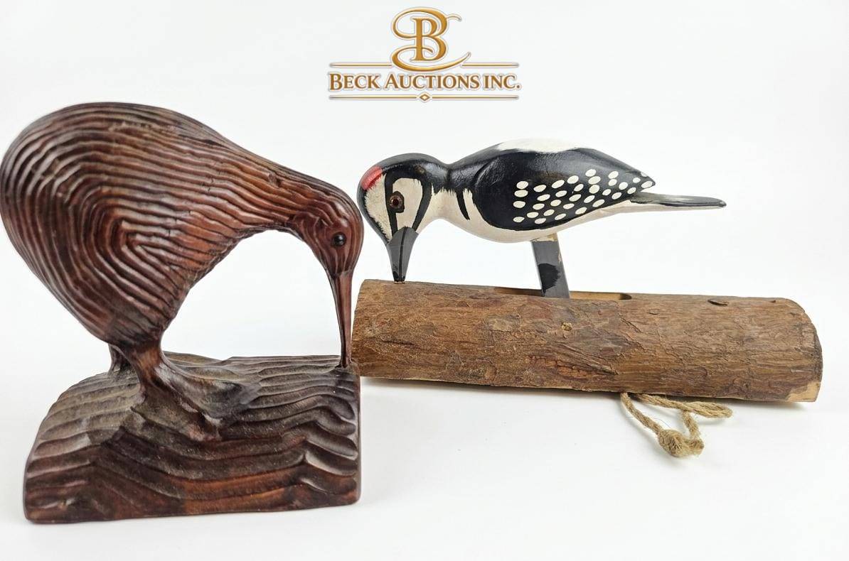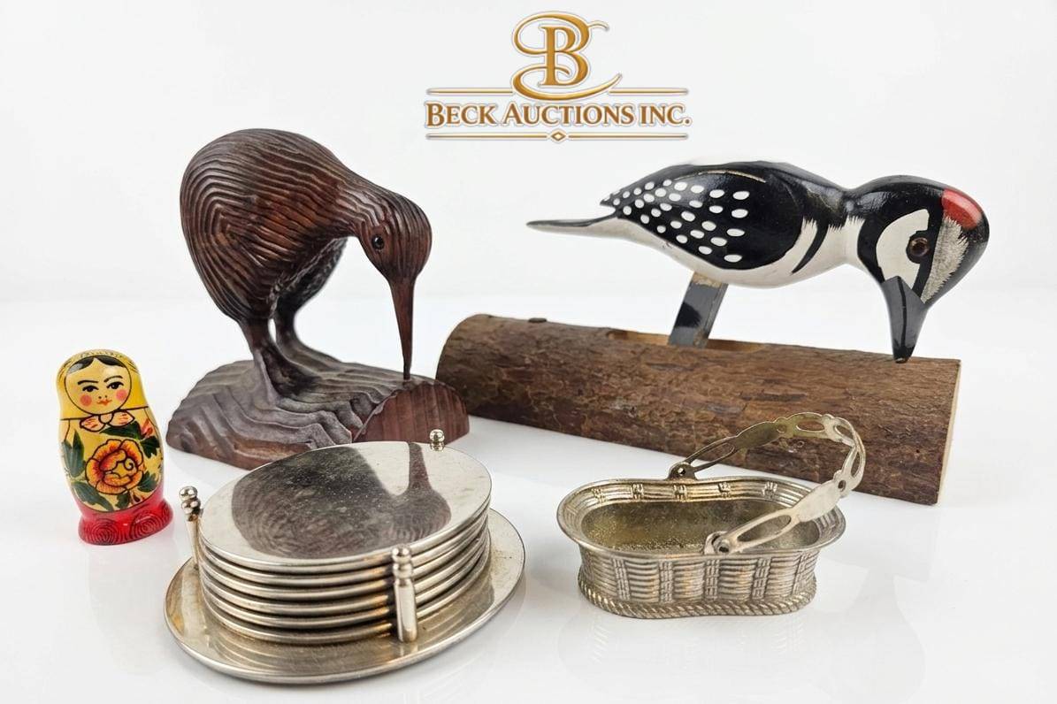 This curated collection features an intriguing mix of decorative items: a wooden kiwi bird figurine (approx. 6 inches long), a wooden woodpecker on a stand (approx. 7 inches tall), a small nesting doll (2 inches tall), and a set of circular silver-tone coasters (3 inches diameter) with a holder. Additionally, the lot includes a silver-plated round medallion and an ornate silver bracelet. This assortment is ideal for collectors or decorative enthusiasts.