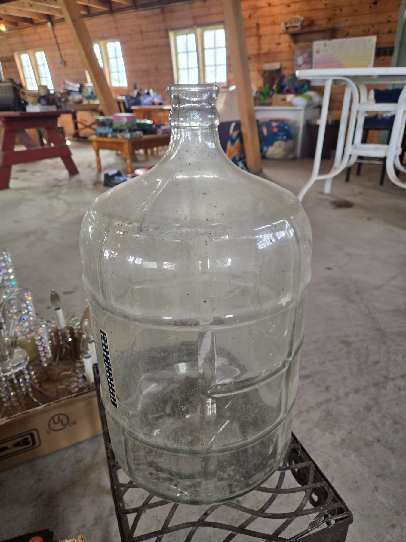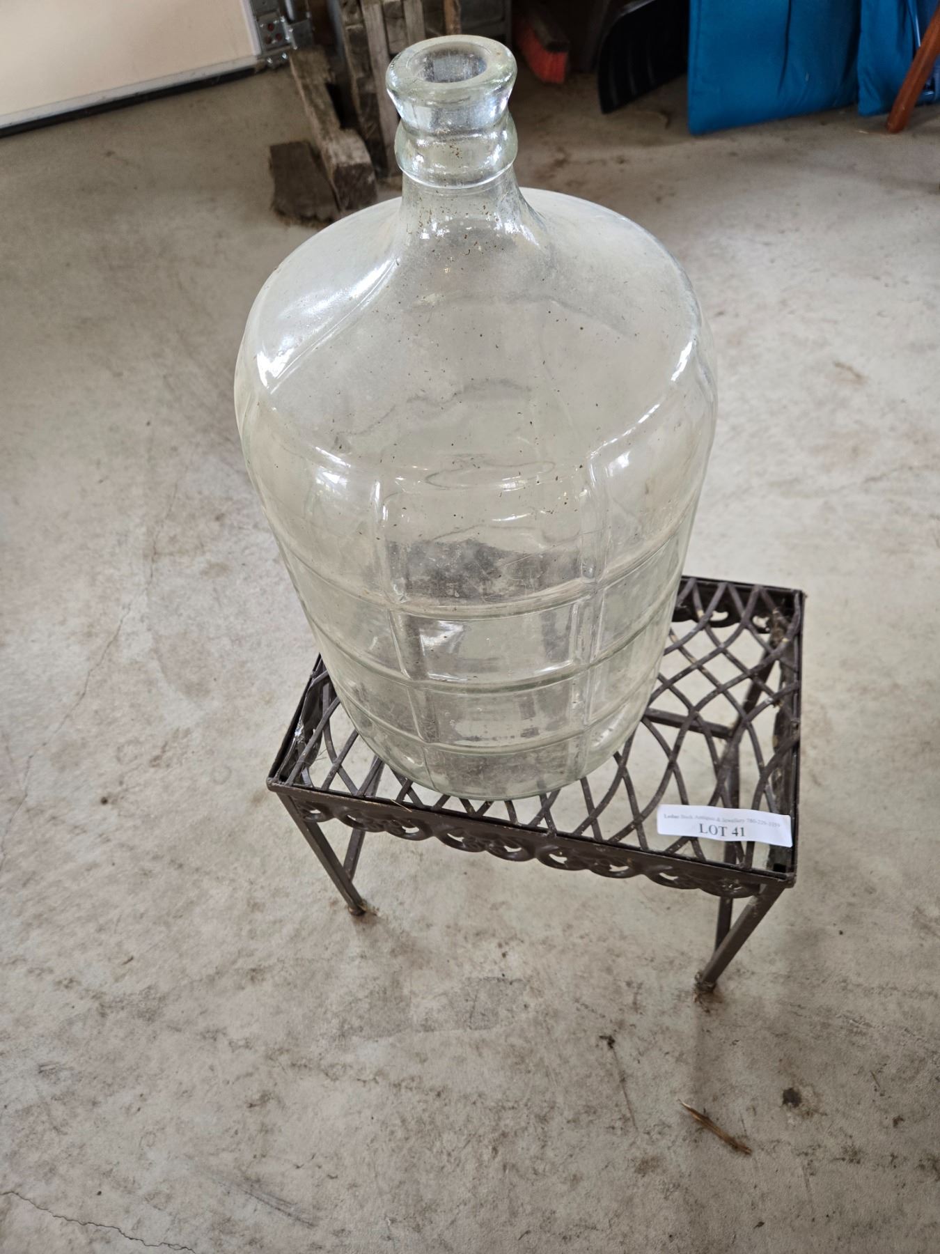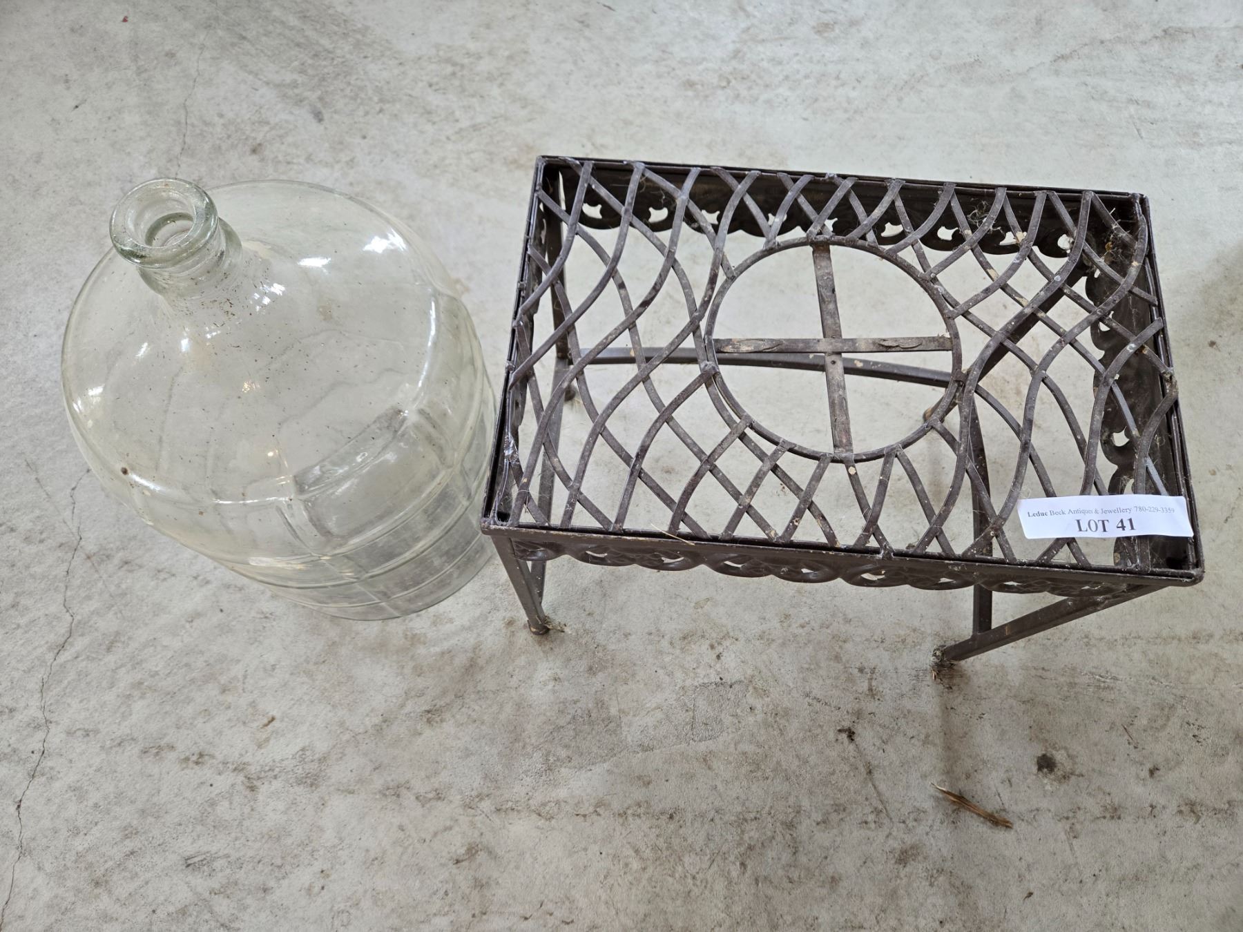 Decorative Metal Plant Stand & Lg Glass Bottle. Stand 17 w, 15 h, 11 d. Bottle 7 dia18 1/2 h