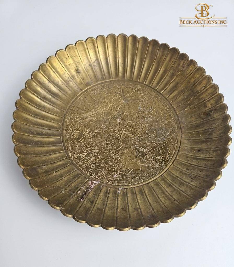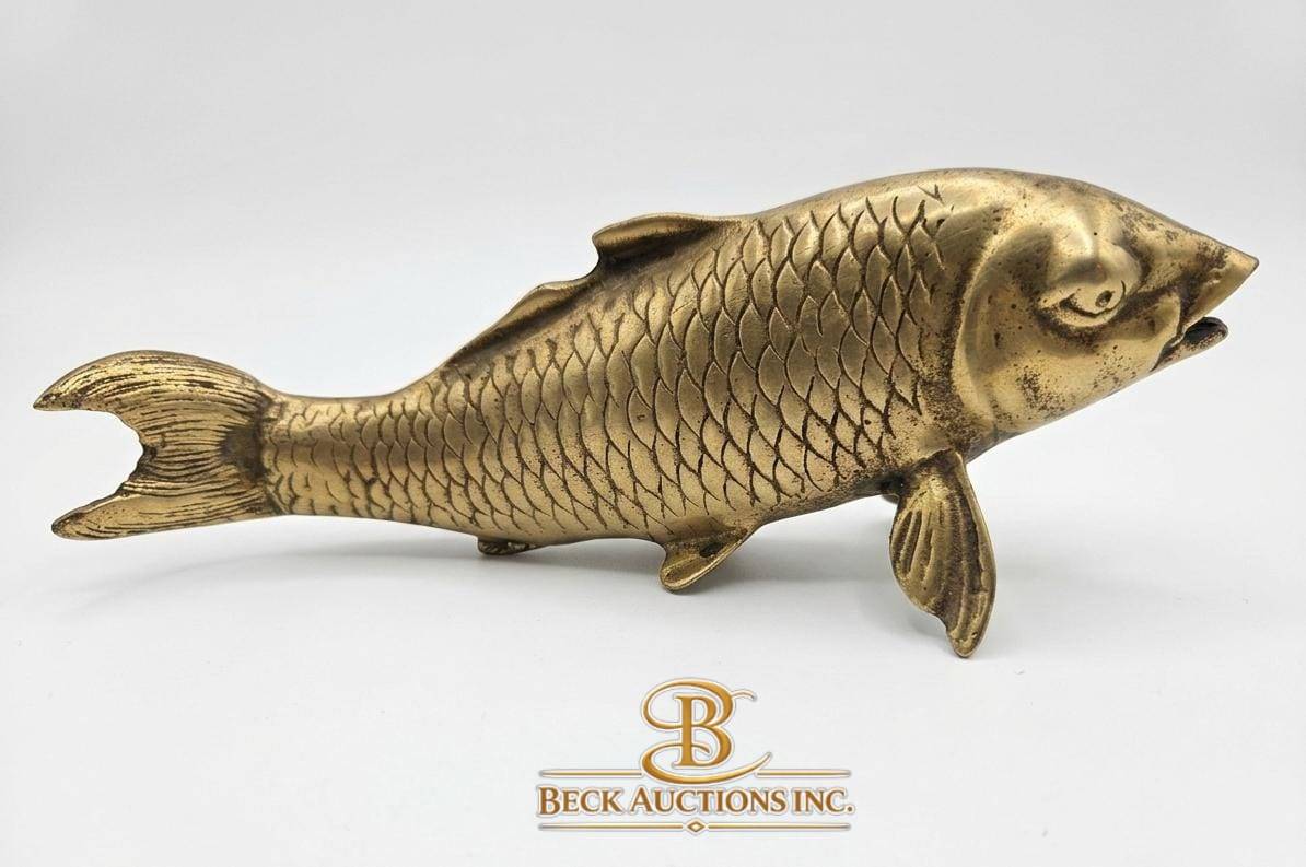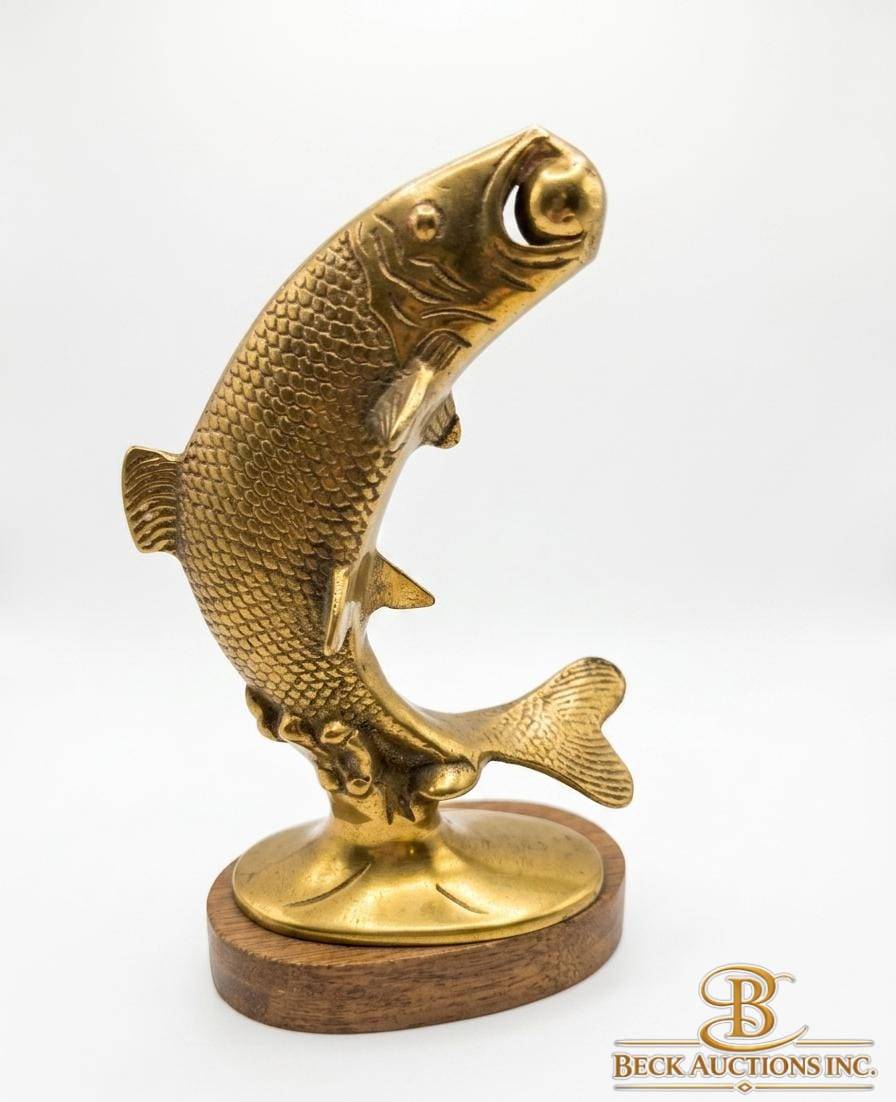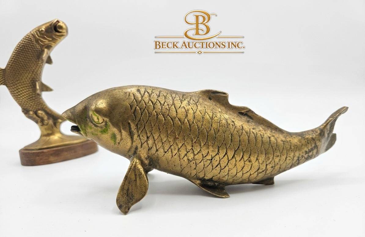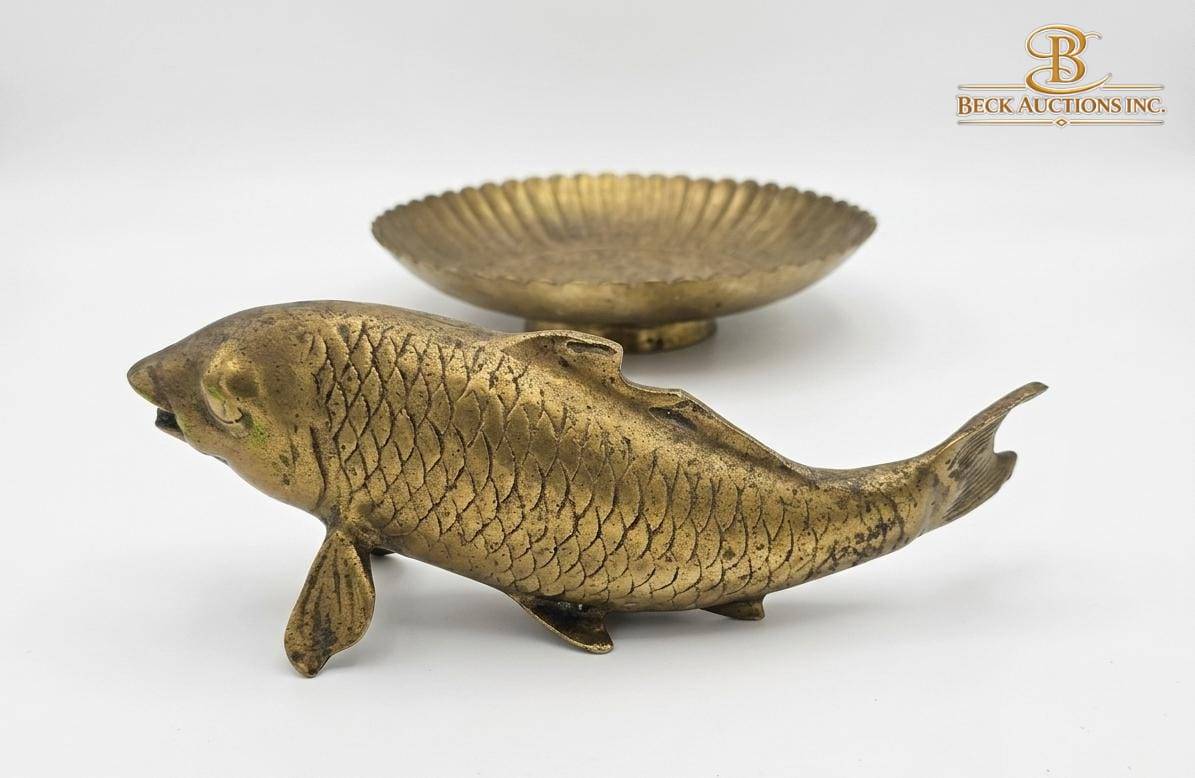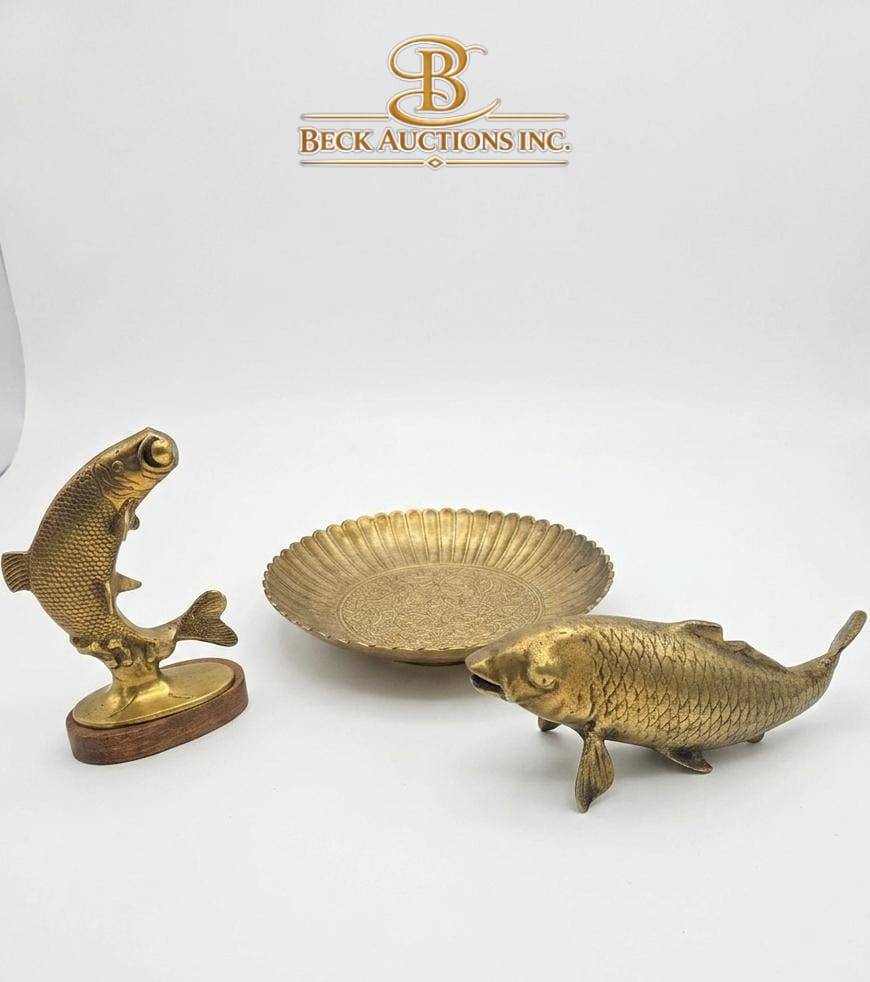 This captivating set includes a textured brass plate measuring 10 inches in width, complemented by two brass fish sculptures. One fish is mounted on a wood stand, reaching a total height of 7 inches, while the other fish stands 10 inches tall. Together, these items offer a striking blend of craftsmanship and design, perfect for display or collection. The combination highlights an attention to detail and coordination among the elements.