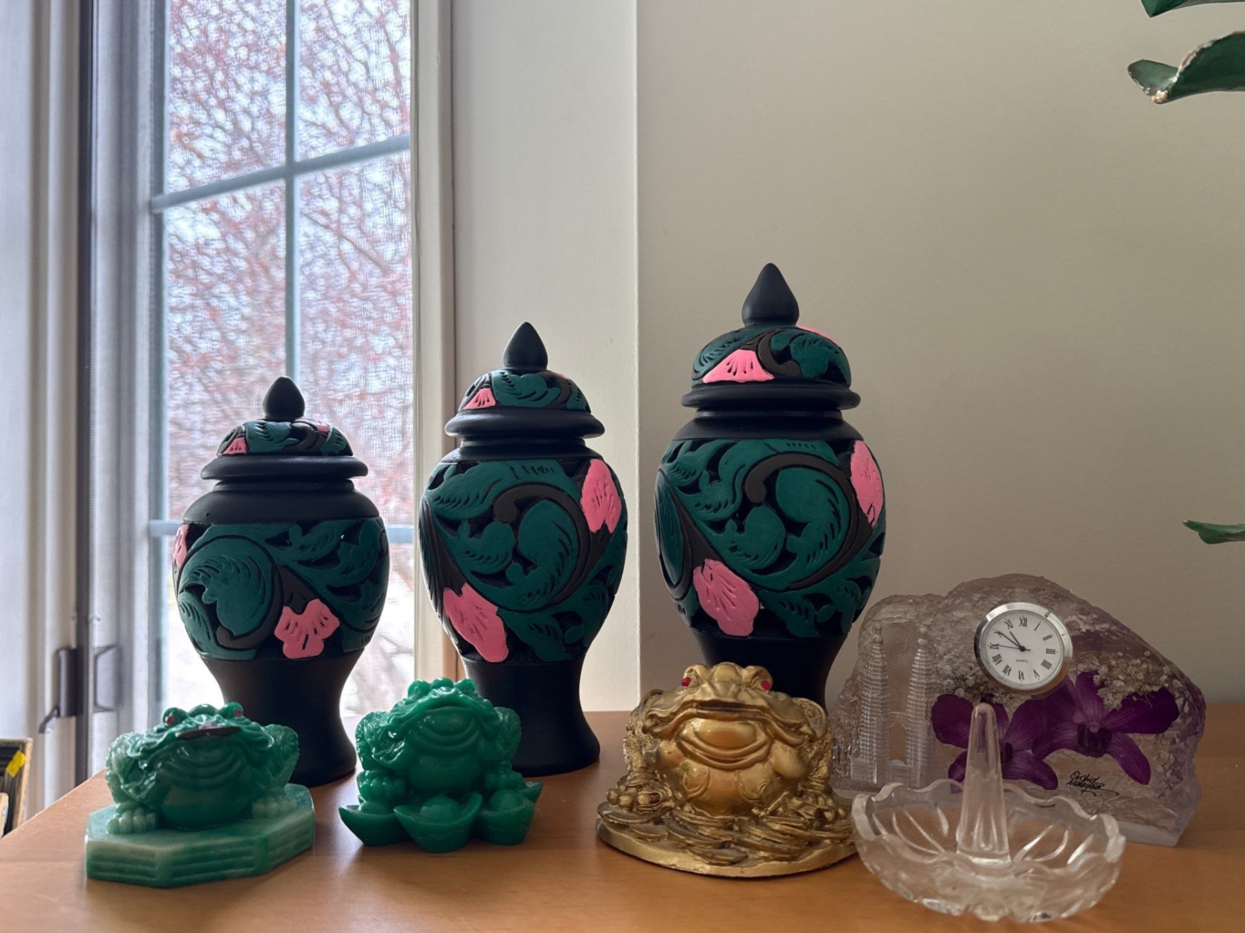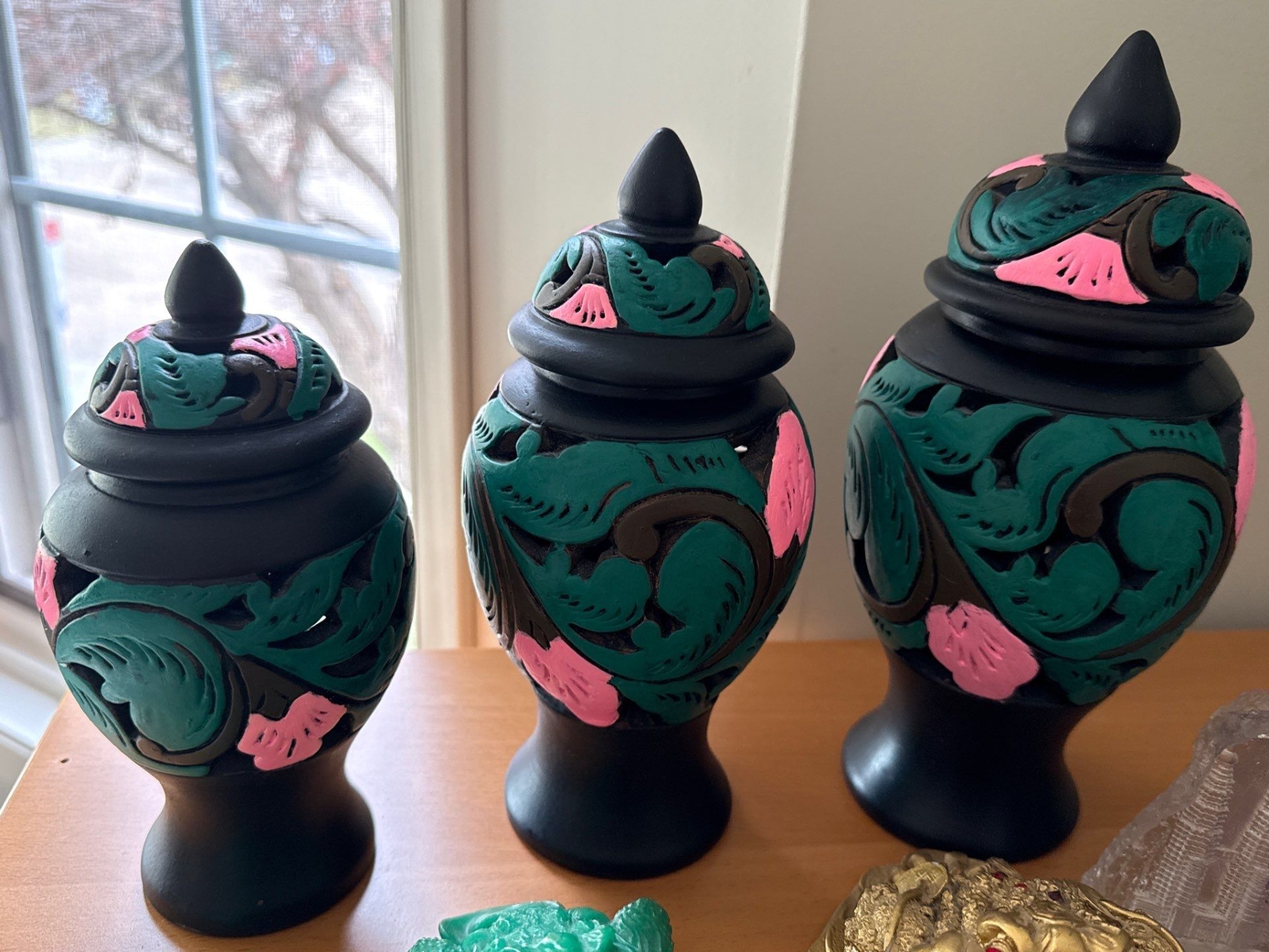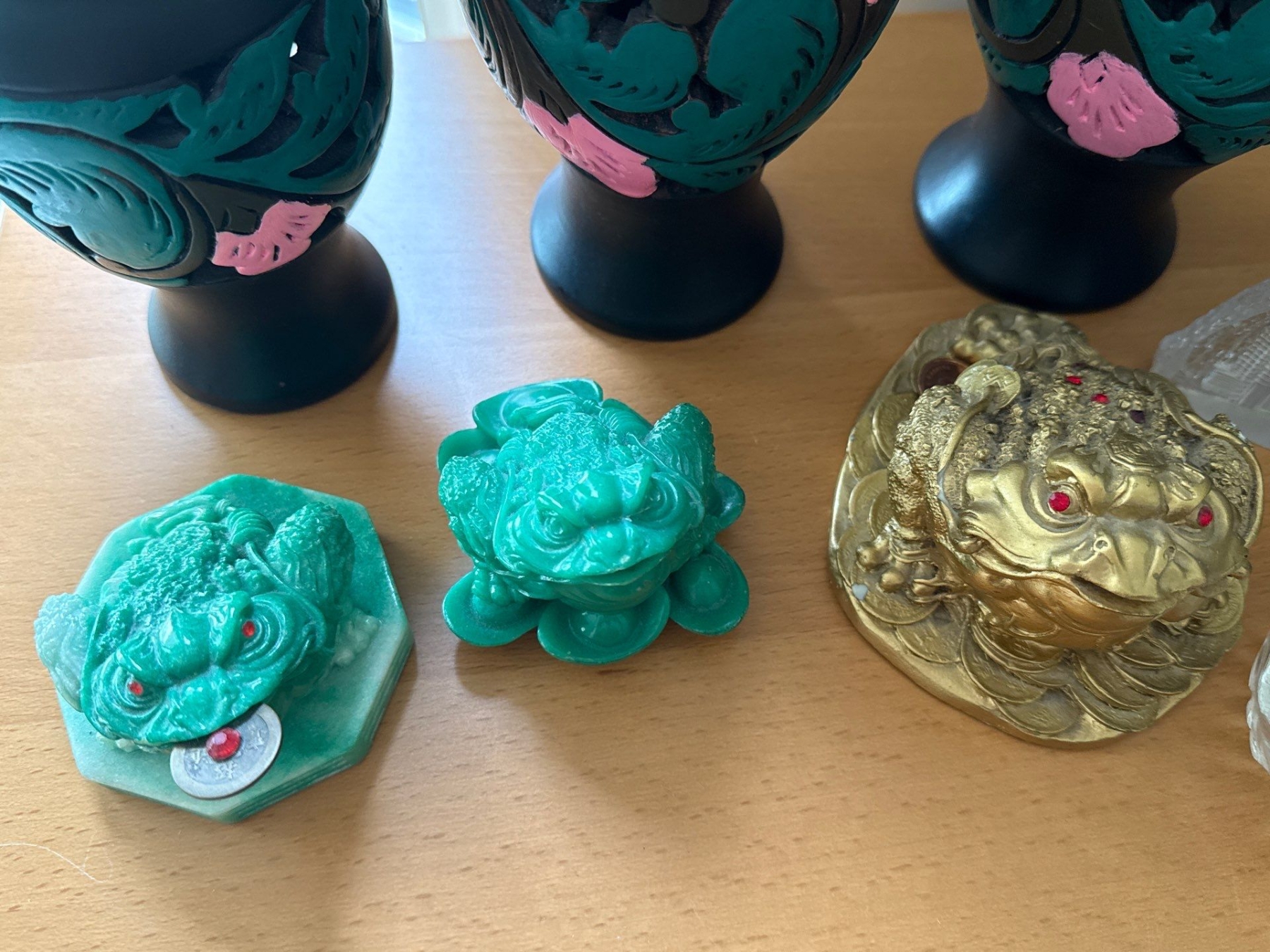 Decorative Vase Collection From Indonesia Set of 3, Largest 9T, w/ Chinese Money Frogs, More
