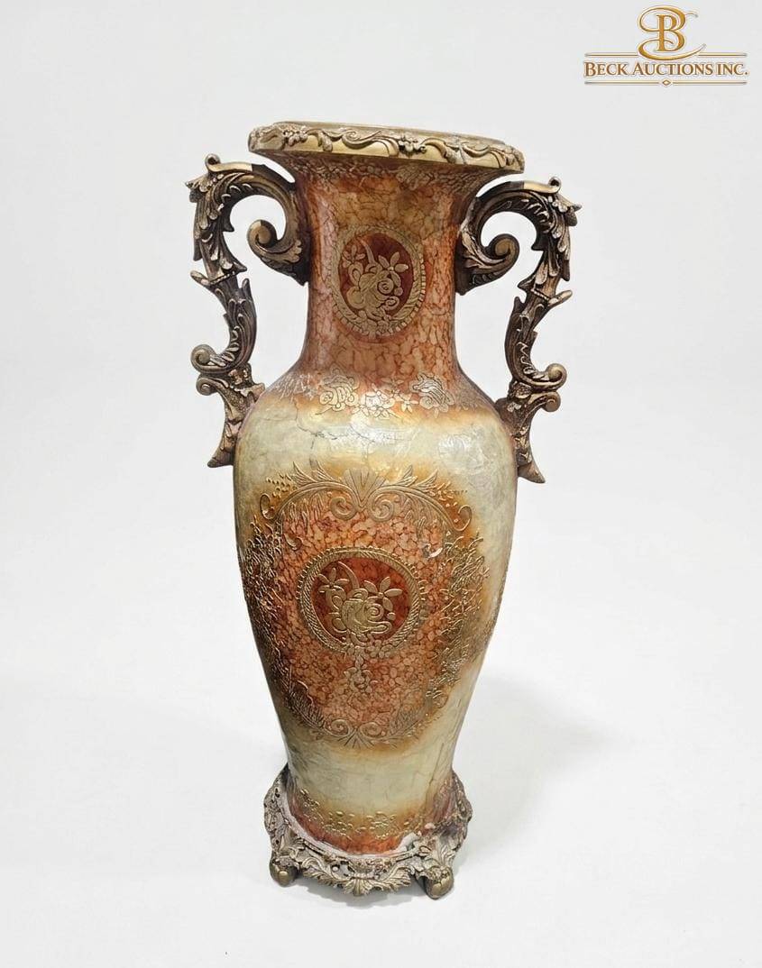 This elegantly designed decorative vase measures an impressive 40 inches in height. Its unique features include intricate embossed patterns on the body, ornate handles, and an intricately crafted metallic base. The vase exhibits subtle age wear, contributing to its character and charm. Ideal for display, it boasts exceptional craftsmanship and a commanding presence.