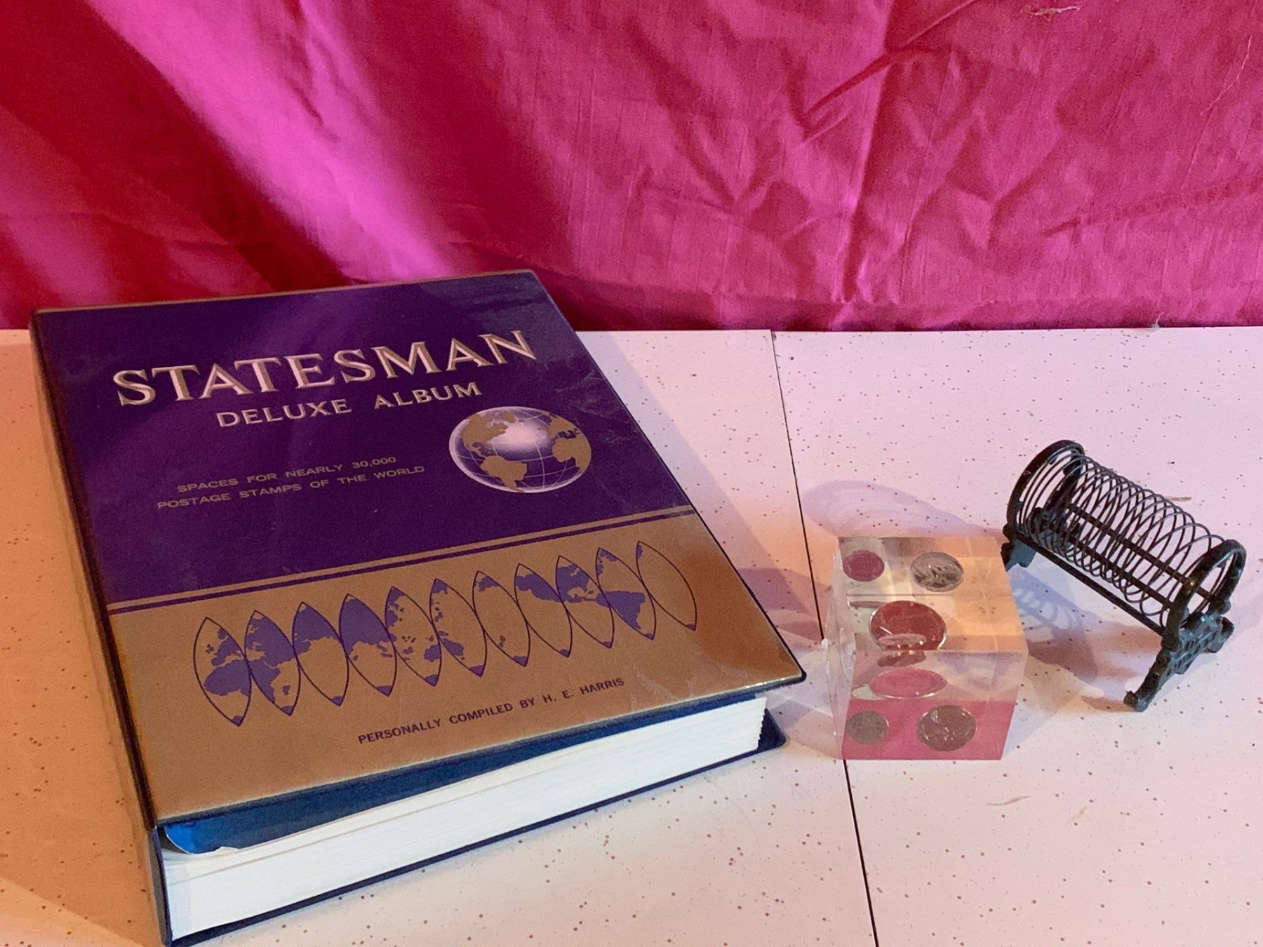 Deluxe Album of Stamps from Across the Country, A Money Paper Weight and Vintage Cast Iron Desk Organizer