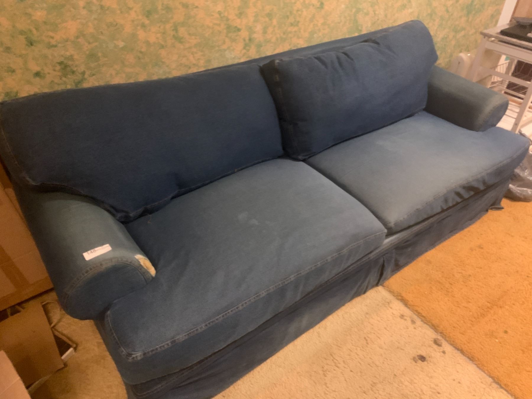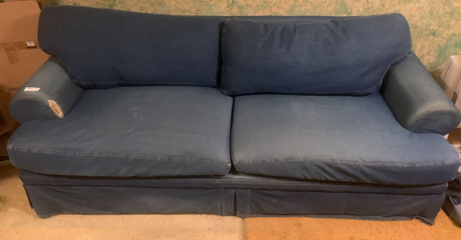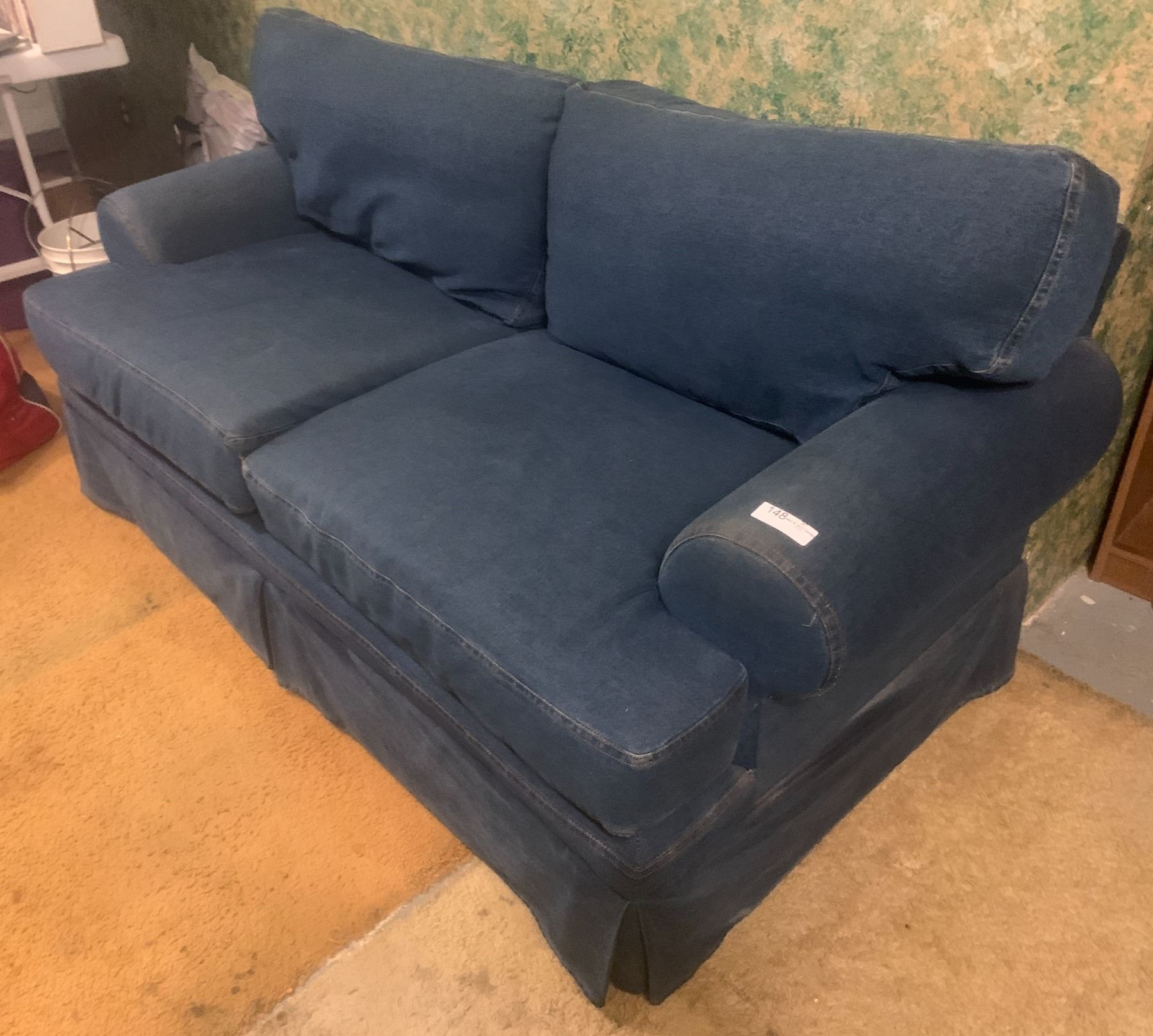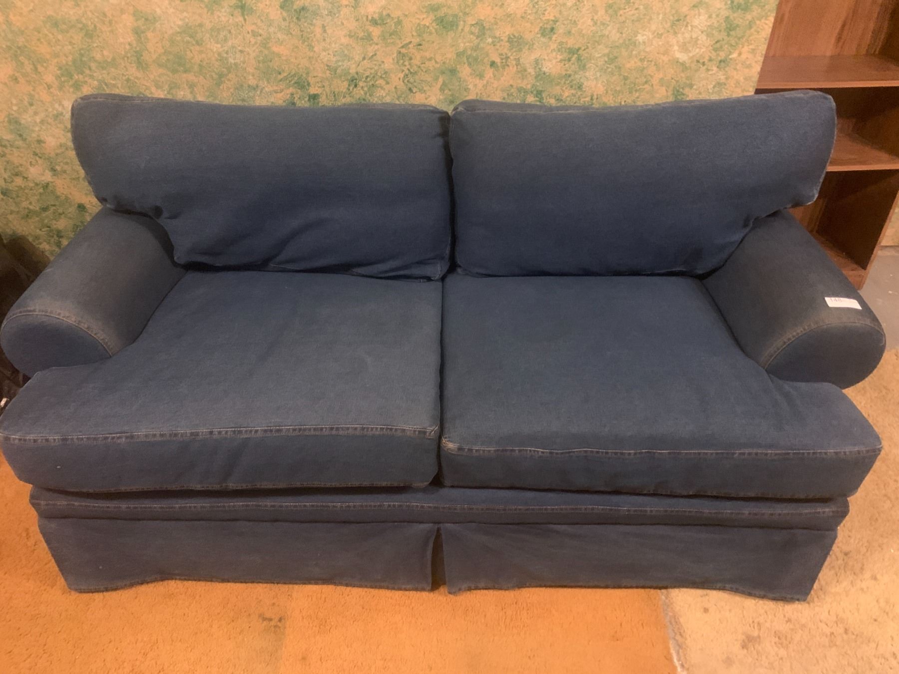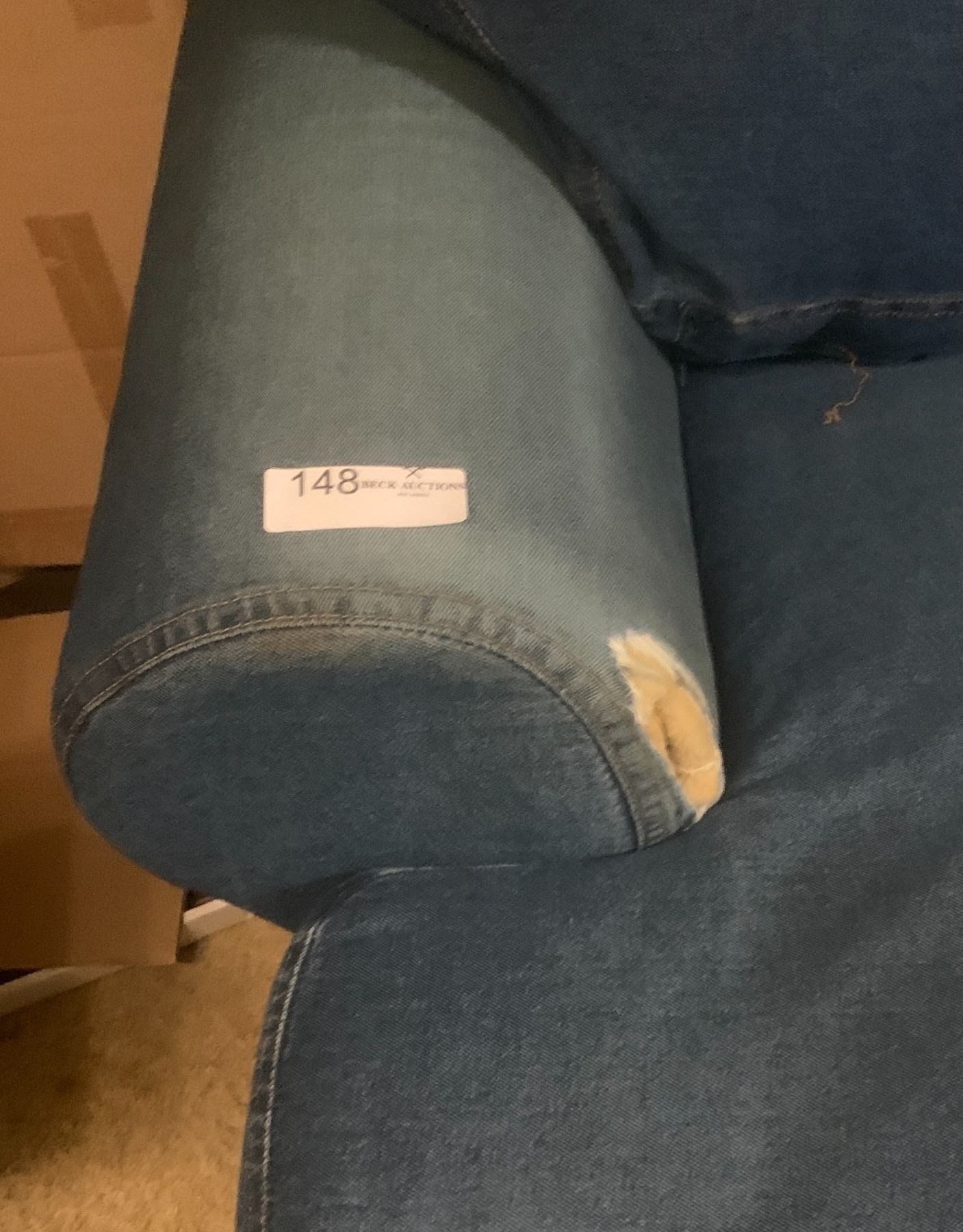 Denim-Upholstered Lovesest (65" x 35" x 28") and Sofa (80" x 35" x 28"), One Tear