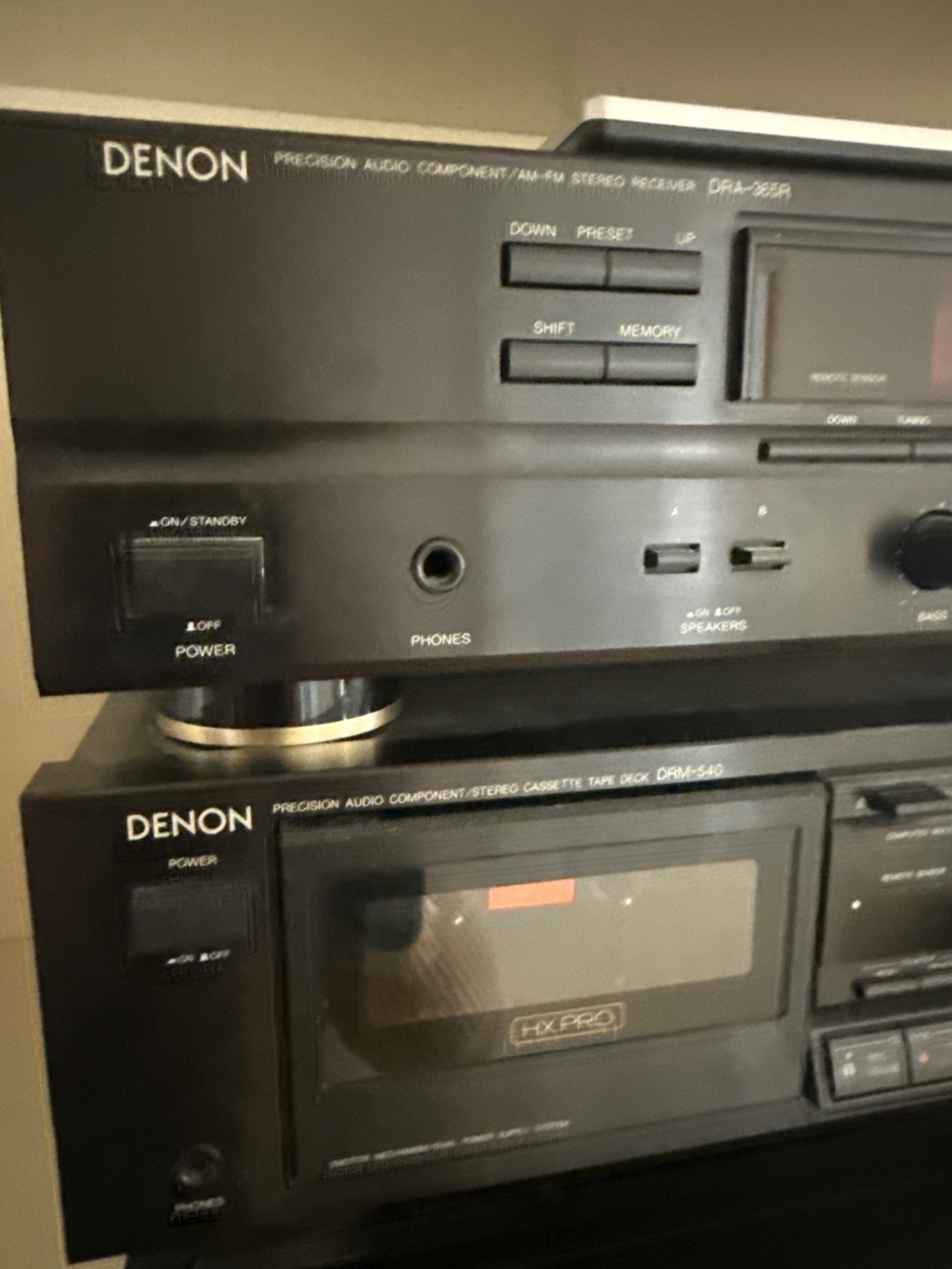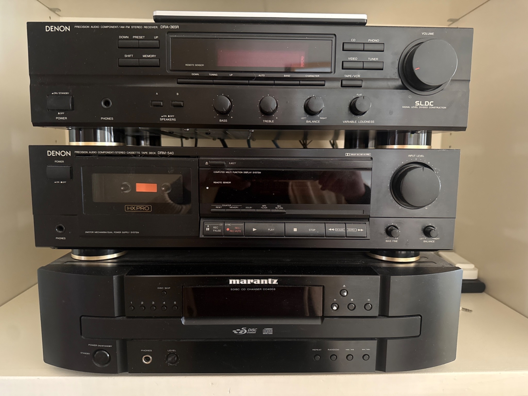 A bundle featuring a Denon DRA-25R stereo receiver, a Denon DRM-550 cassette deck, and a Marantz CC4003 5-disc CD changer. The receiver offers clean sound with memory presets, while the cassette deck supports high-quality HX Pro recordings. The CD changer allows convenient, multi-disc playback. Items show signs of use consistent with age but are functional.