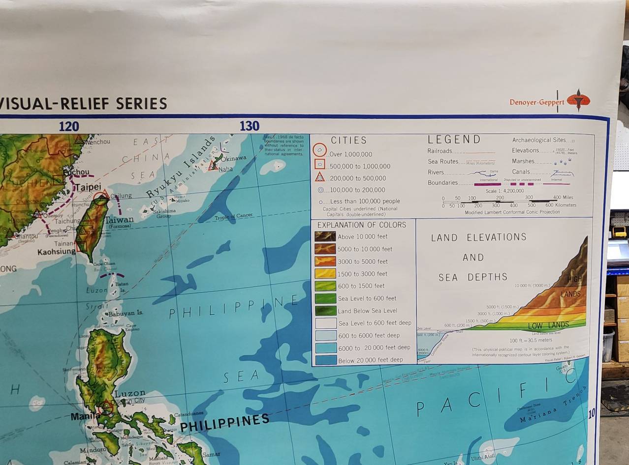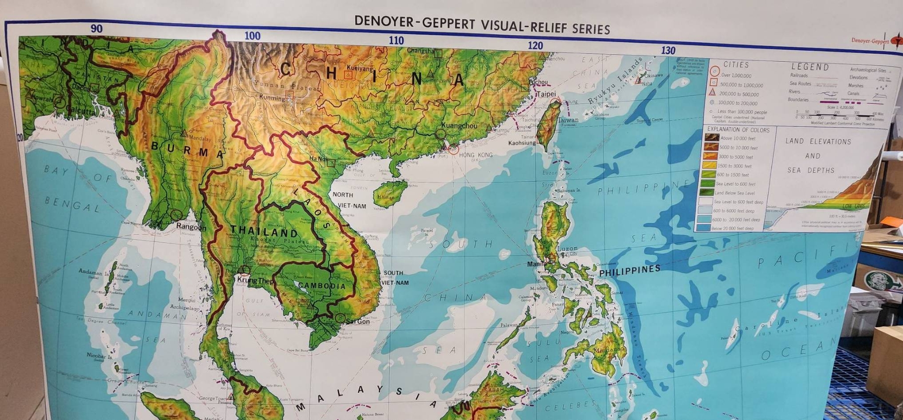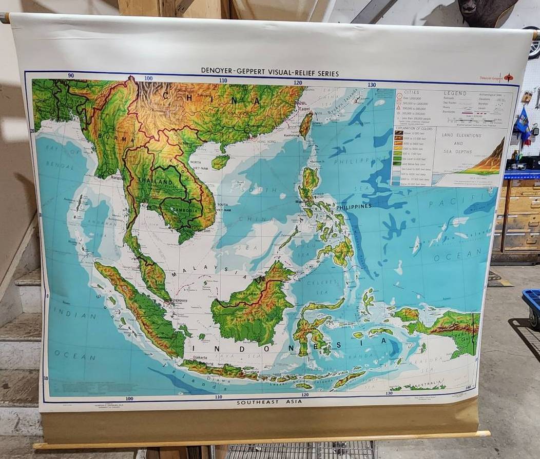 Denoyer-Geppert Visual-Relief Series roll-down map depicting Southeast Asia, copyright by Denoyer-Geppert Co., Chicago. | | | Designed for educational use, this map includes rich topographical details with dimensions of approximately 50 inches wide and 45 inches tall. | | | Mounted on wooden dowels for stability and easy display, it features regions such as China, the Philippines, and Australia. | Ideal for collectors or educational purposes.