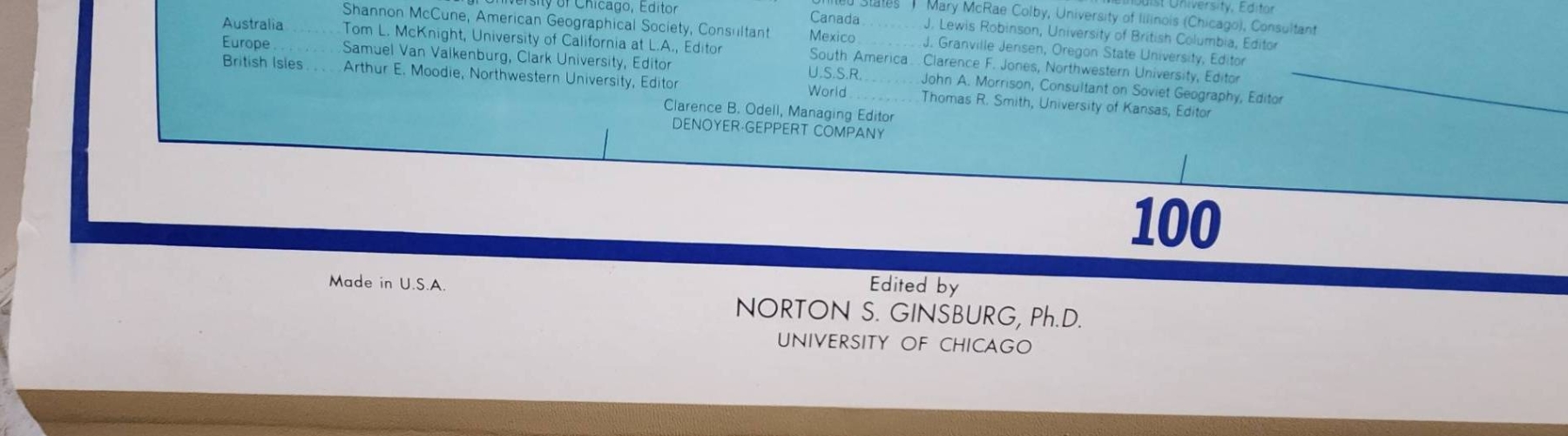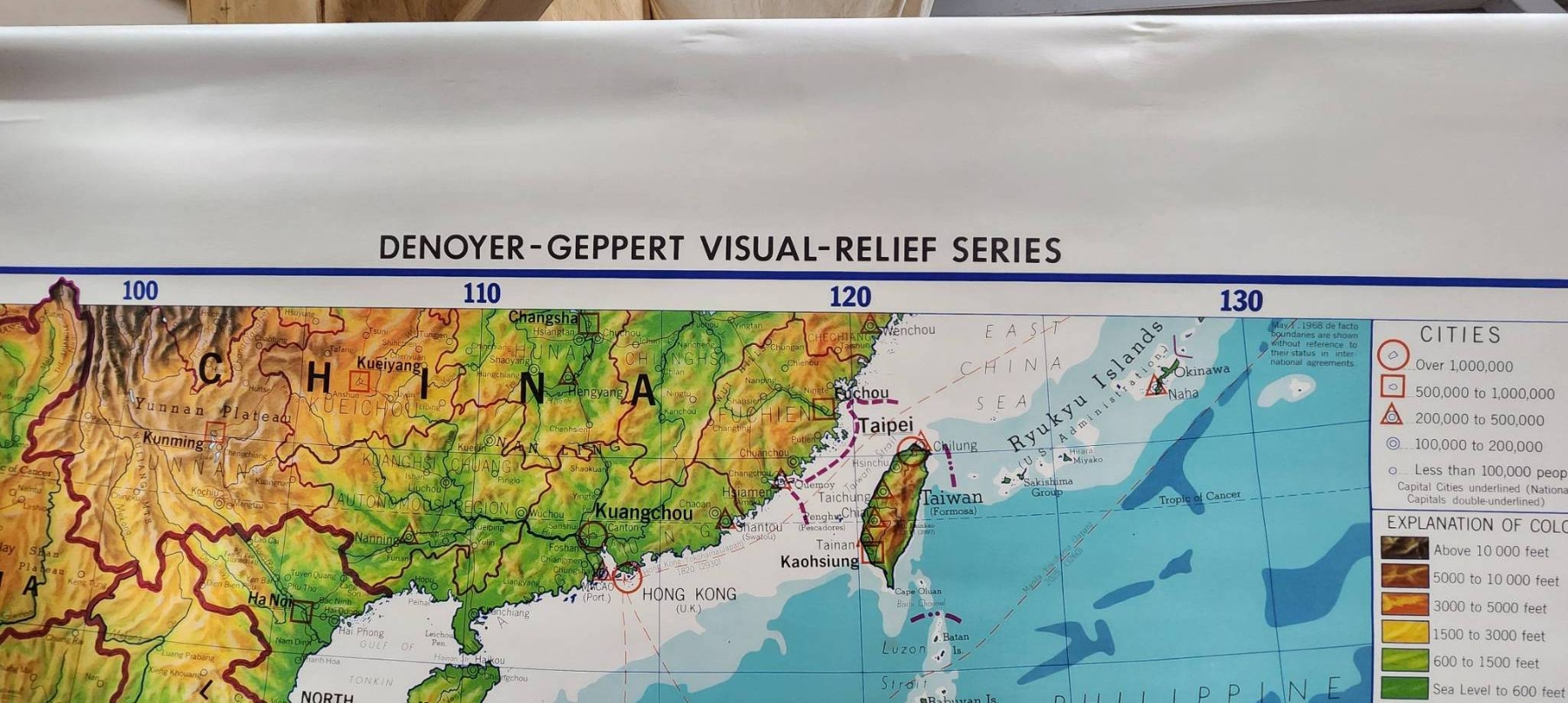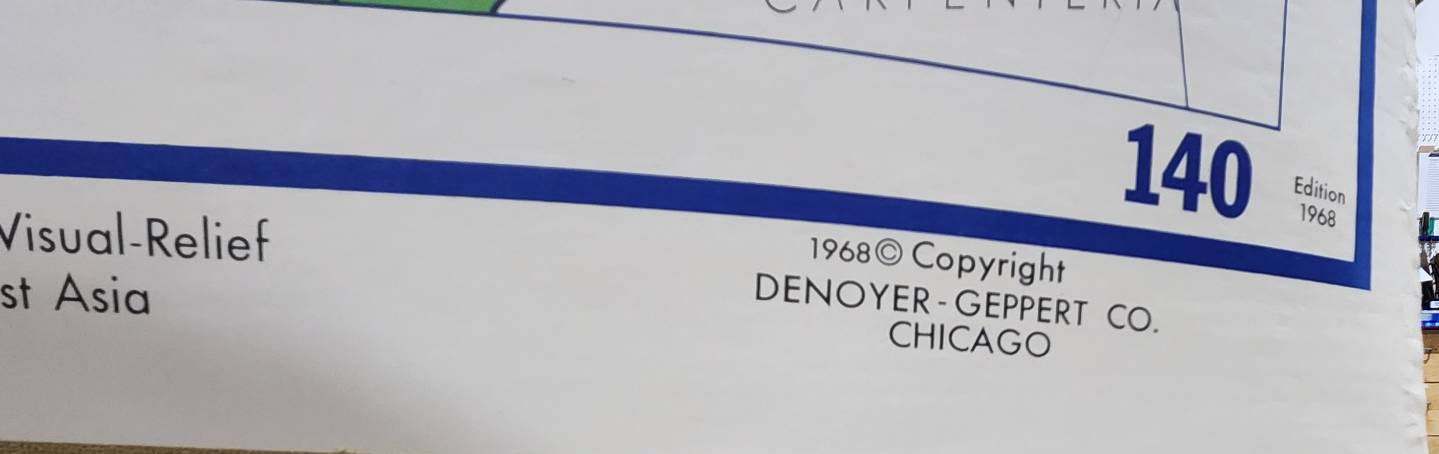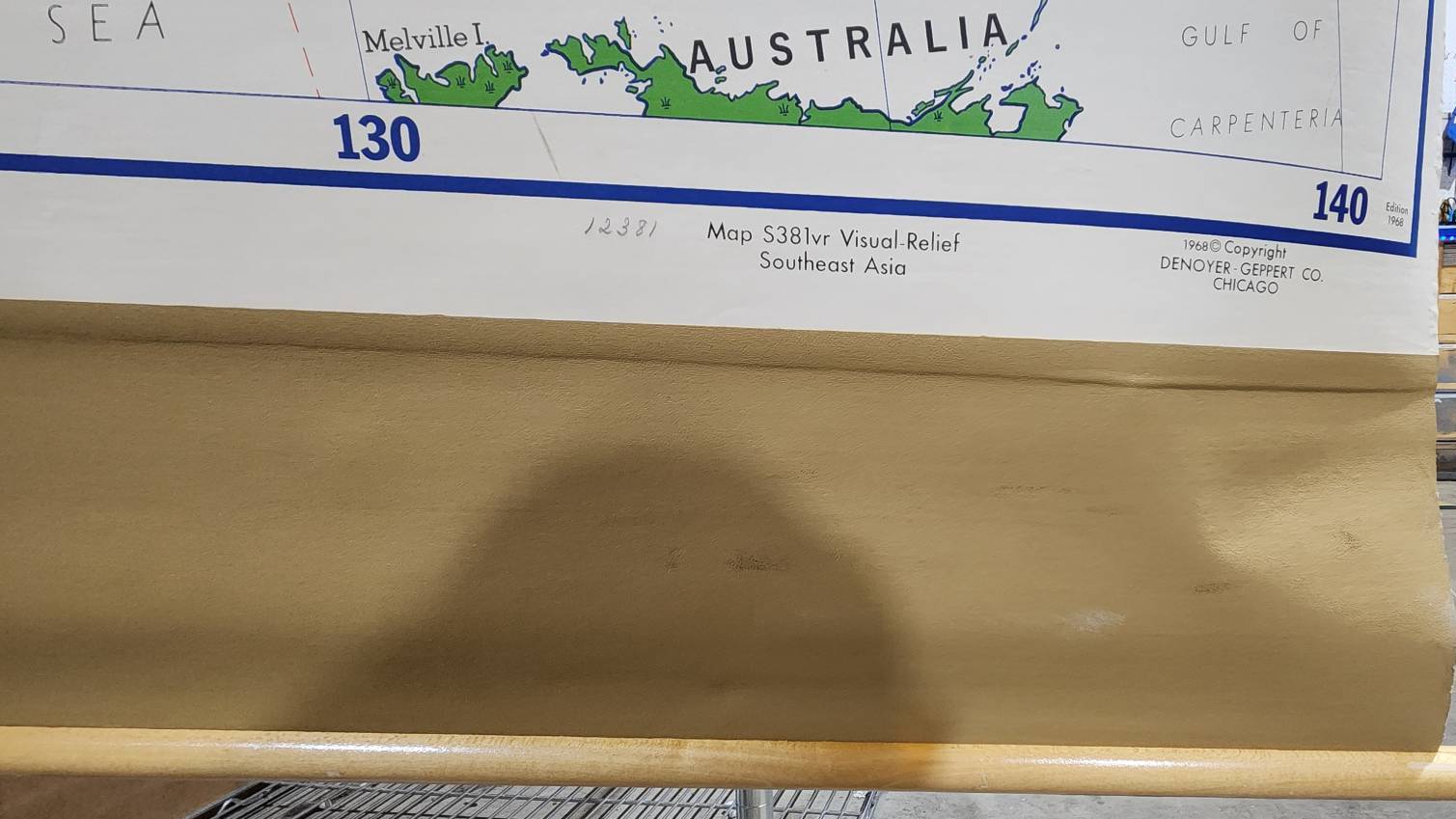 Denoyer-Geppert Visual-Relief Series roll-down map depicting Southeast Asia, copyright by Denoyer-Geppert Co., Chicago. | | | Designed for educational use, this map includes rich topographical details with dimensions of approximately 50 inches wide and 45 inches tall. | | | Mounted on wooden dowels for stability and easy display, it features regions such as China, the Philippines, and Australia. | Ideal for collectors or educational purposes.