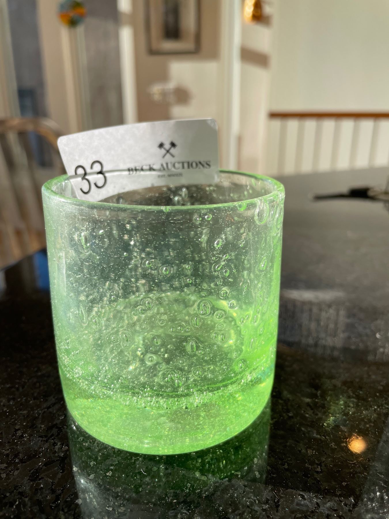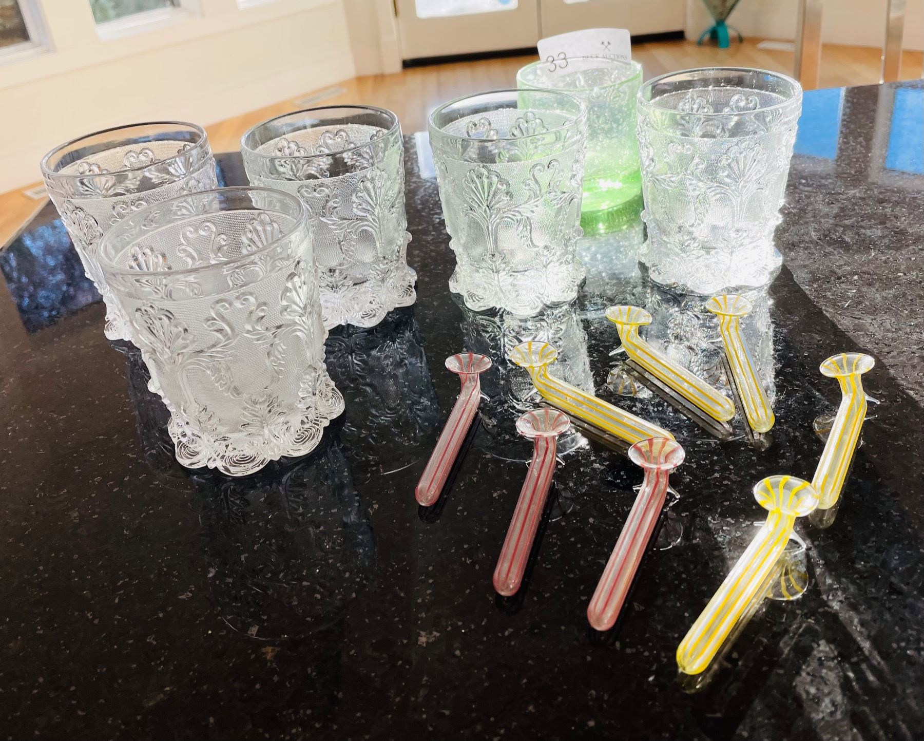 Stunning detailed glassware with swirled bases (three not shown in photos), lot includes 8 x blown glass little tubes, perhaps for single stem flowers at the dinner table? Lot also includes one recycled glass cup. No chips or cracks.