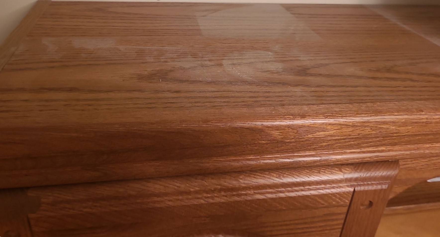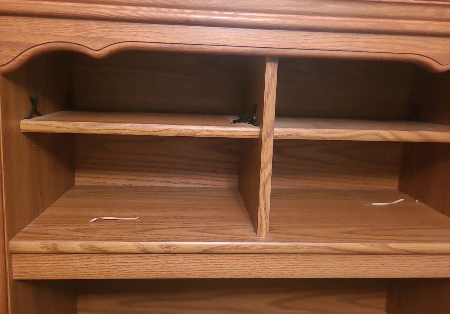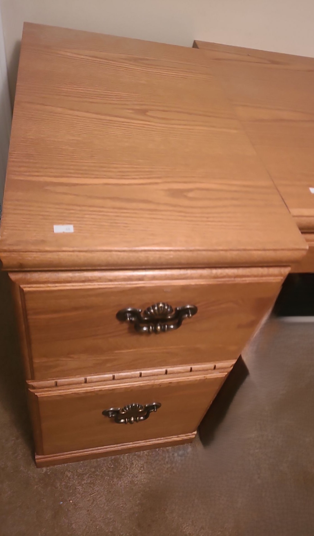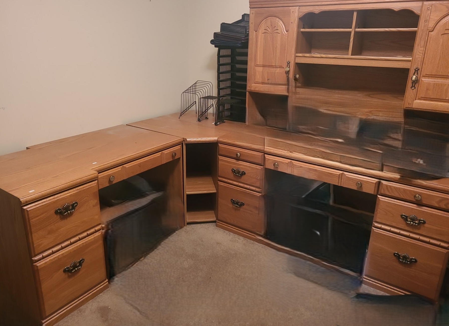 Desk Pieces Can Be Split/ 4 Sections/ Regrouped as Required, Some Scuffs and Scratches, Some Contents Blurred/ NOT Included, Bring Assistance to Move