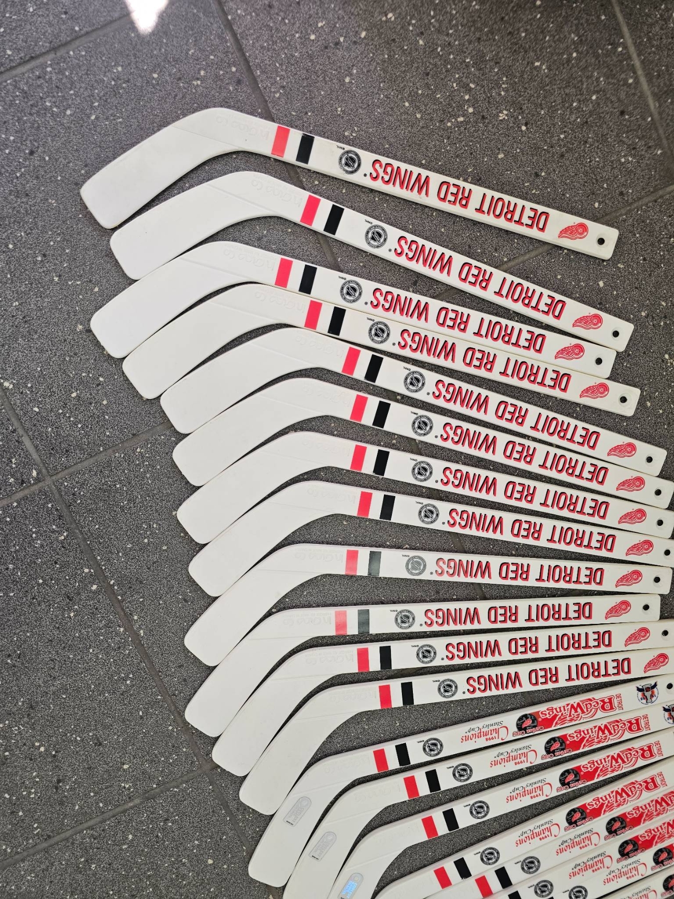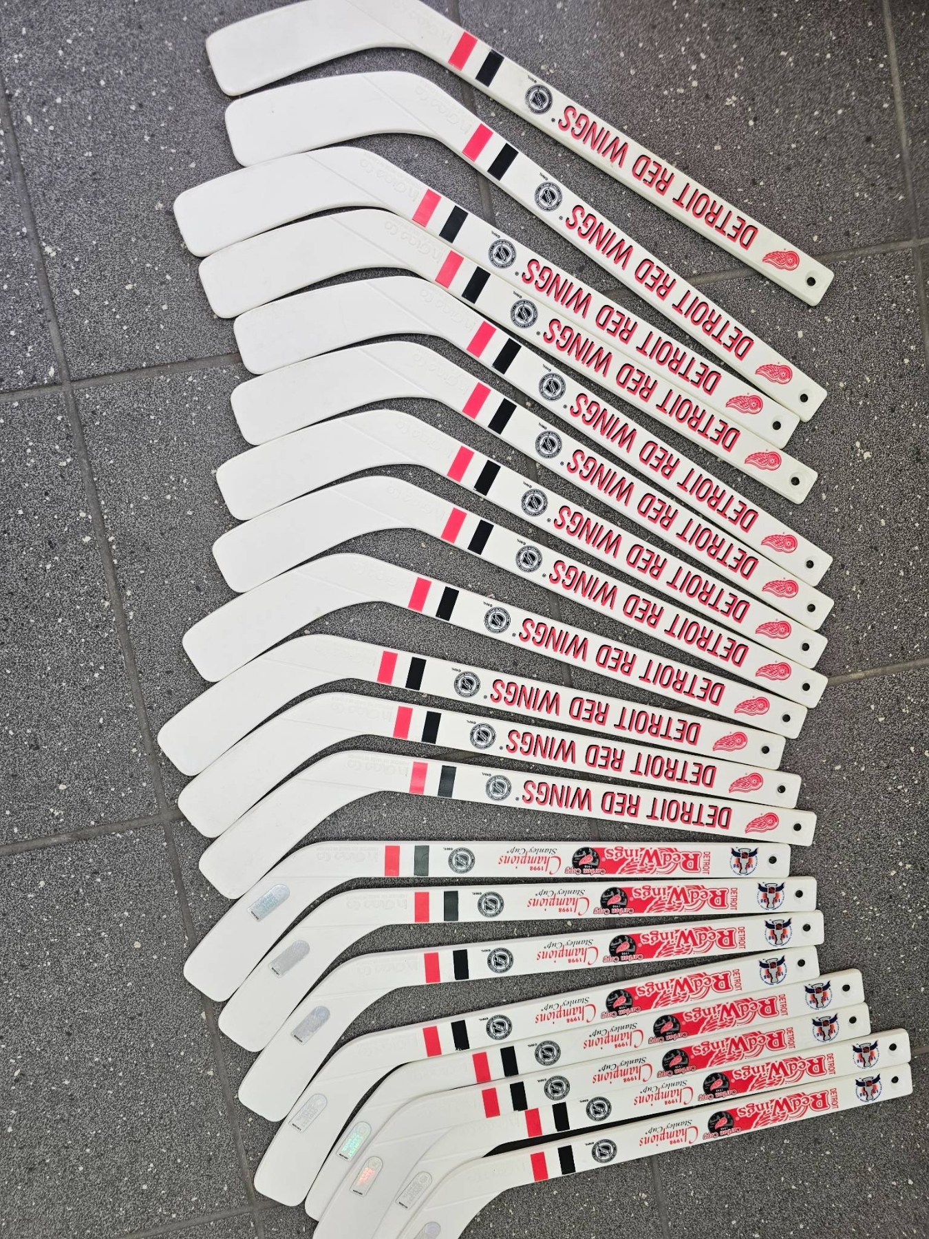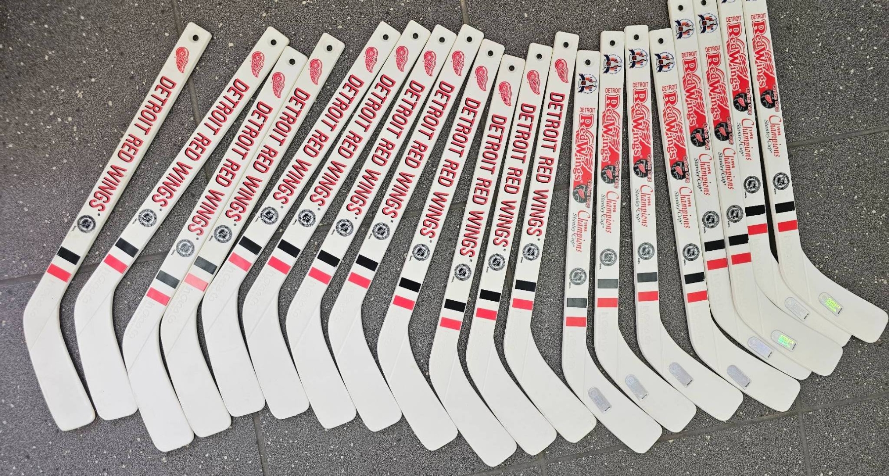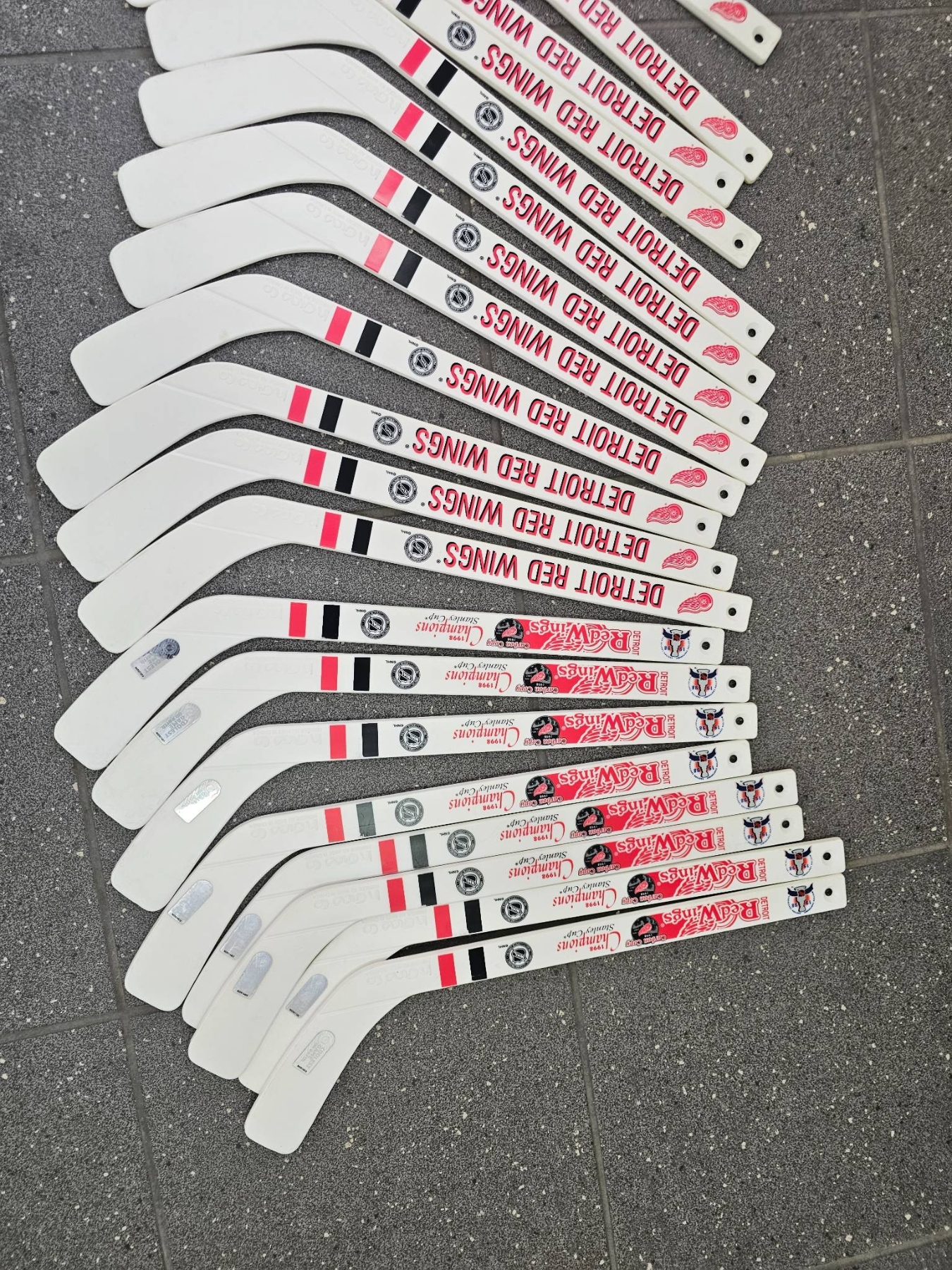 Mini hockey sticks featuring the Detroit Red Wings branding. Each stick displays the team's logo and colors, with bold "Detroit Red Wings" text on the blade. Suitable for collection or other purposes. The quantity appears to be approximately 20 sticks. Condition is not specified but seems uniform.