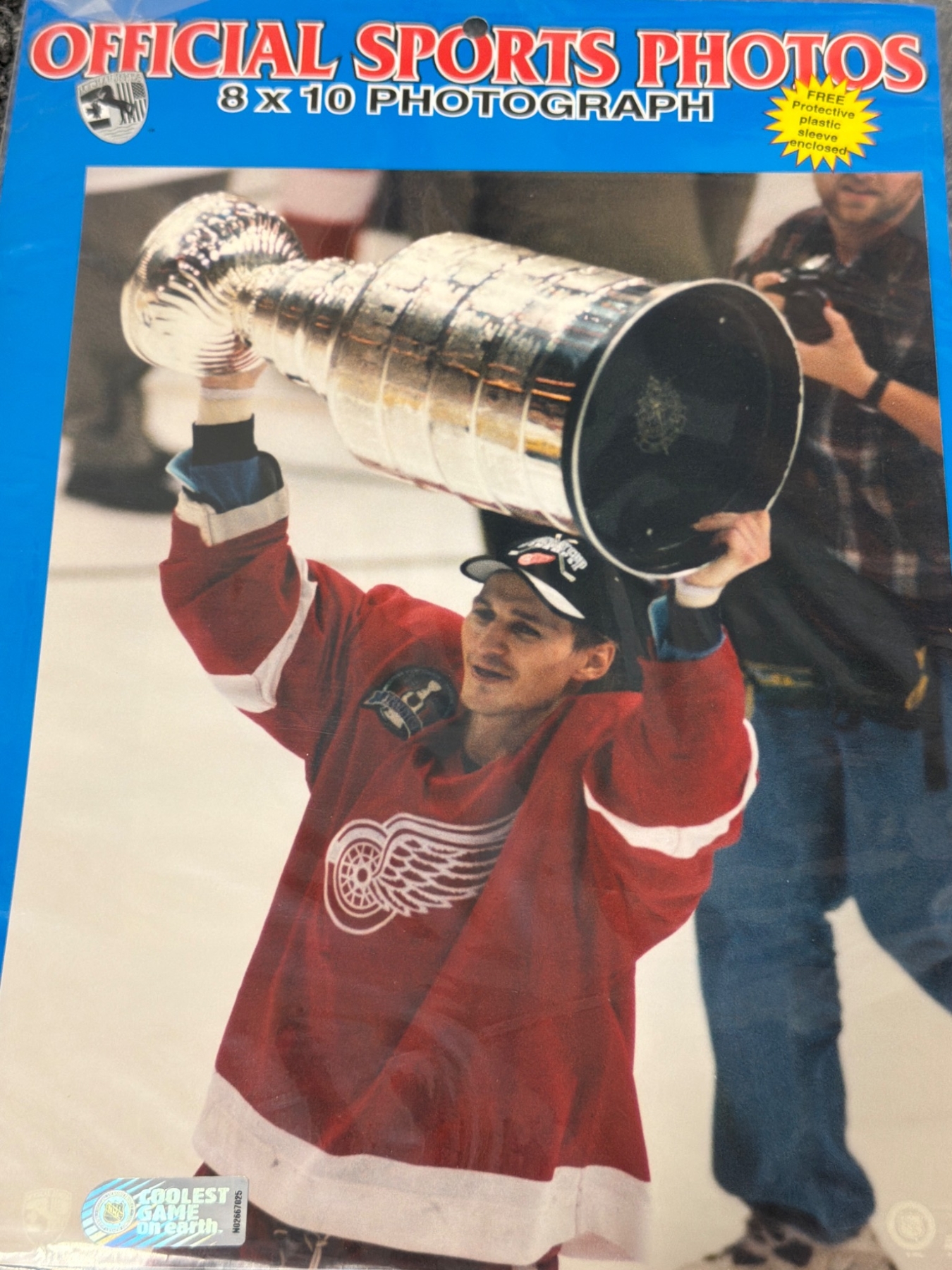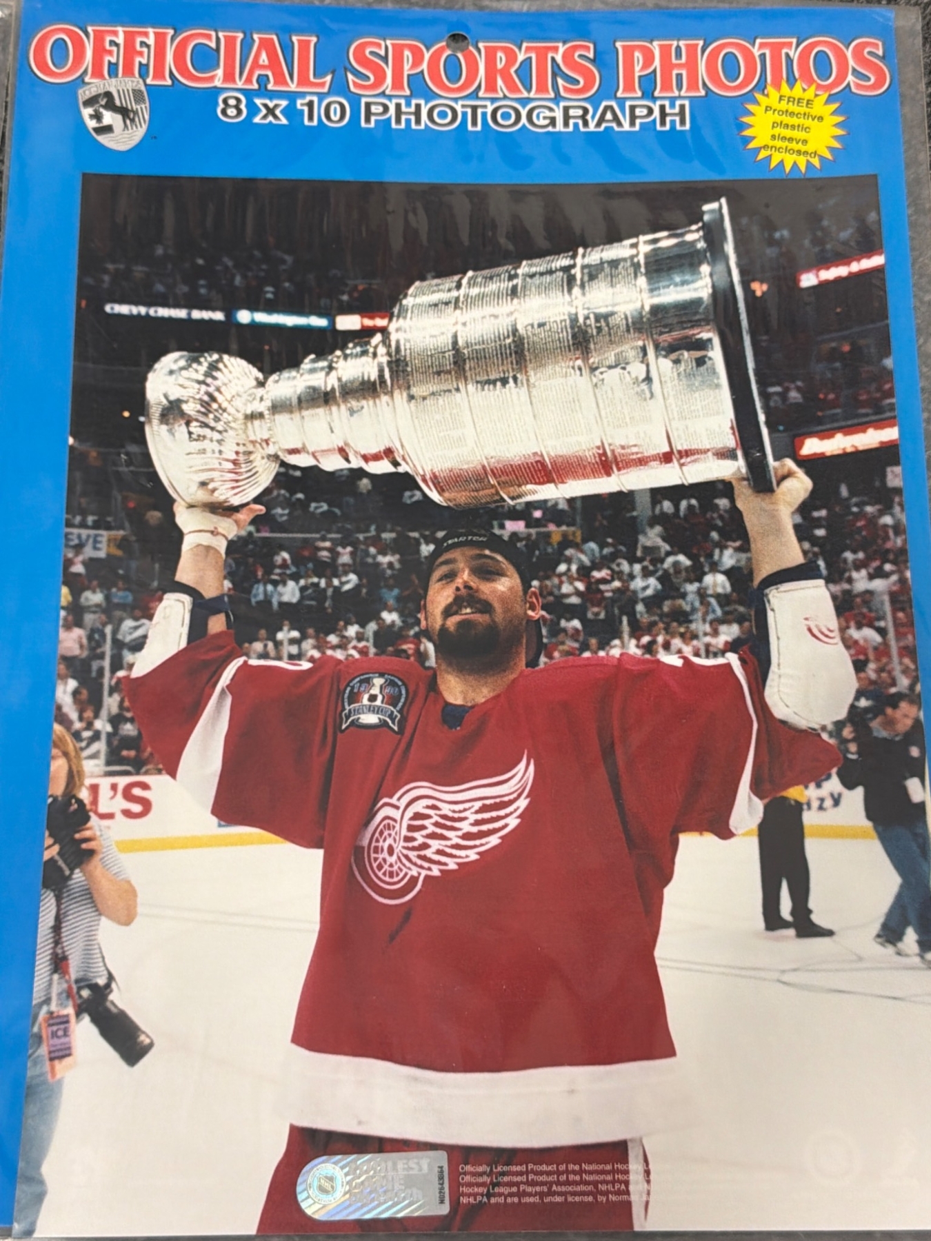 Two officially licensed 8x10 photographs featuring Detroit Red Wings players celebrating their Stanley Cup victory. Each photograph showcases iconic moments with the Stanley Cup trophy, printed with high-quality imagery. The items are sealed in original packaging, ensuring their pristine condition. A great addition for Red Wings fans and sports memorabilia collectors.