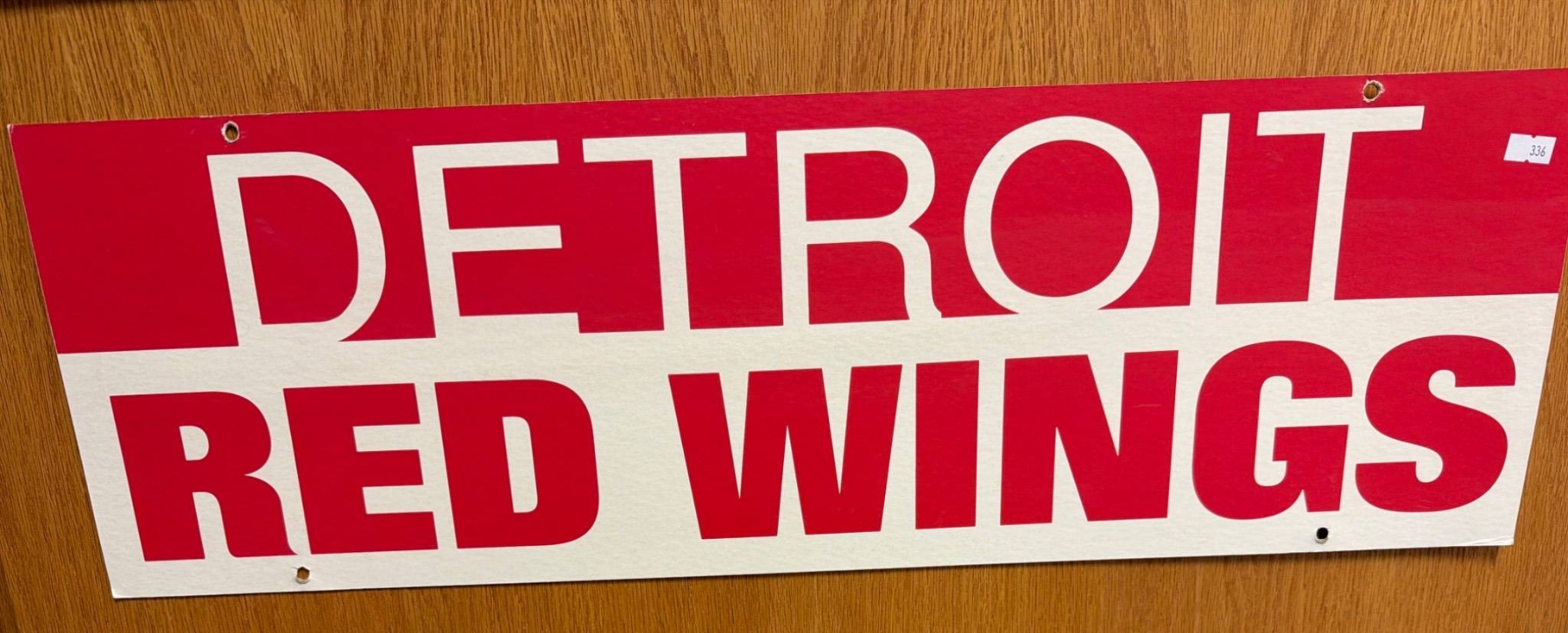 Detroit Red Wings red and white sign, ideal for any hockey enthusiast or loyal fan of the iconic team. The bold design features the team's name in large, legible font on a smooth surface that may be suitable for indoor or outdoor display. Perfect for adding a touch of team spirit to your space.