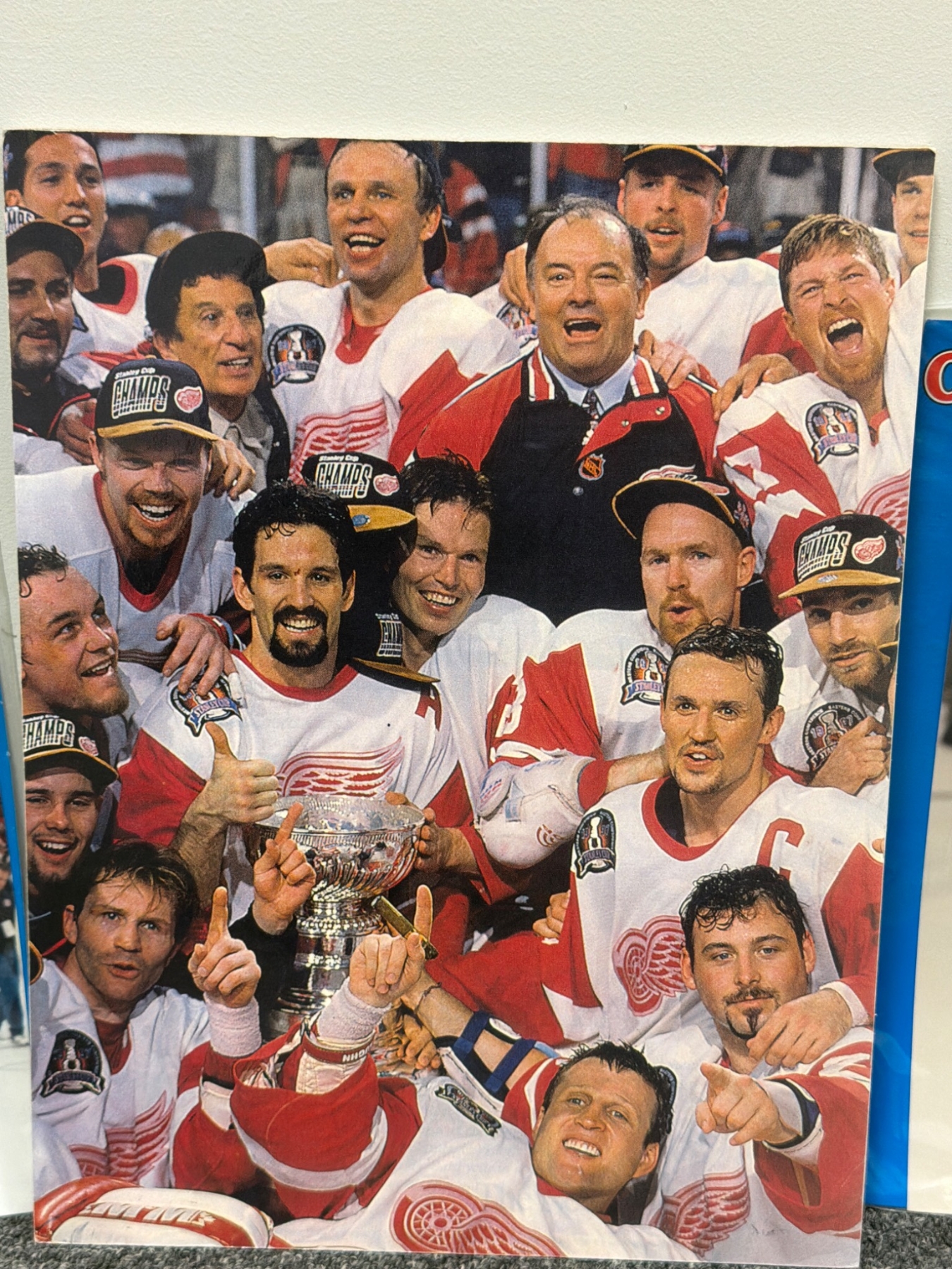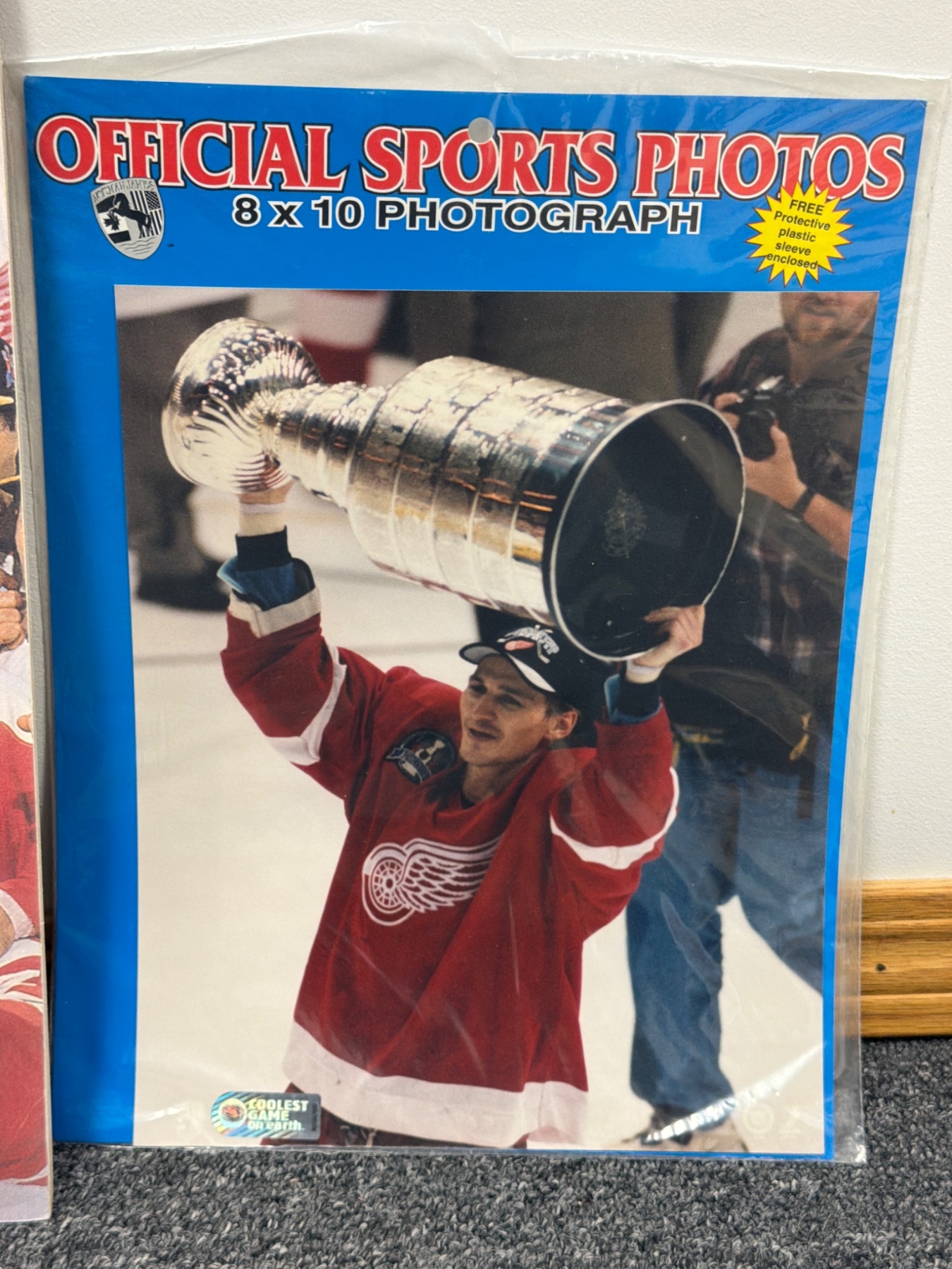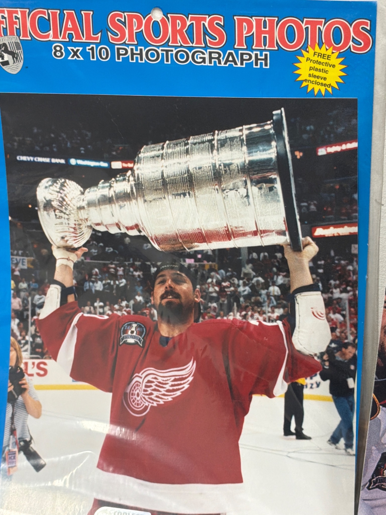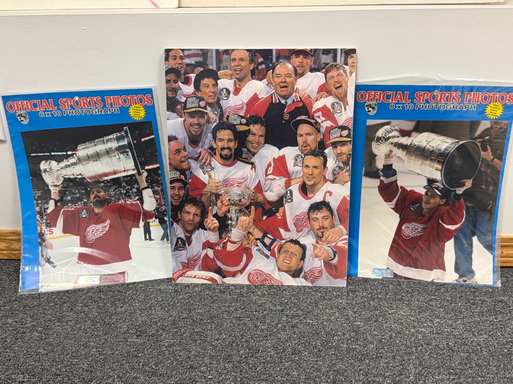 Three photographs celebrating the Detroit Red Wings Stanley Cup victories. Two are 8x10 Official Sports Photos in original packaging, showcasing players holding the Stanley Cup trophy. The third photo highlights an iconic team celebration featuring players and coaching staff. Perfect for Red Wings fans or sports memorabilia collectors.