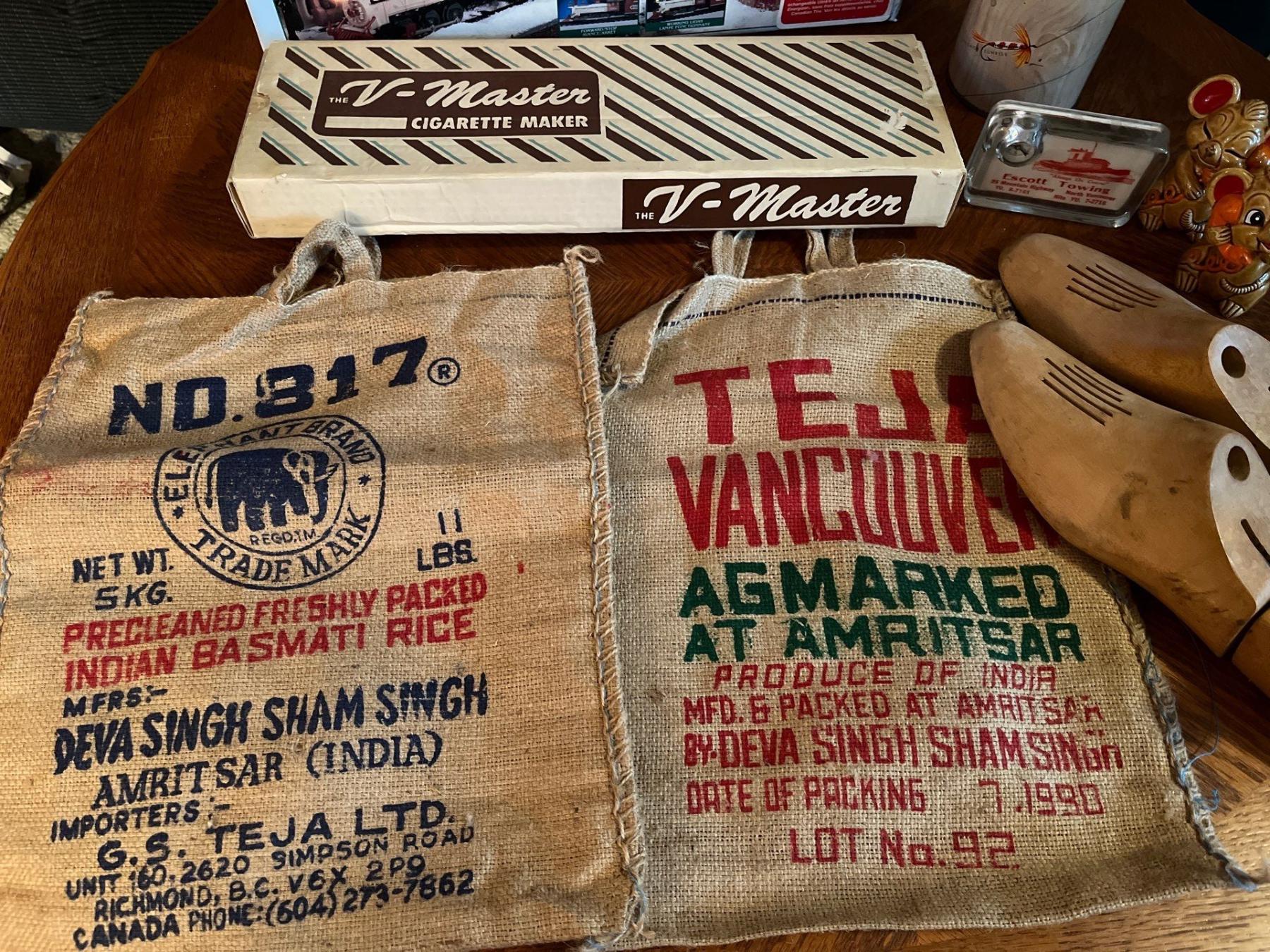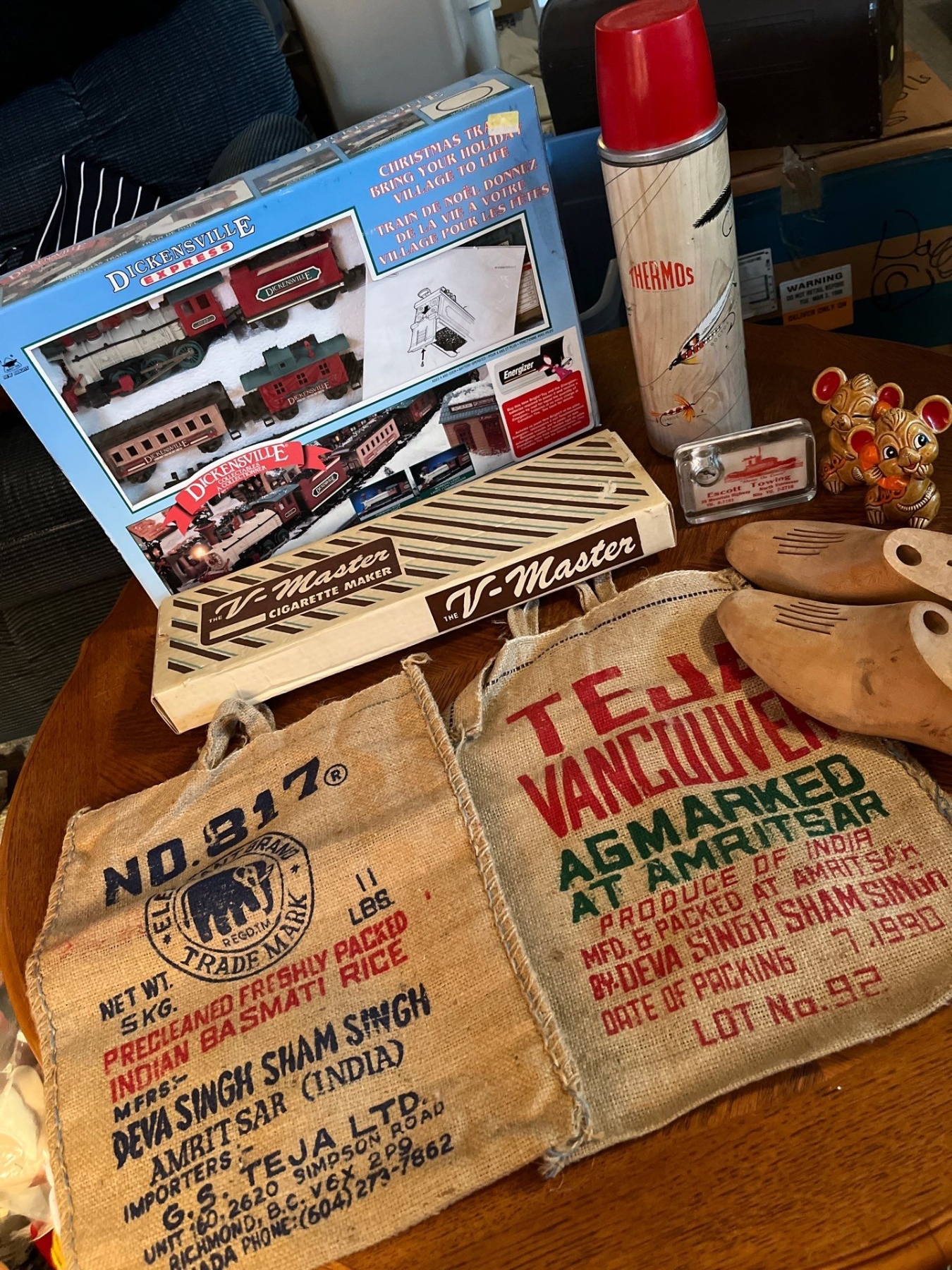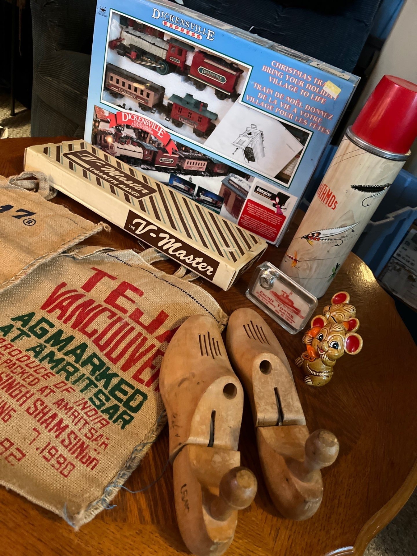 Dickens Ville train set a V master cigarette maker, two vintage rice bags, shoe stretchers, and mouse, salt and pepper shaker along with a vintage fishing thermos