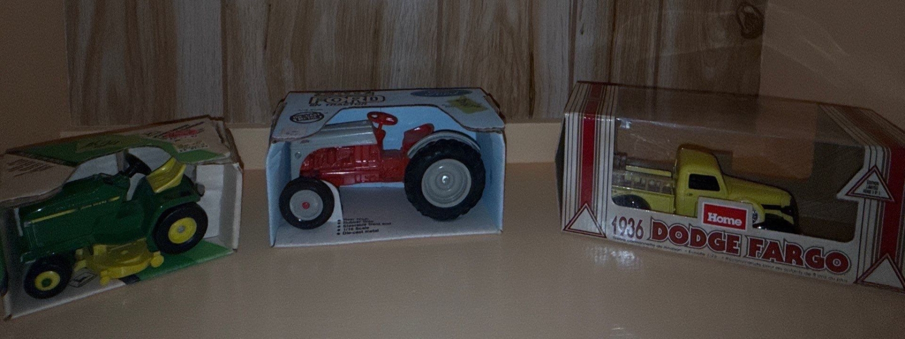 Die Cast 1936 Dodge Fargo 1/25, Metal Ford 8N Tractor 1/16, John Deere Detachable Mower Deck 1/16