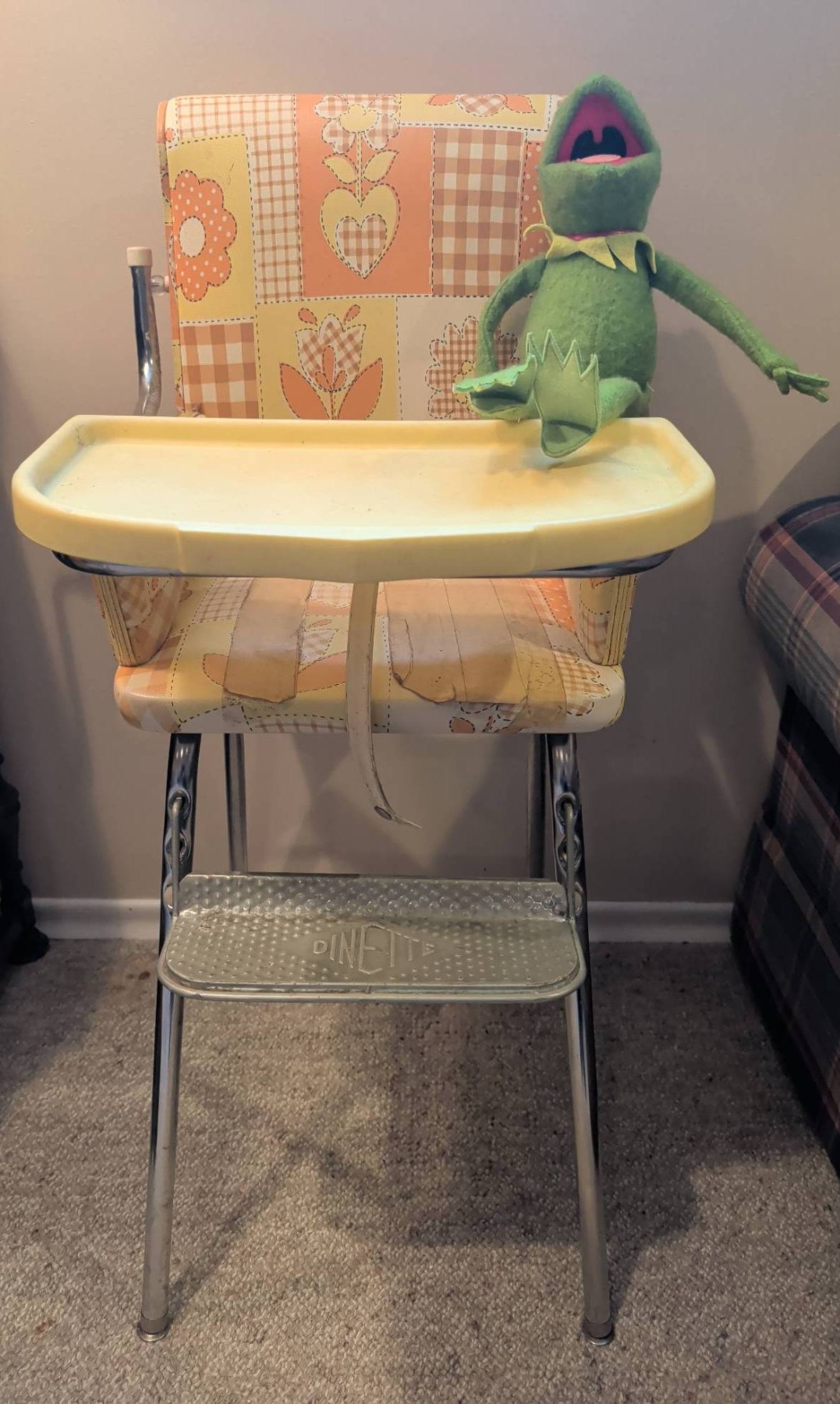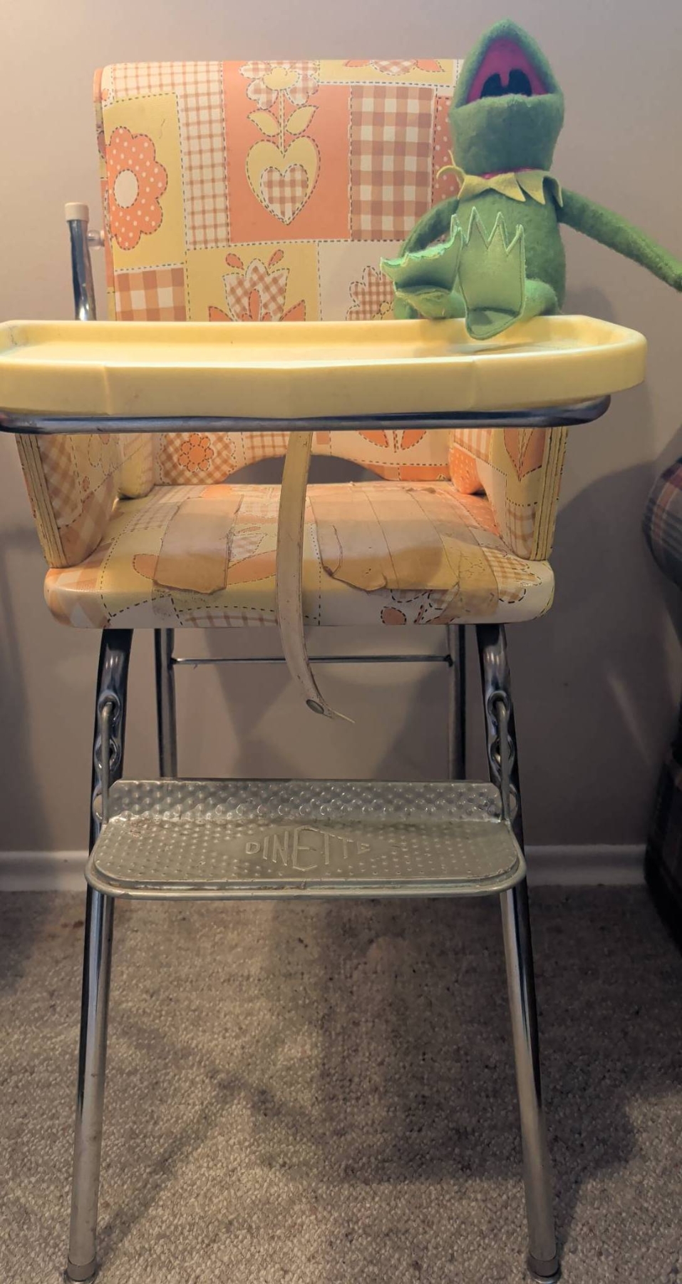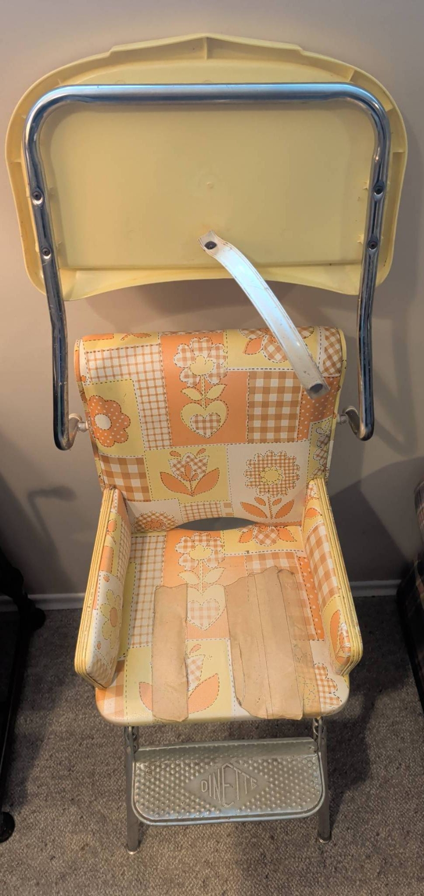 Dinette high chair featuring a charming retro floral vinyl pattern on the seat and backrest. The chair includes a foldable yellow plastic tray and a metal footrest embossed with Dinette. The chair is made with chrome legs, ensuring stability. Ideal as a decorative piece or functional vintage furniture. Chair measures 40 inches in height, 18 inches in width, with a tray depth of 14 inches.