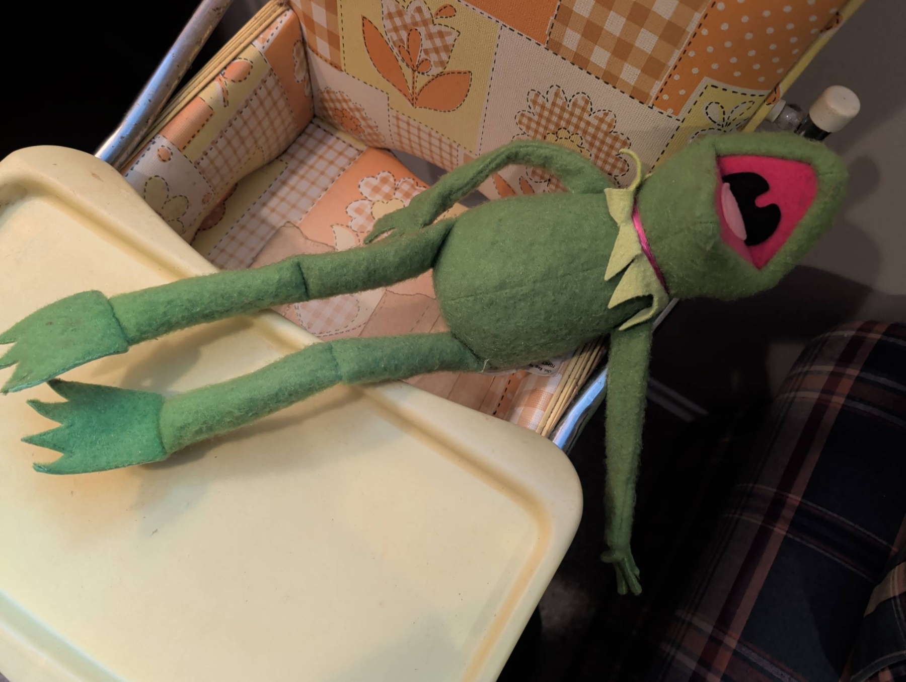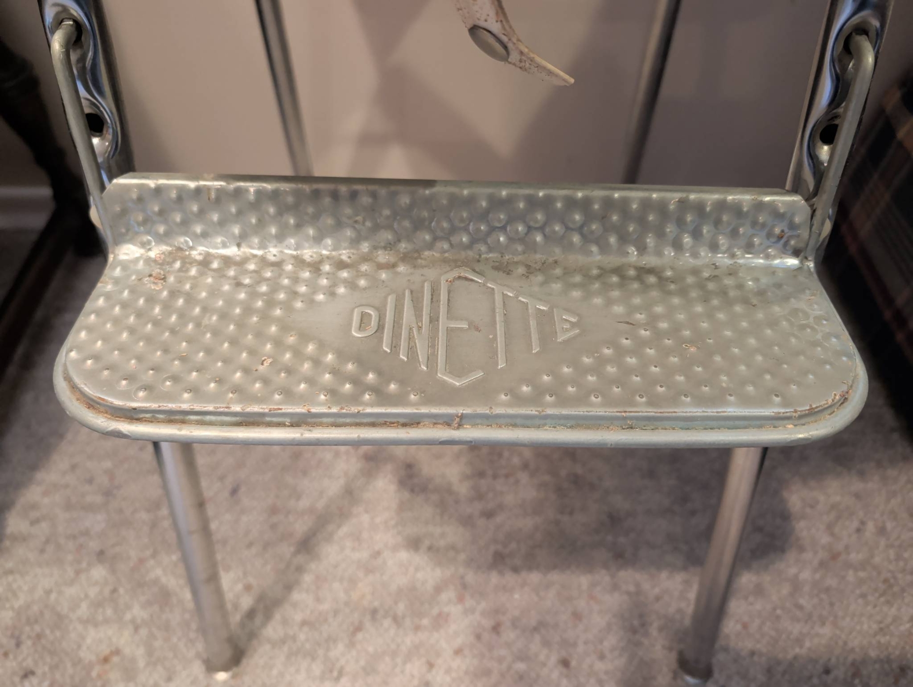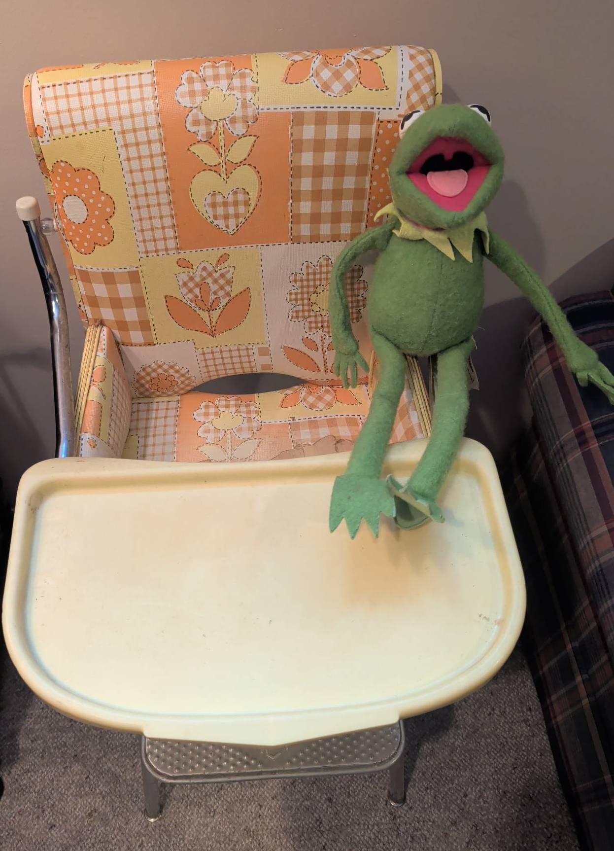 Dinette high chair featuring a charming retro floral vinyl pattern on the seat and backrest. The chair includes a foldable yellow plastic tray and a metal footrest embossed with Dinette. The chair is made with chrome legs, ensuring stability. Ideal as a decorative piece or functional vintage furniture. Chair measures 40 inches in height, 18 inches in width, with a tray depth of 14 inches.