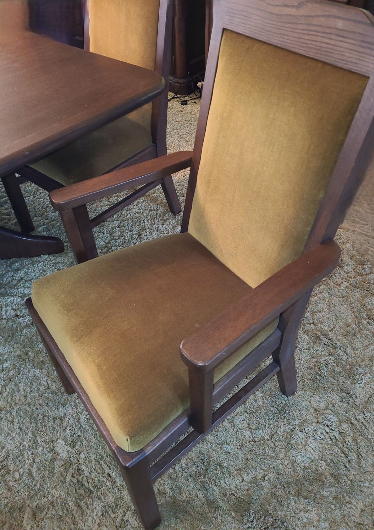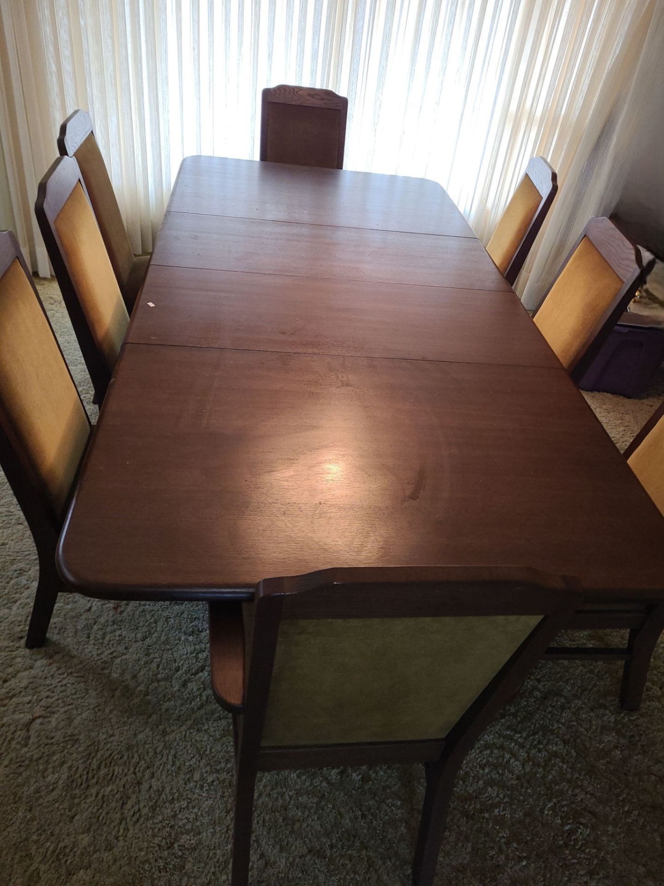 Dining Table 95 W, 46 D, 28 T Includes: 2 Arm Chairs 22 W, 20 D, 38 T and 6 Side 19 W, 19 D, 38 T
