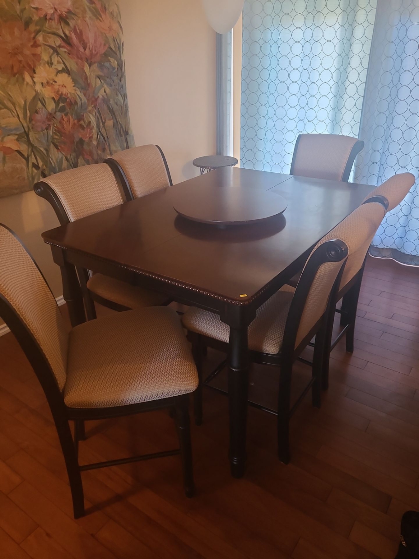 Dining Table w/ Leaf (60"L, 42"W, without leaf) and 6 Chairs (22"W, 18"D, 45"T) Lazy Susan Included