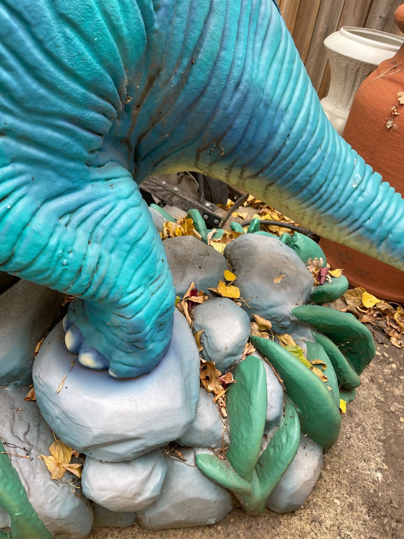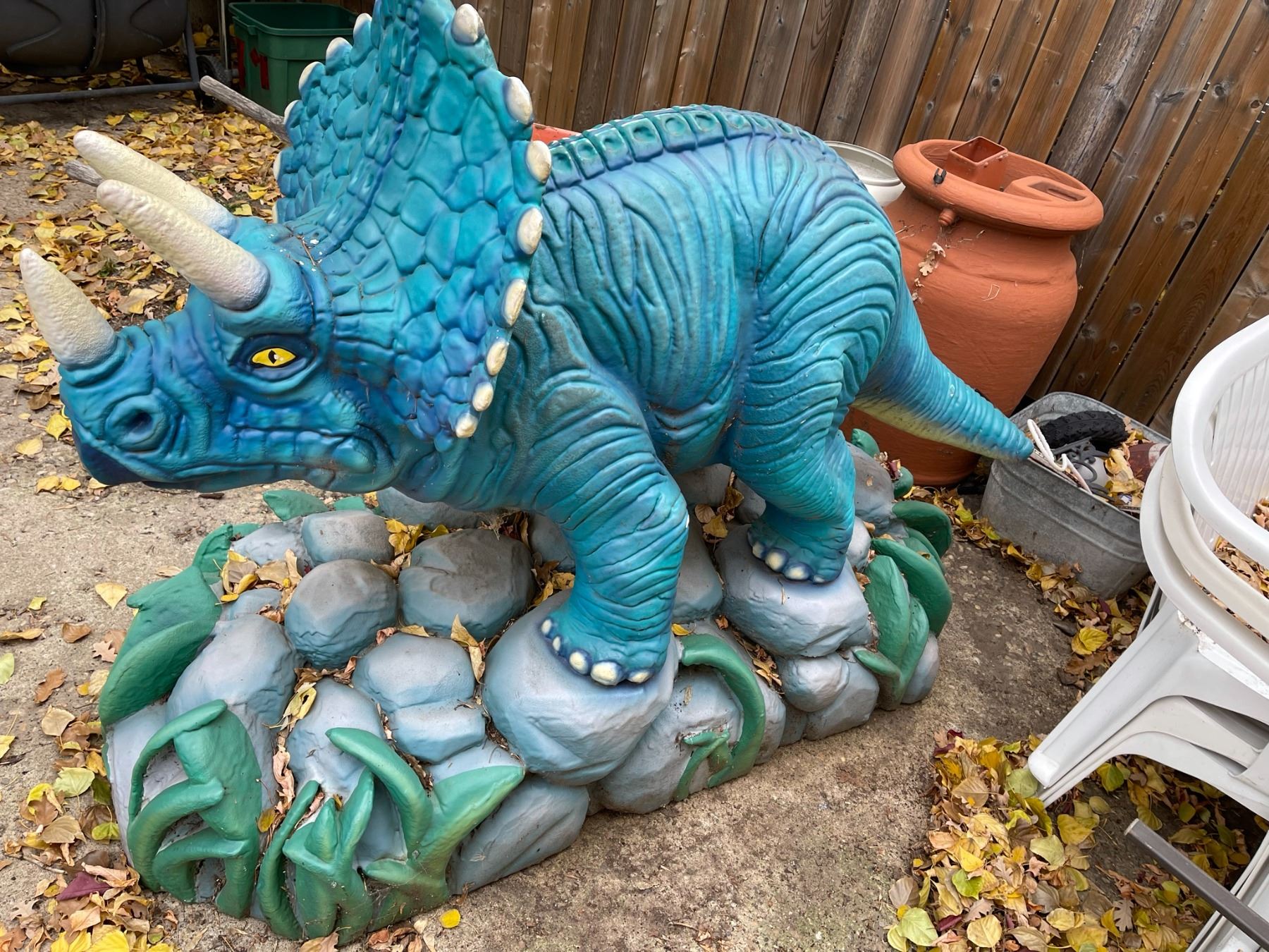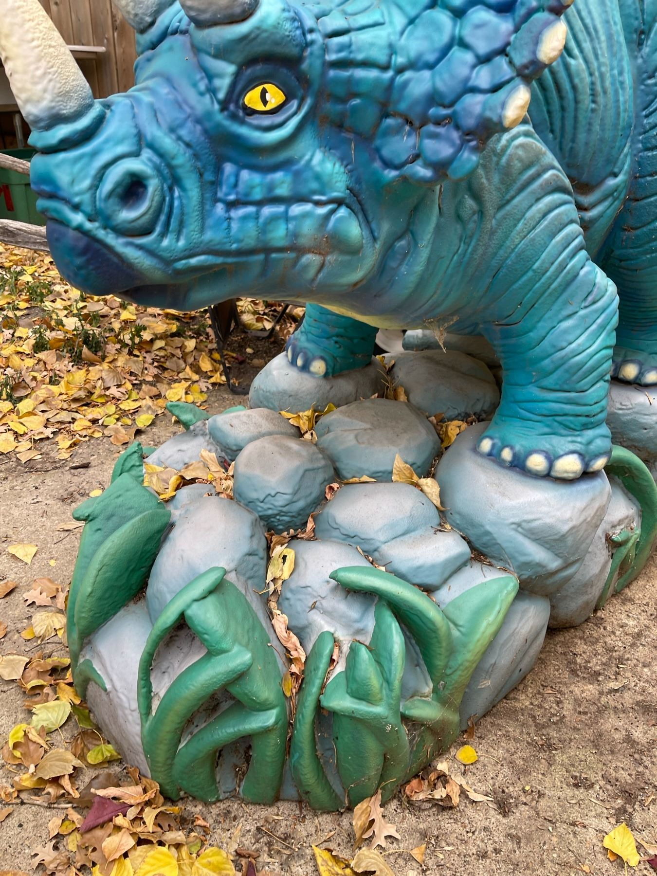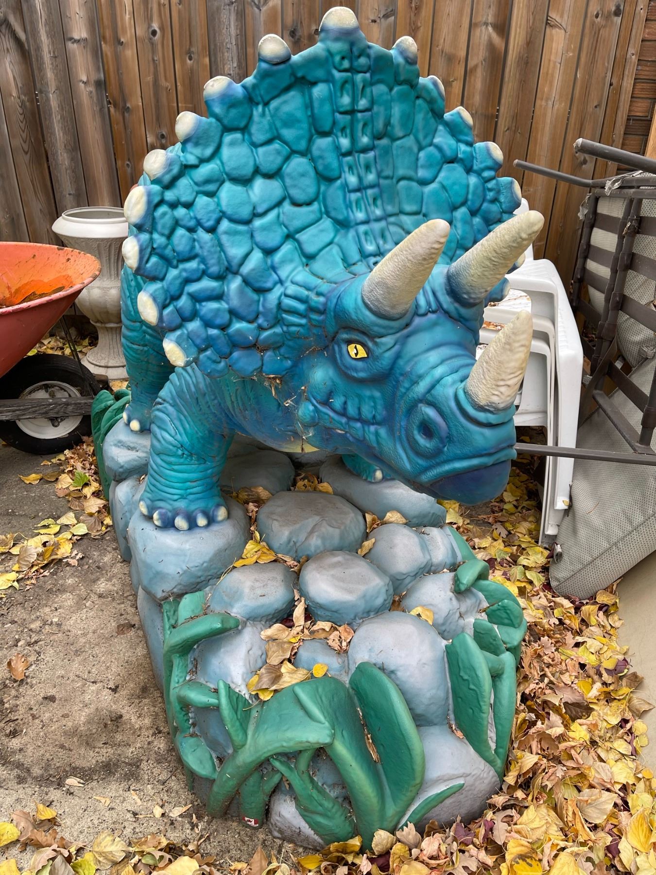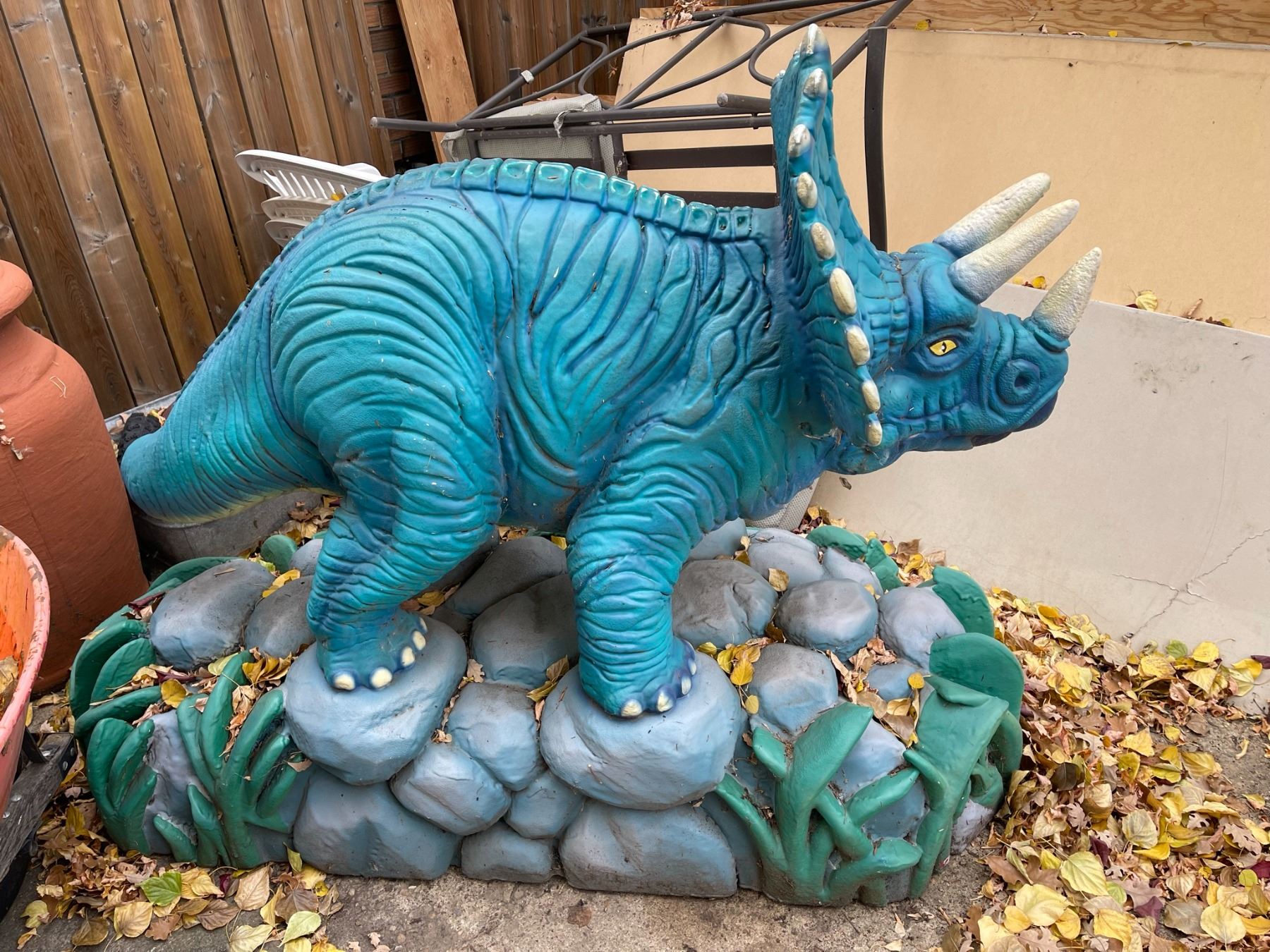 Dinosaur for kids to climb on. Roughly 5ft Tall and 6.5 Ft Long Weighs roughly 100lbs. Make of Fibreglass.