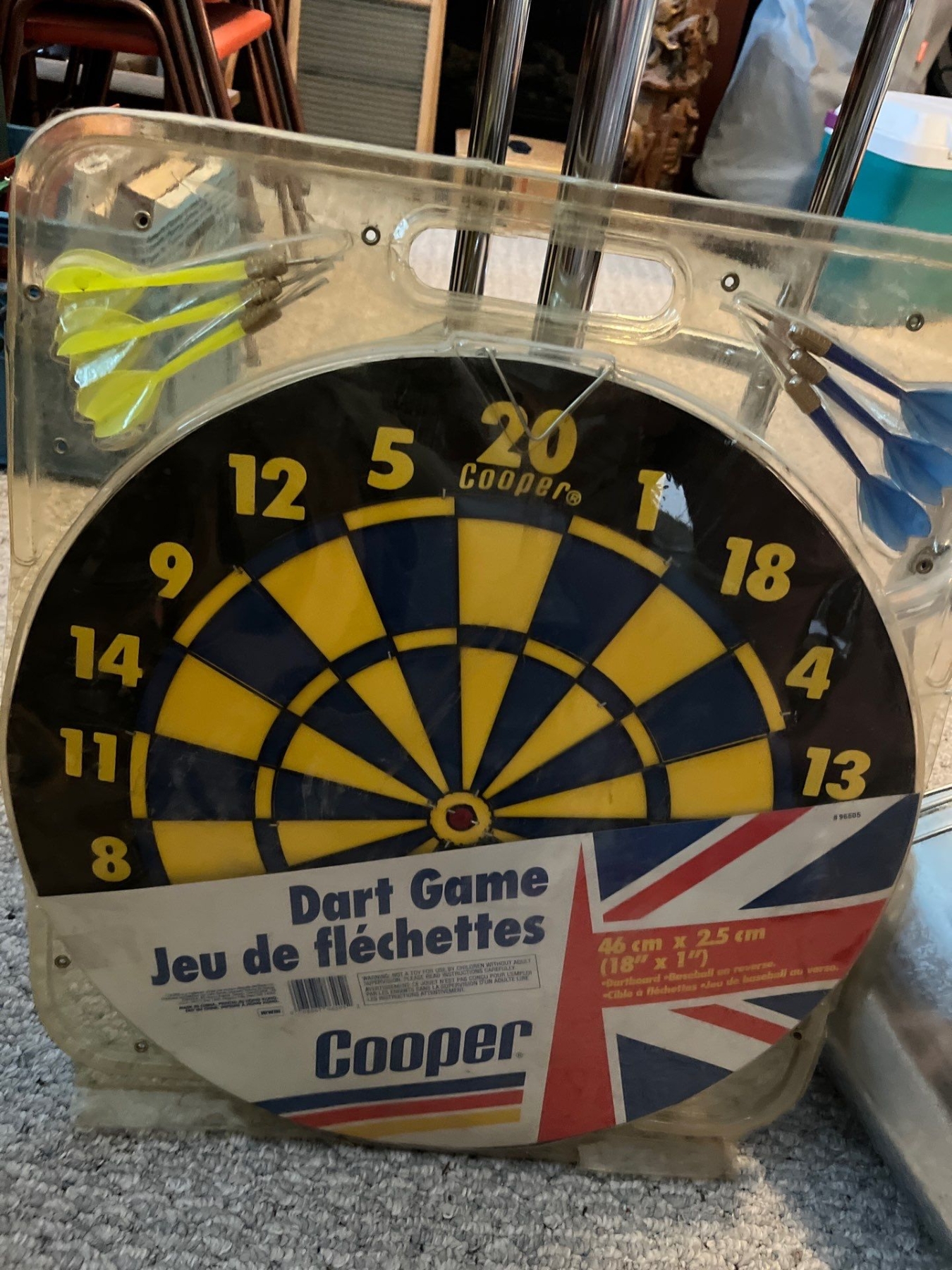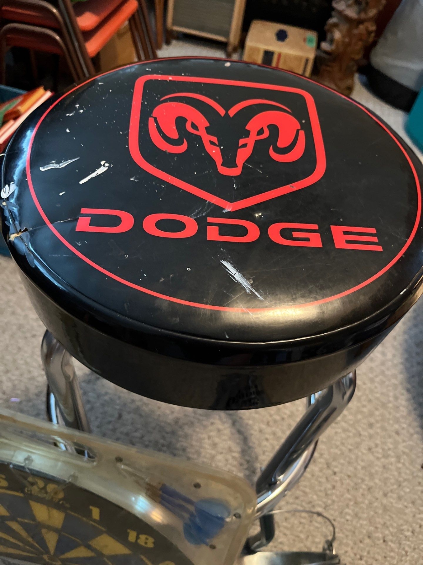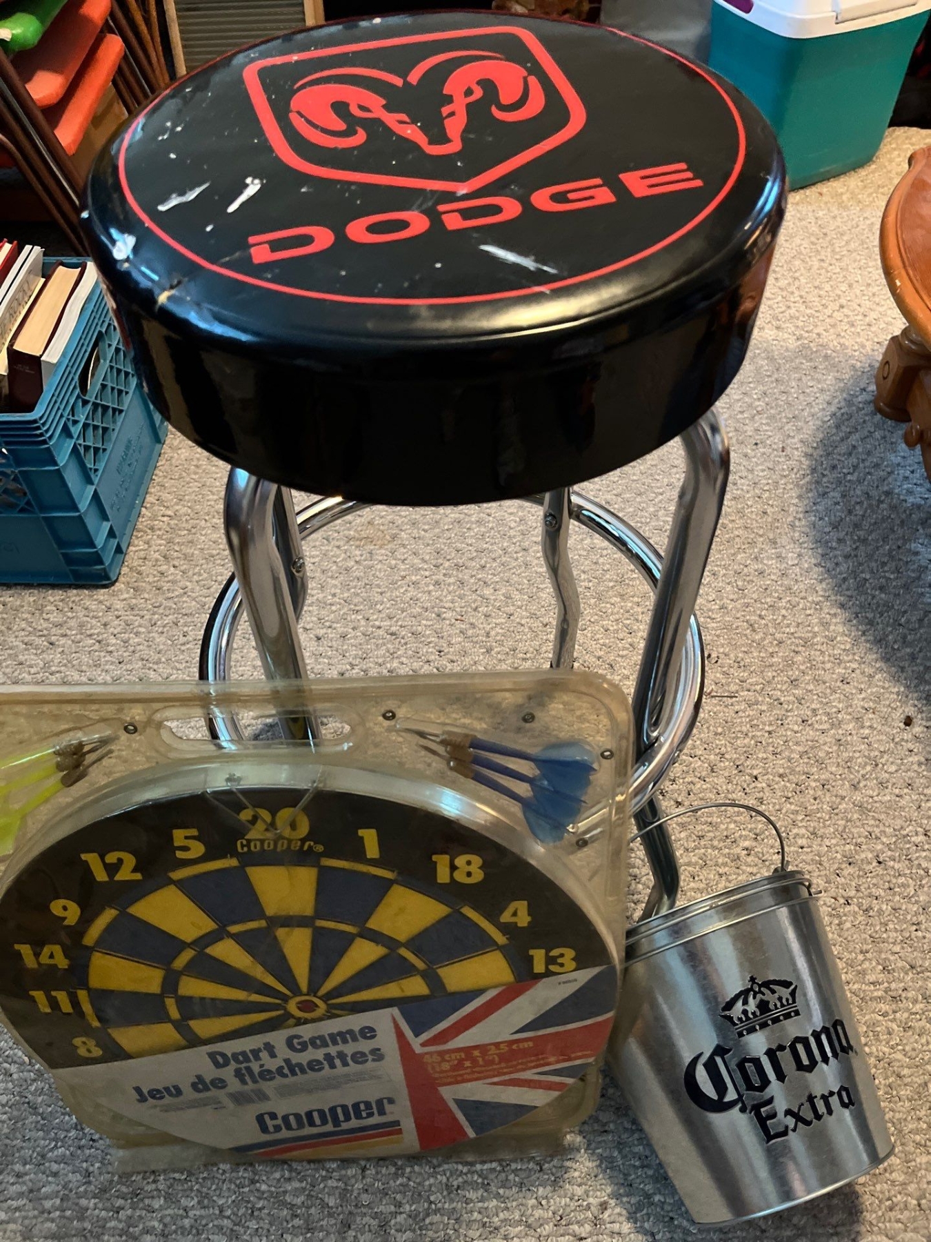Dodge barstool with British Cooper dartboard and two Corona buckets