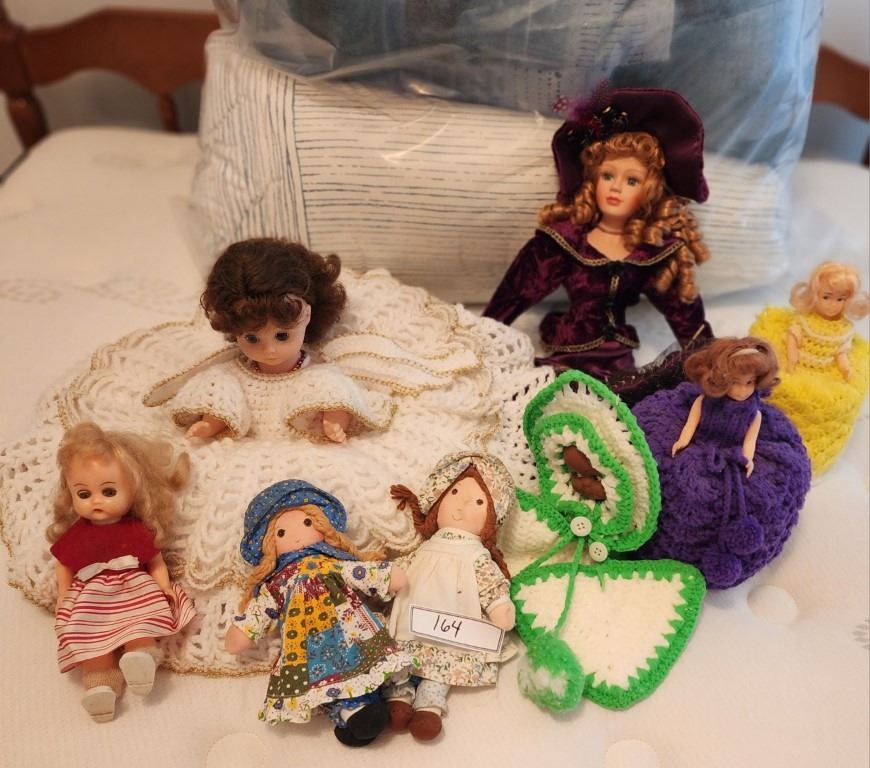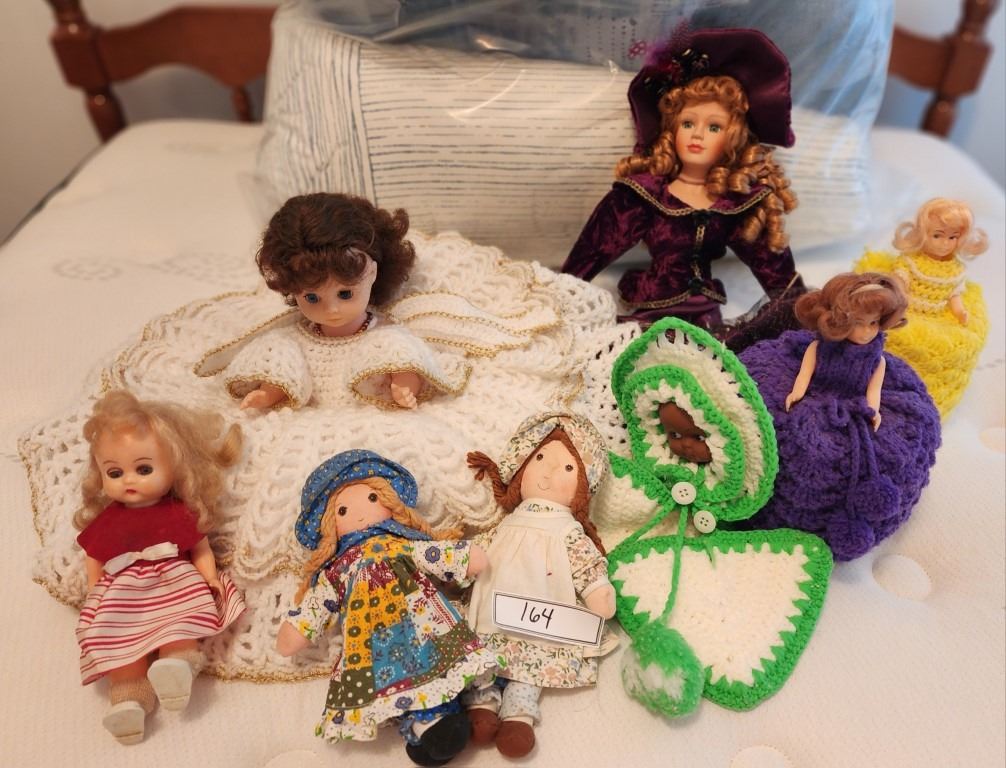 Doll Collection - Vintage Victorian Porcelain Doll "Charlotte Knights Bridge", Vintage Crochet Bed Pillow Doll, 1 yellow, 1 purple crochet toilet paper holders, vintage Holly Hobby Knickerbooker Doll, Vintage Holly Hobby Heather Doll