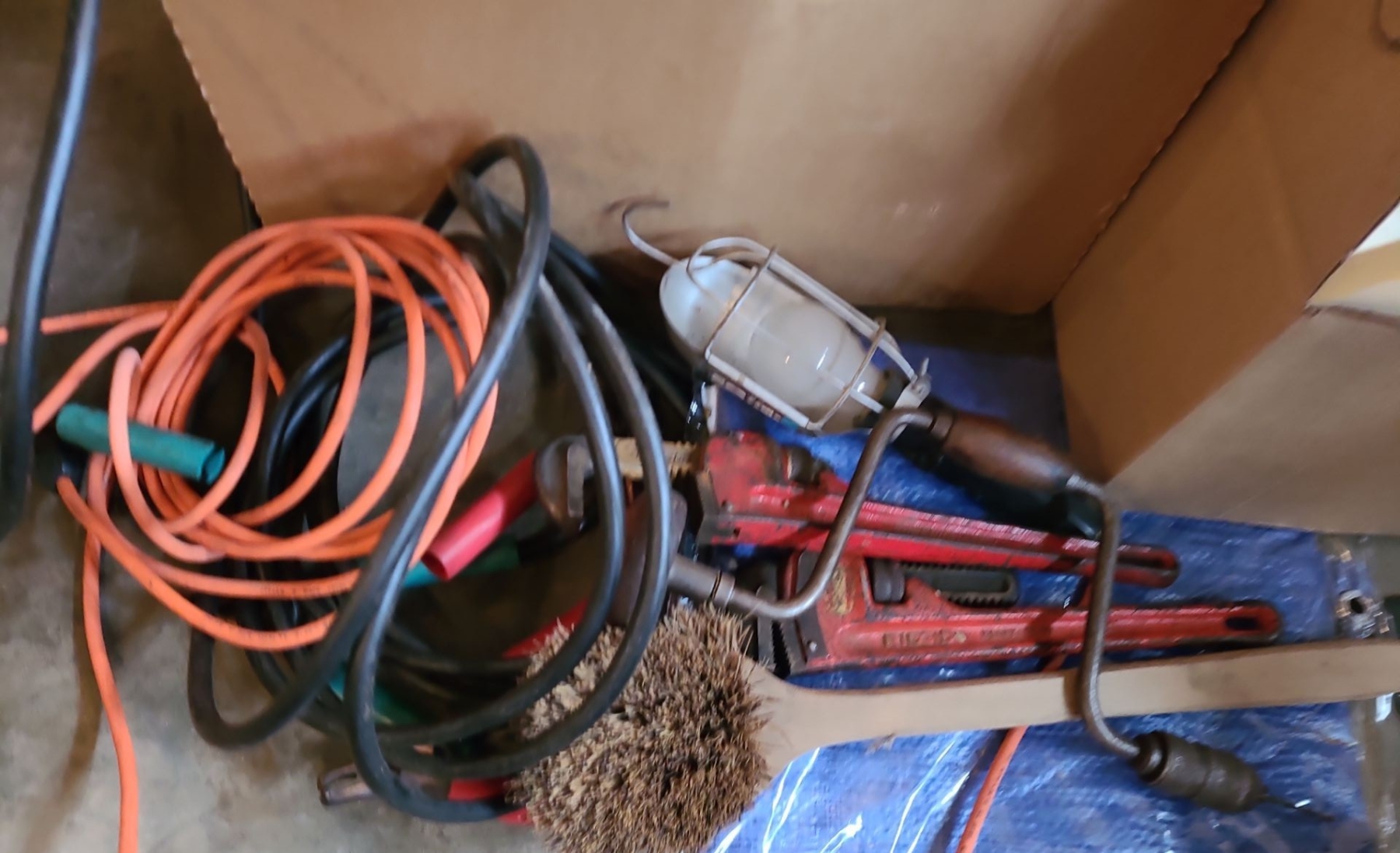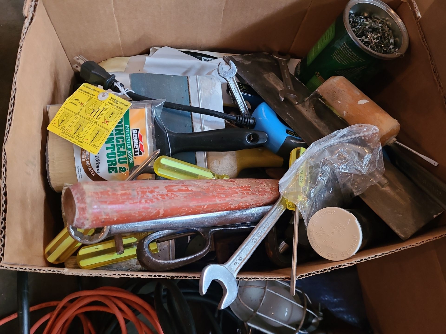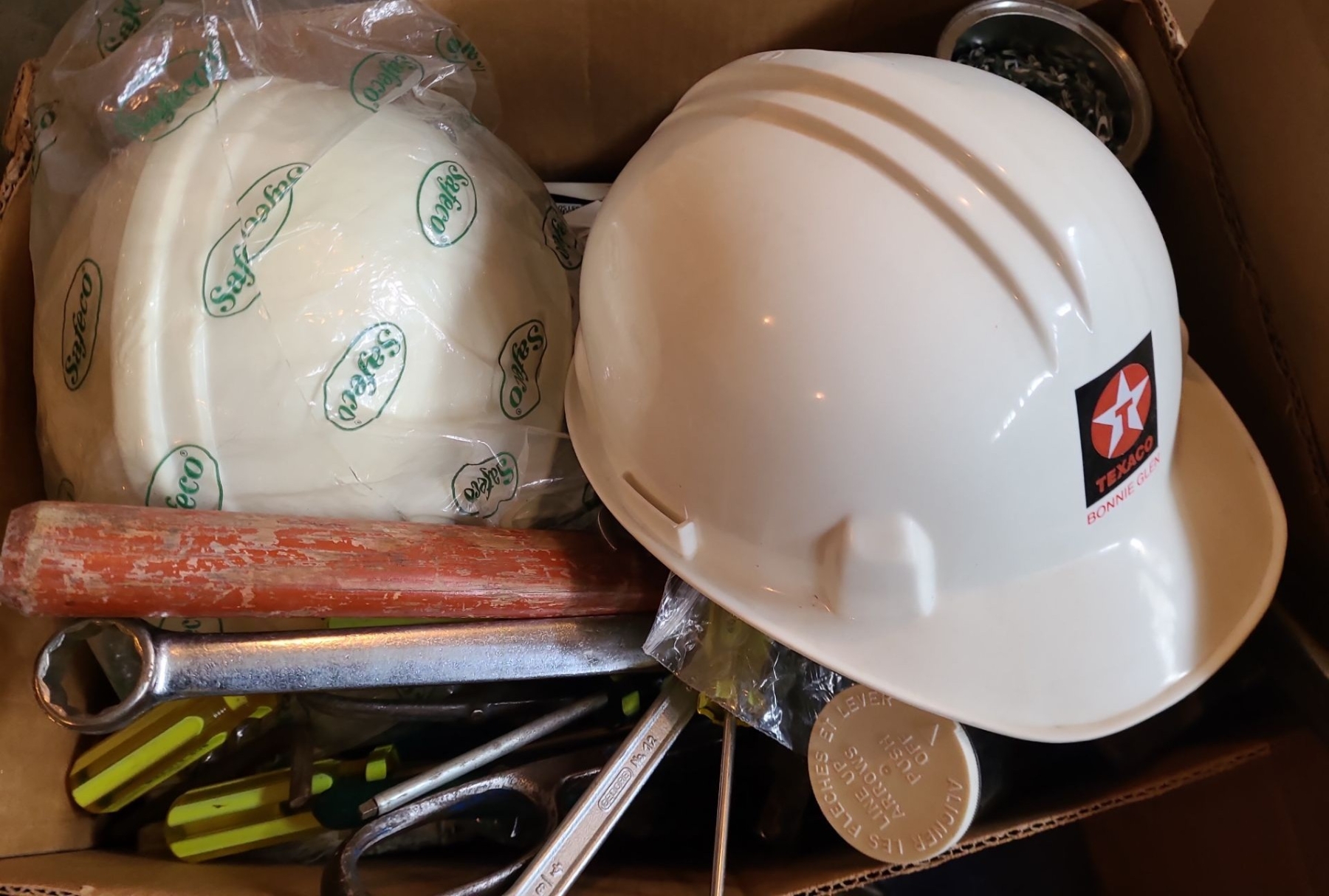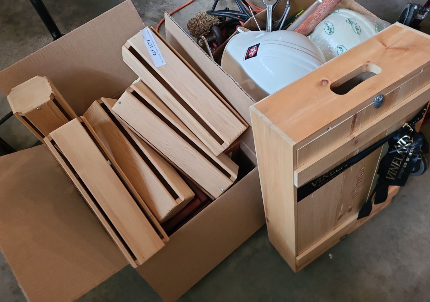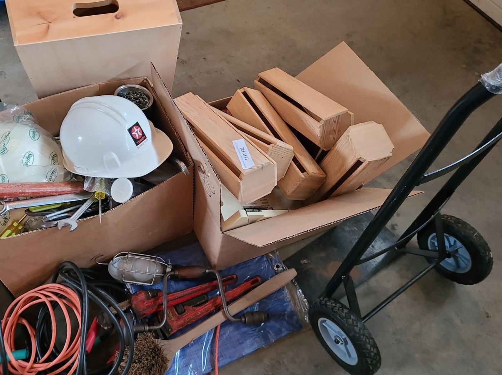 Dolly, Hard Hat, Wrenches & Lg Vareity of Tools, Trouble Light, Wood Wine Boxes & MORE
