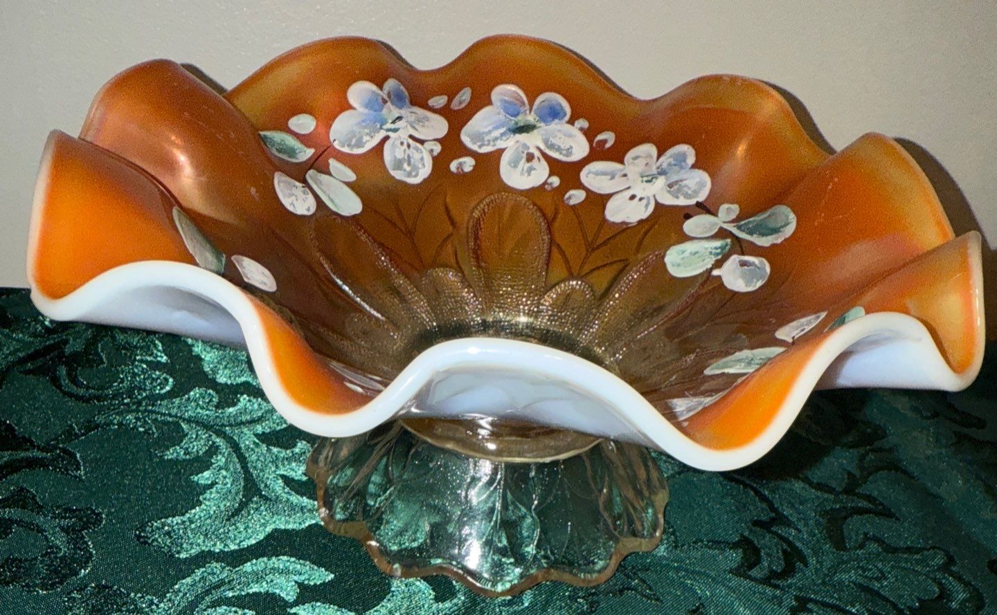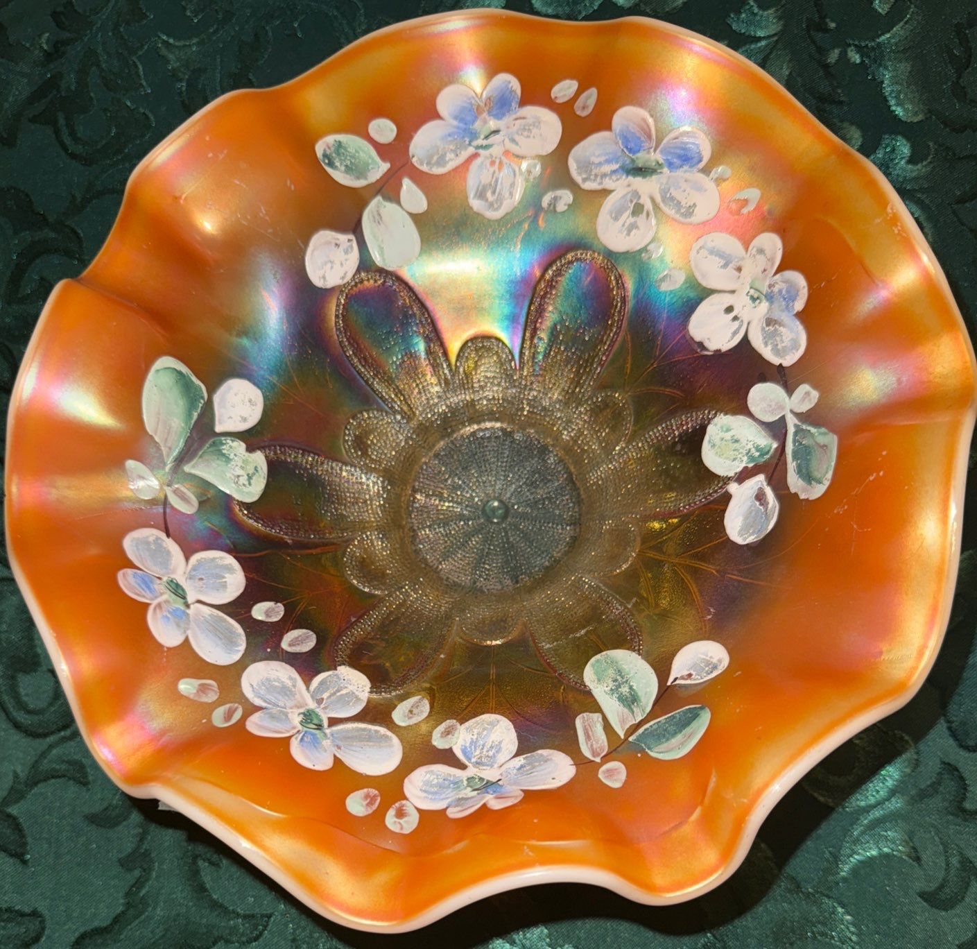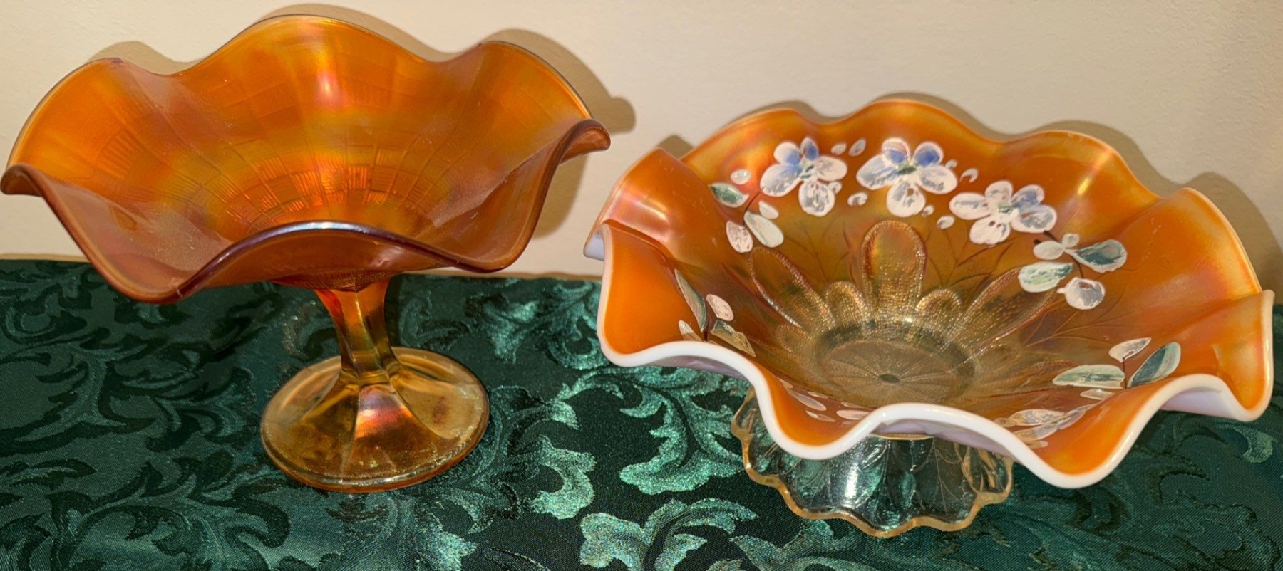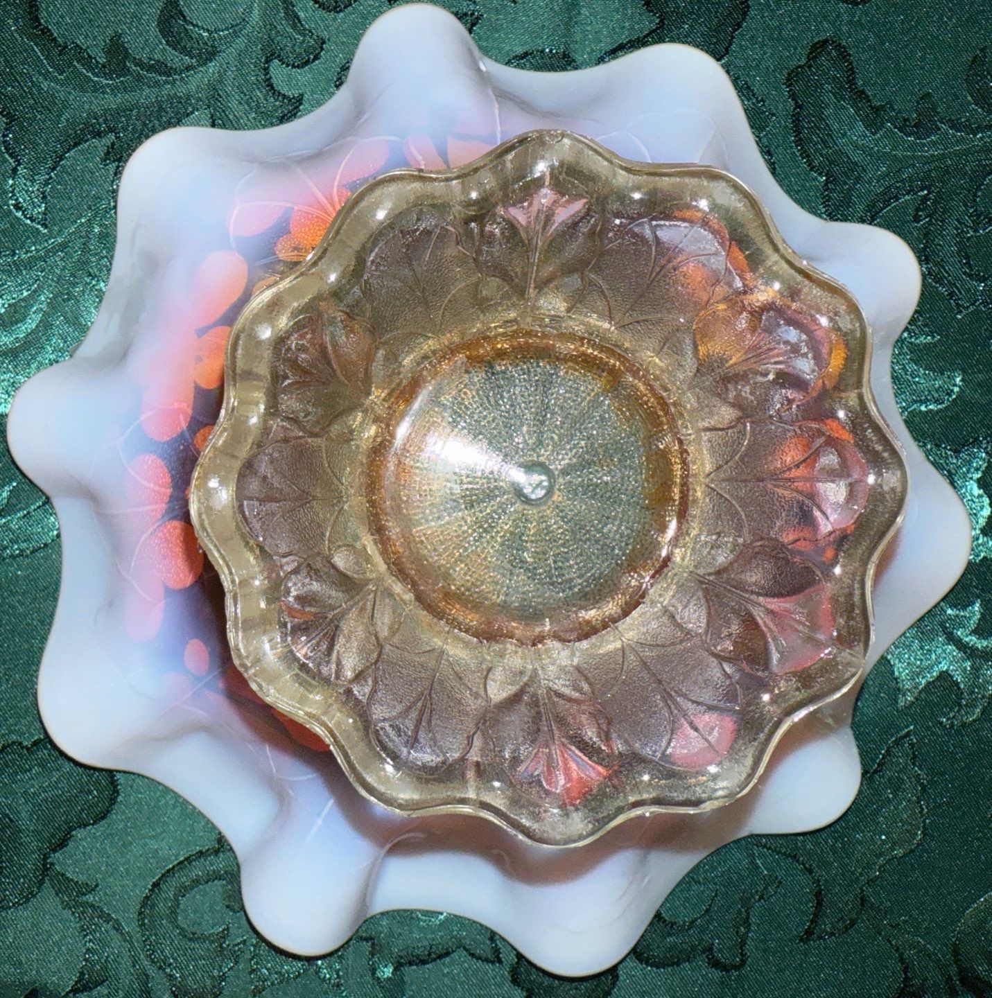 Dugan Peach Opalescent Carnival Glass Coin Spot Pattern Compote & Pedestal Dish
