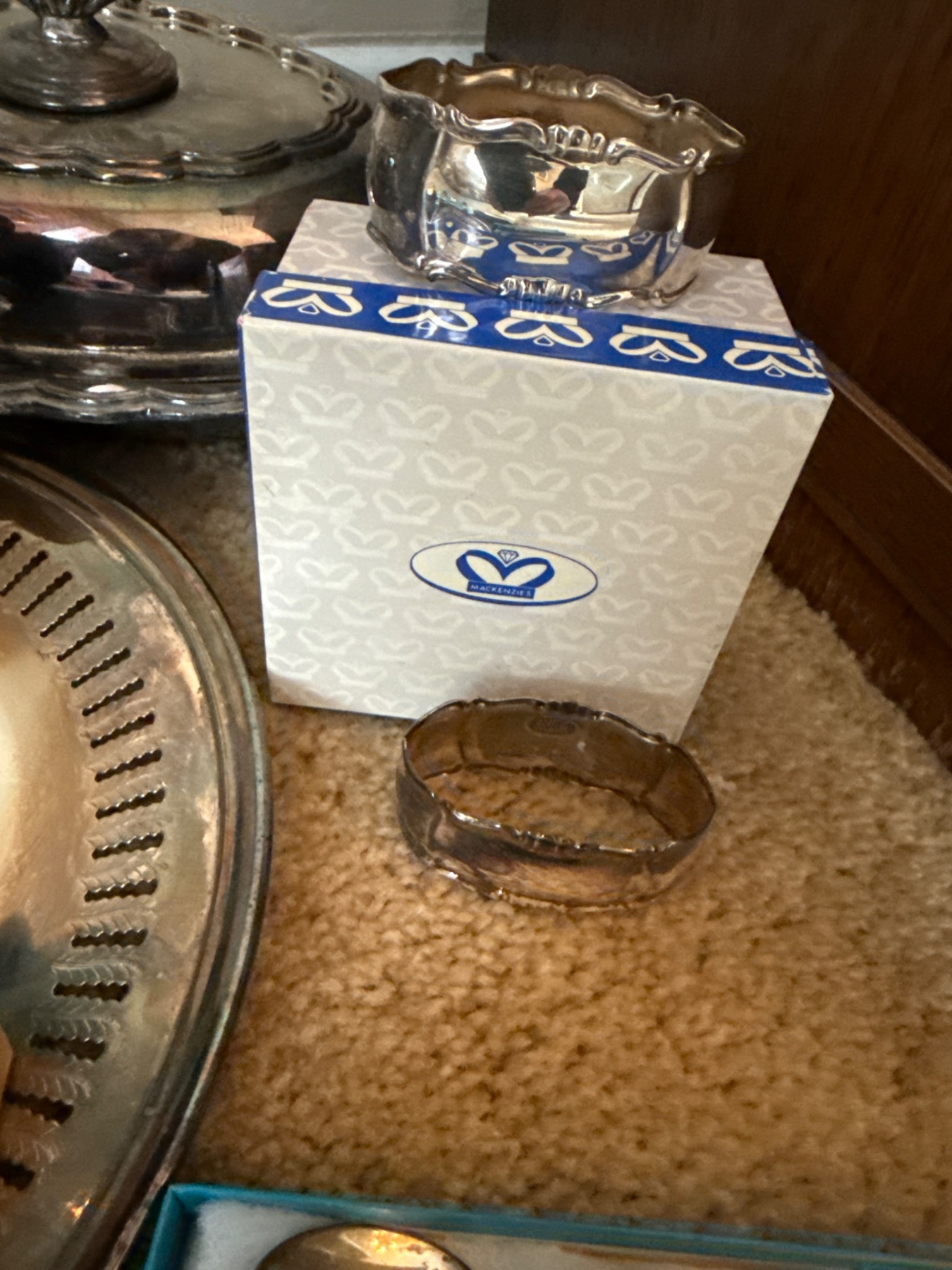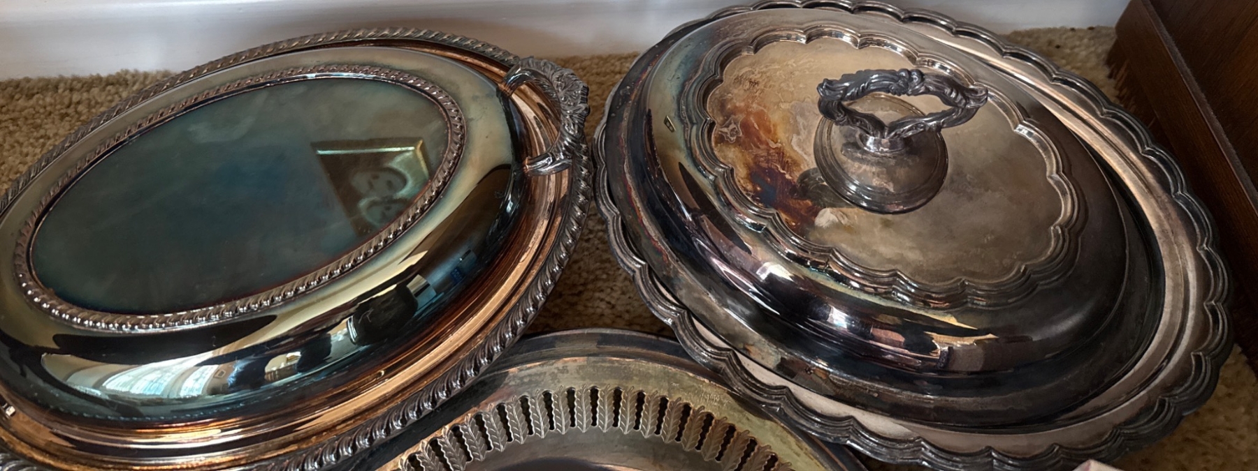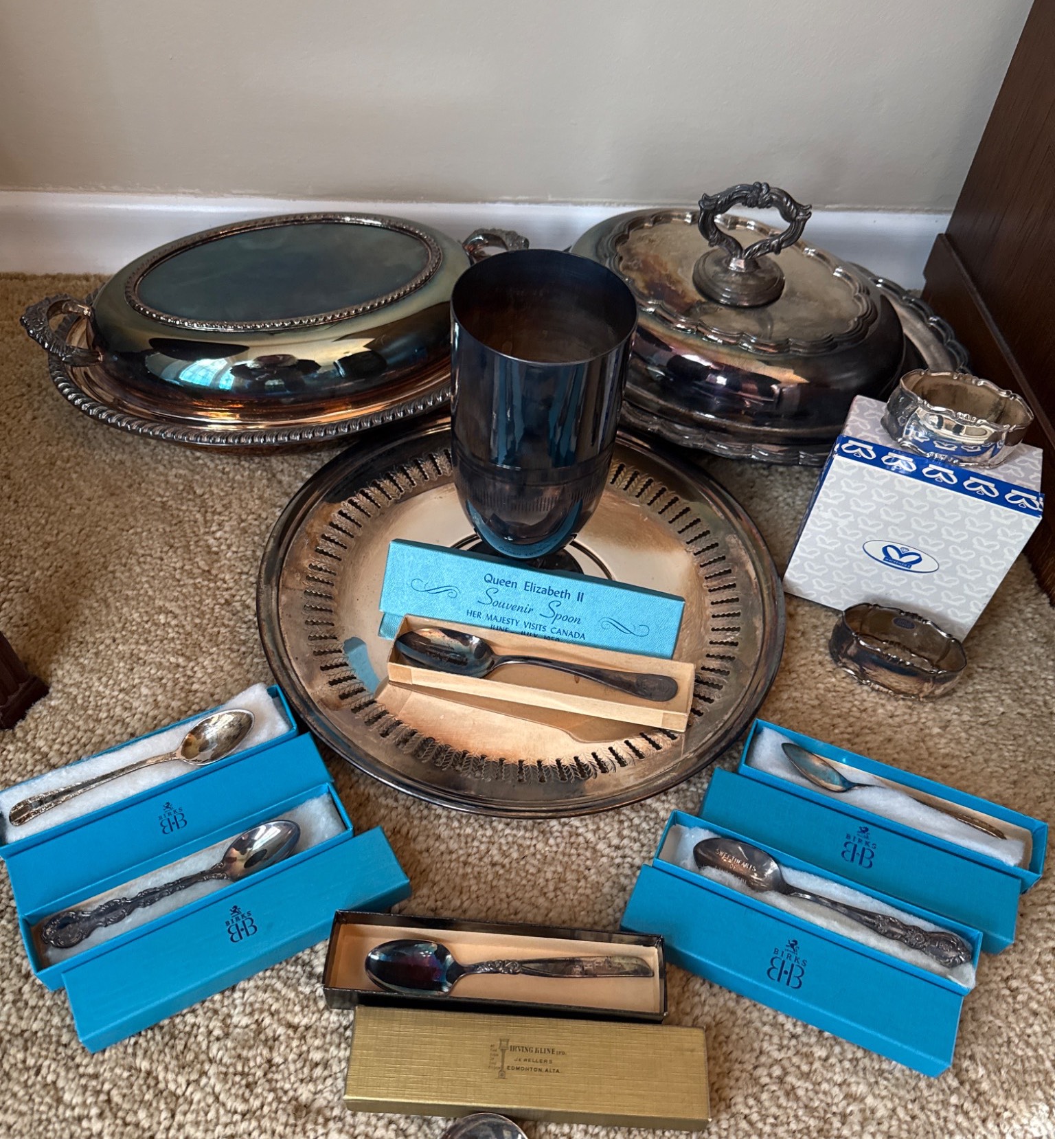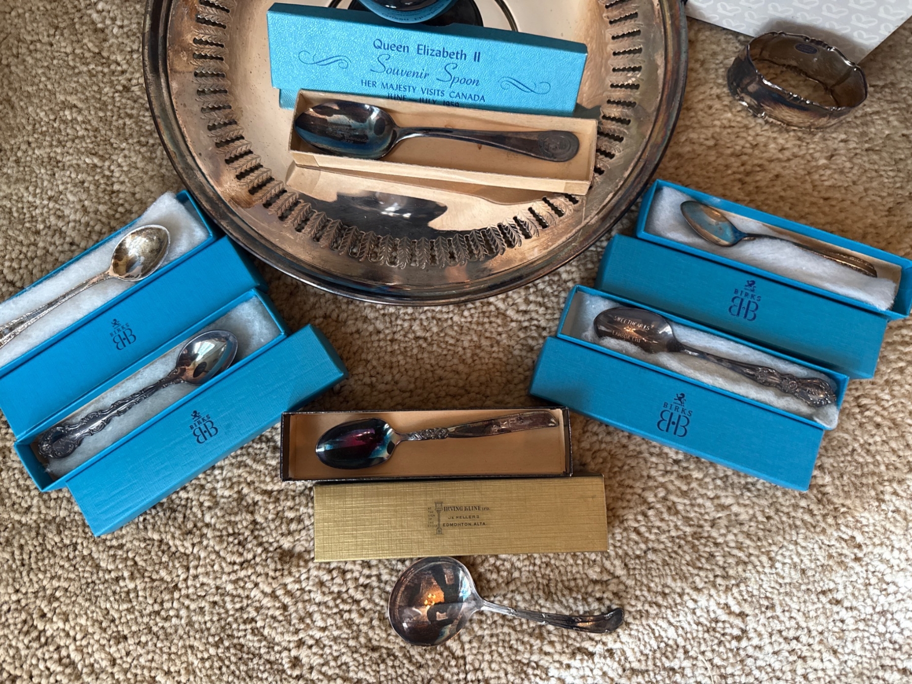 This collection includes several sets of EP-plated Birks special spoons, each in original packaging, along with a variety of silver-plated serving pieces. Featured items include lidded serving dishes, a tray, and additional small silver-plated accessories. The spoons and serving pieces showcase elegant designs ideal for formal dining or display purposes. Dimensions are not specified.