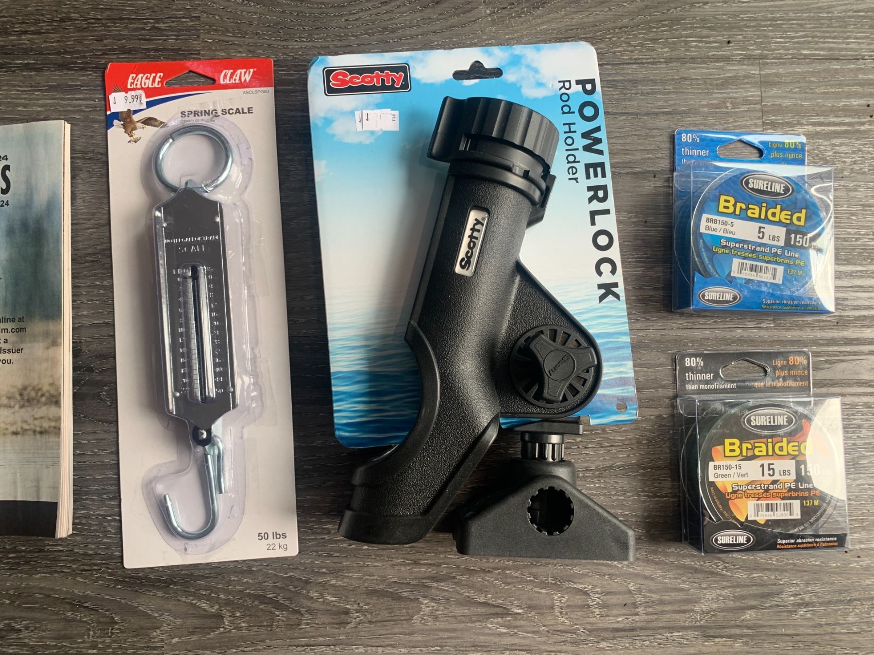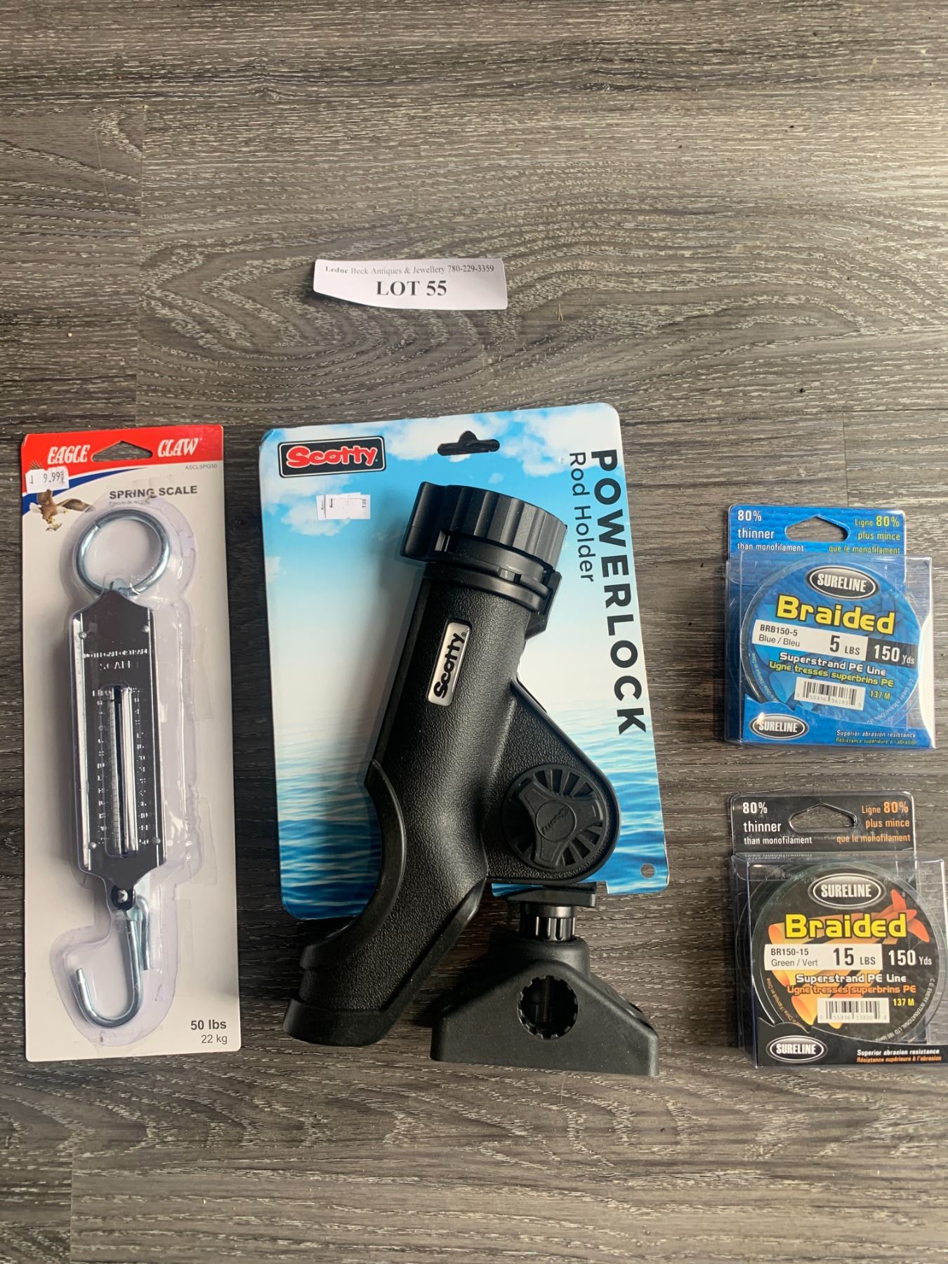 Eagle Claw Spring Scale 1 Unit, Scotty Powerlock Rod Holder 1 Unit, 1 Sureline Braided 15lbs 150 Yds Line, 1 Sureline Braided 5lbs 150 Yds Line, 1 Alberta Hunting Magazine