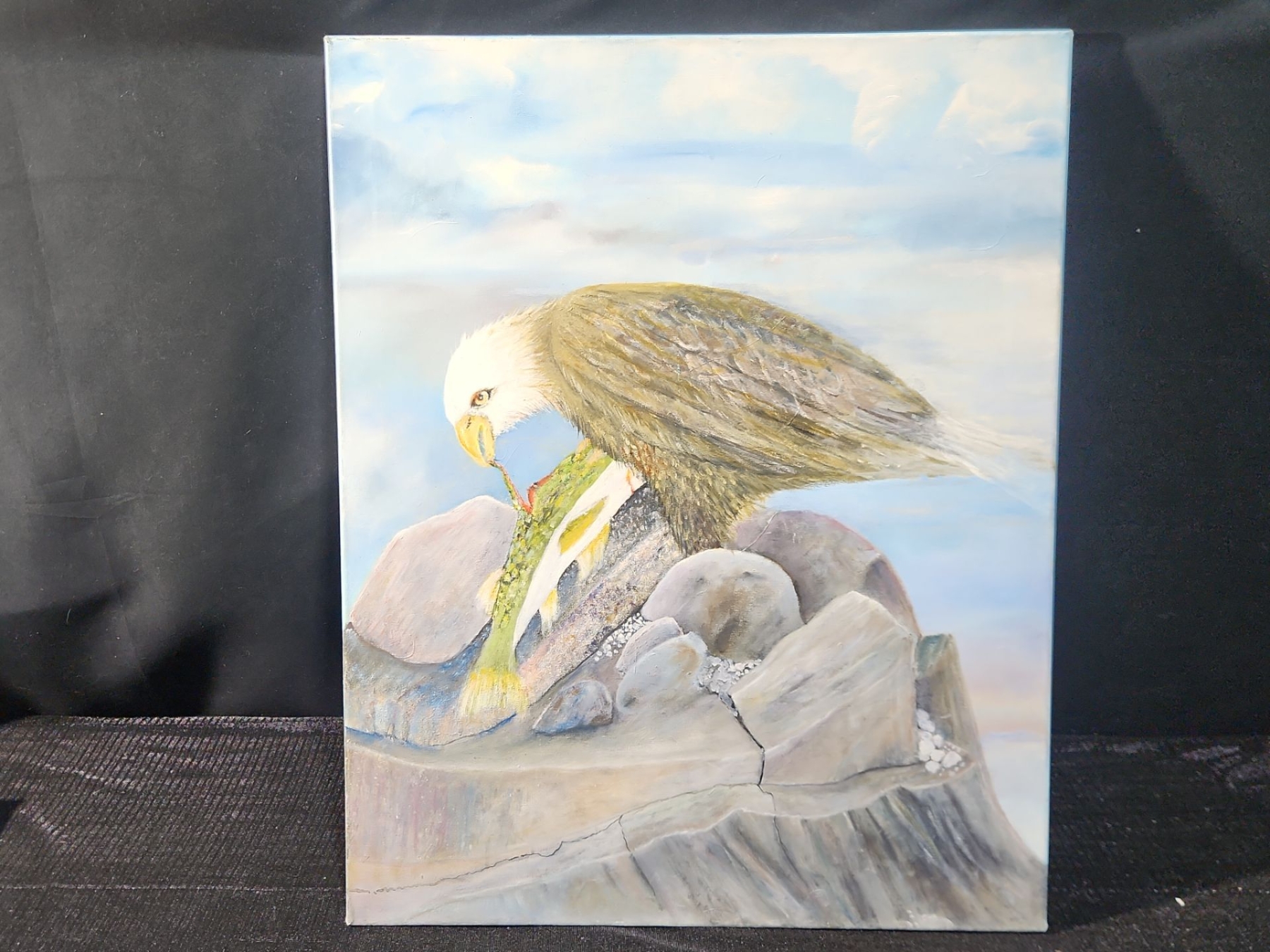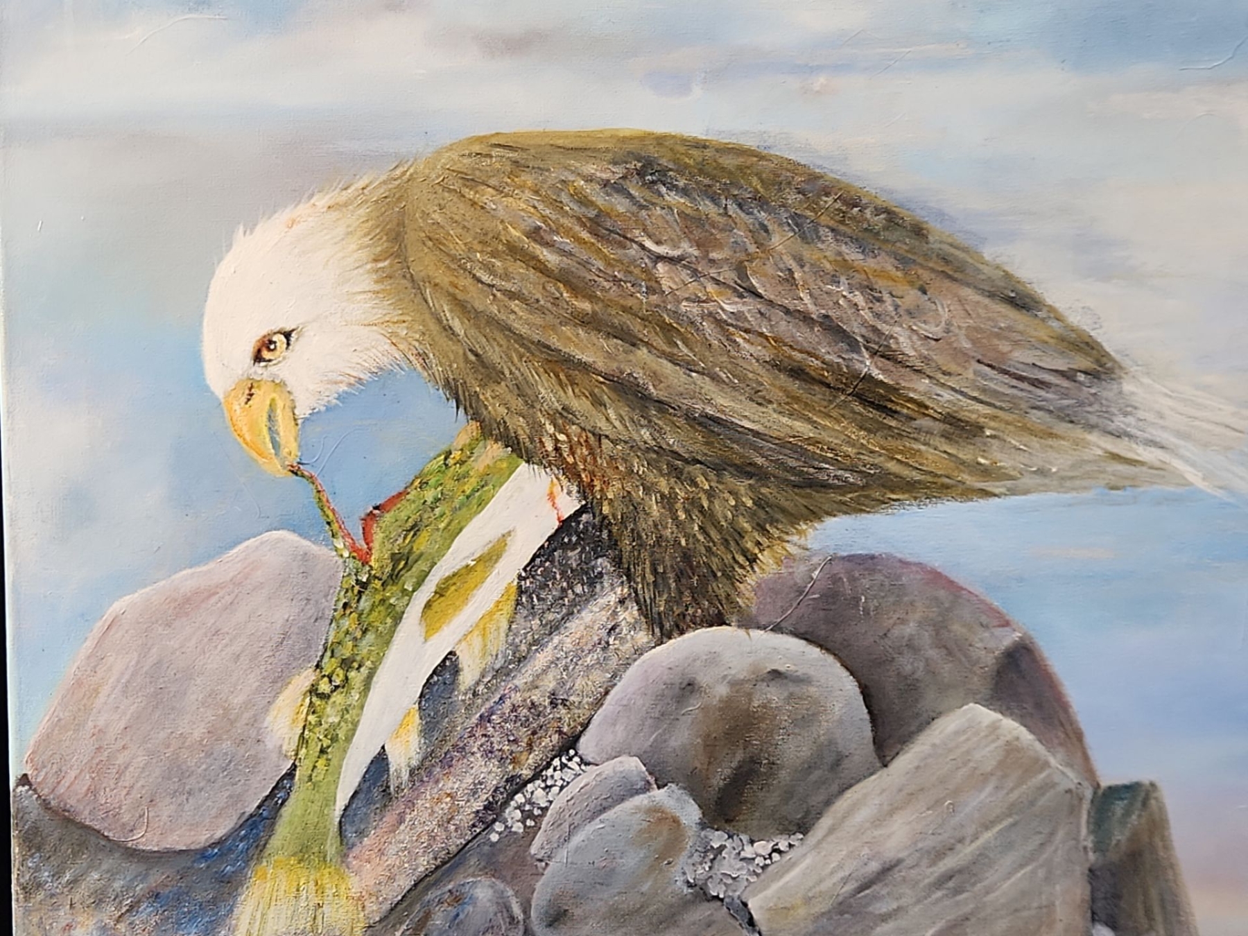 Beautiful Eagle and Trout canvas painting, showcasing an eagle catching a trout in stunning detail. Vibrant colors, dynamic action, and excellent craftsmanship. A great addition for wildlife art lovers or rustic décor.