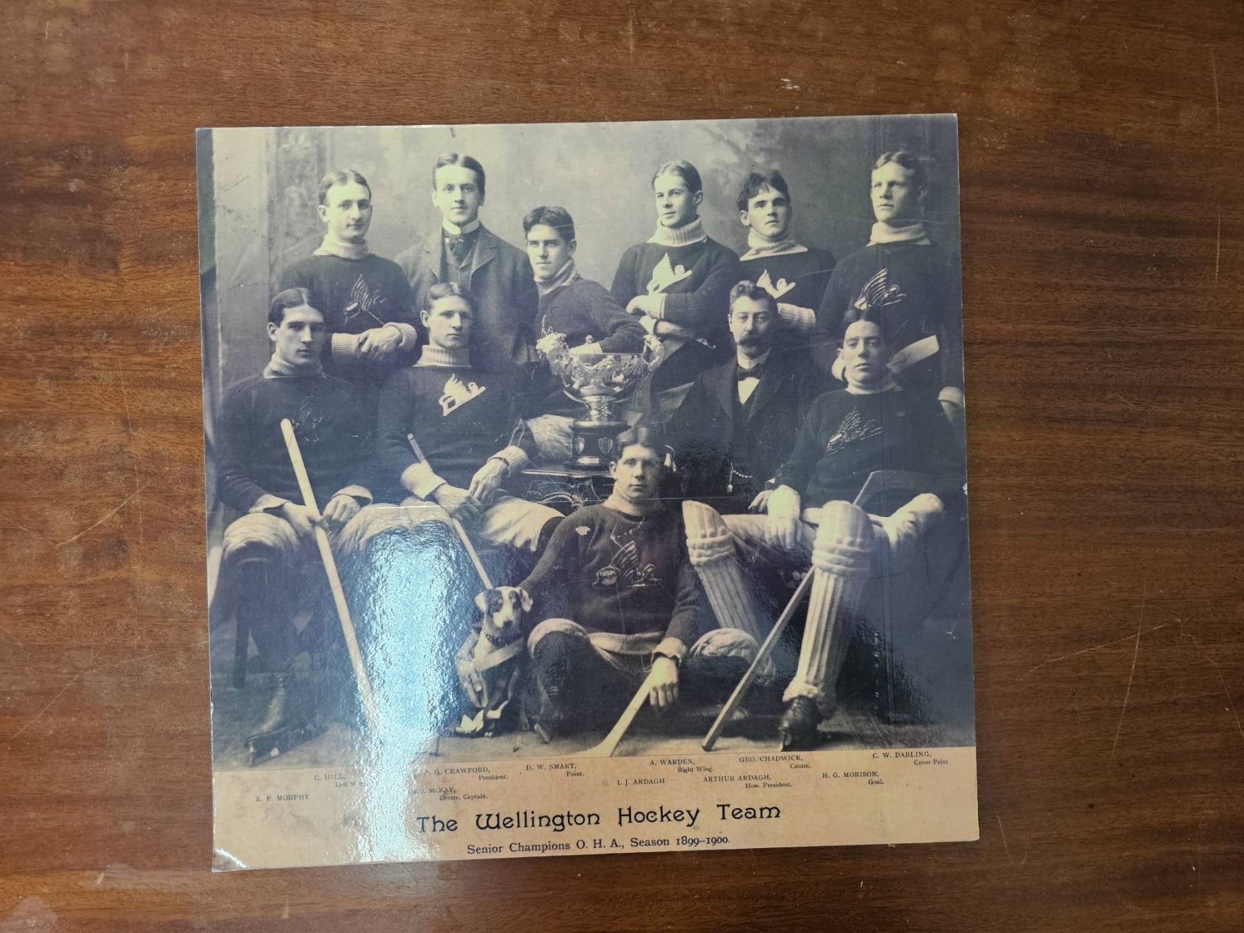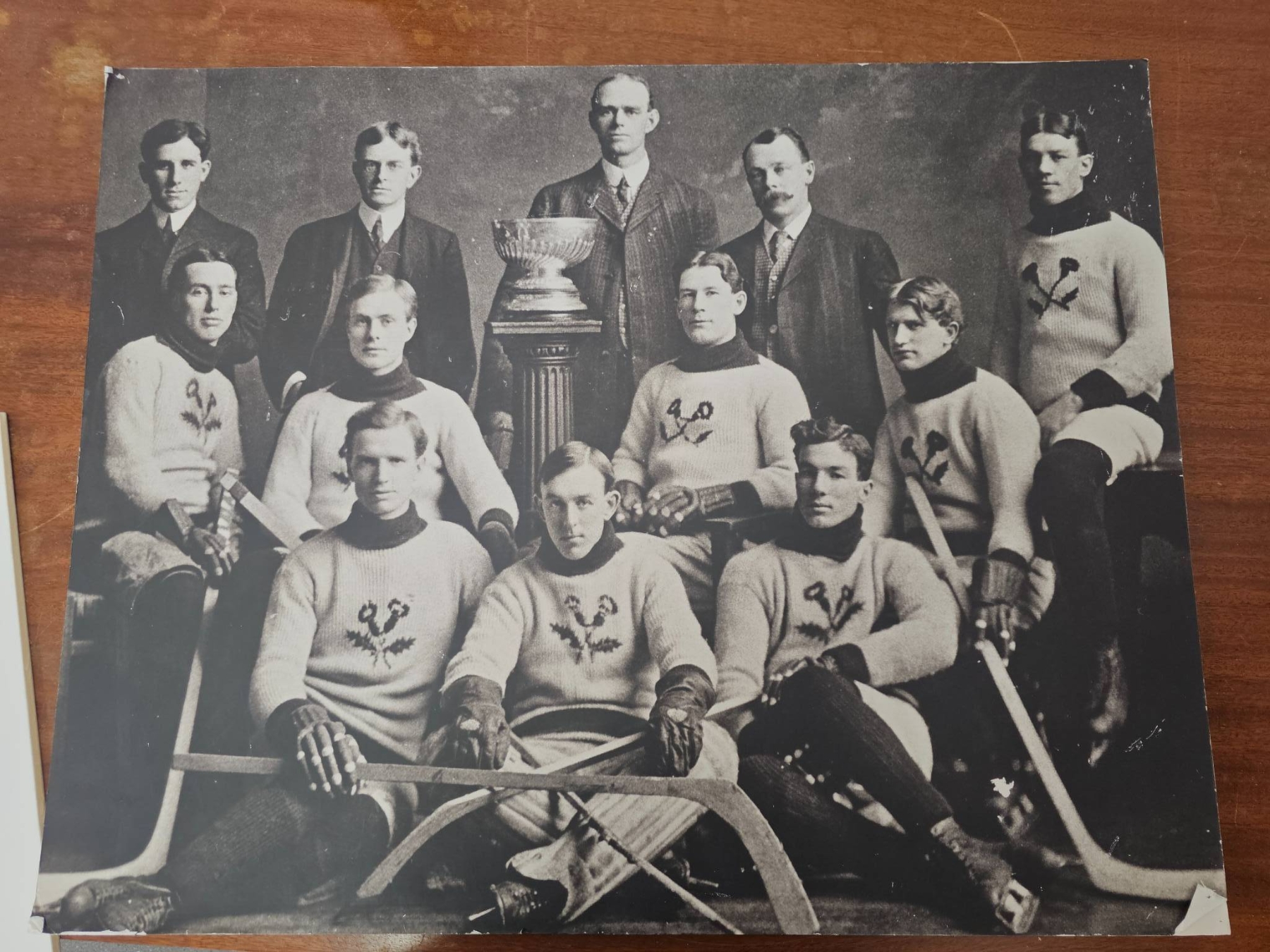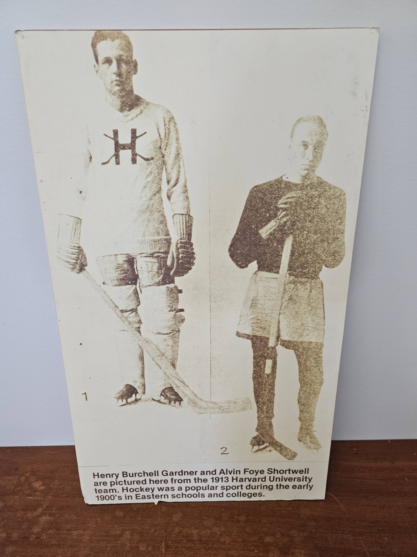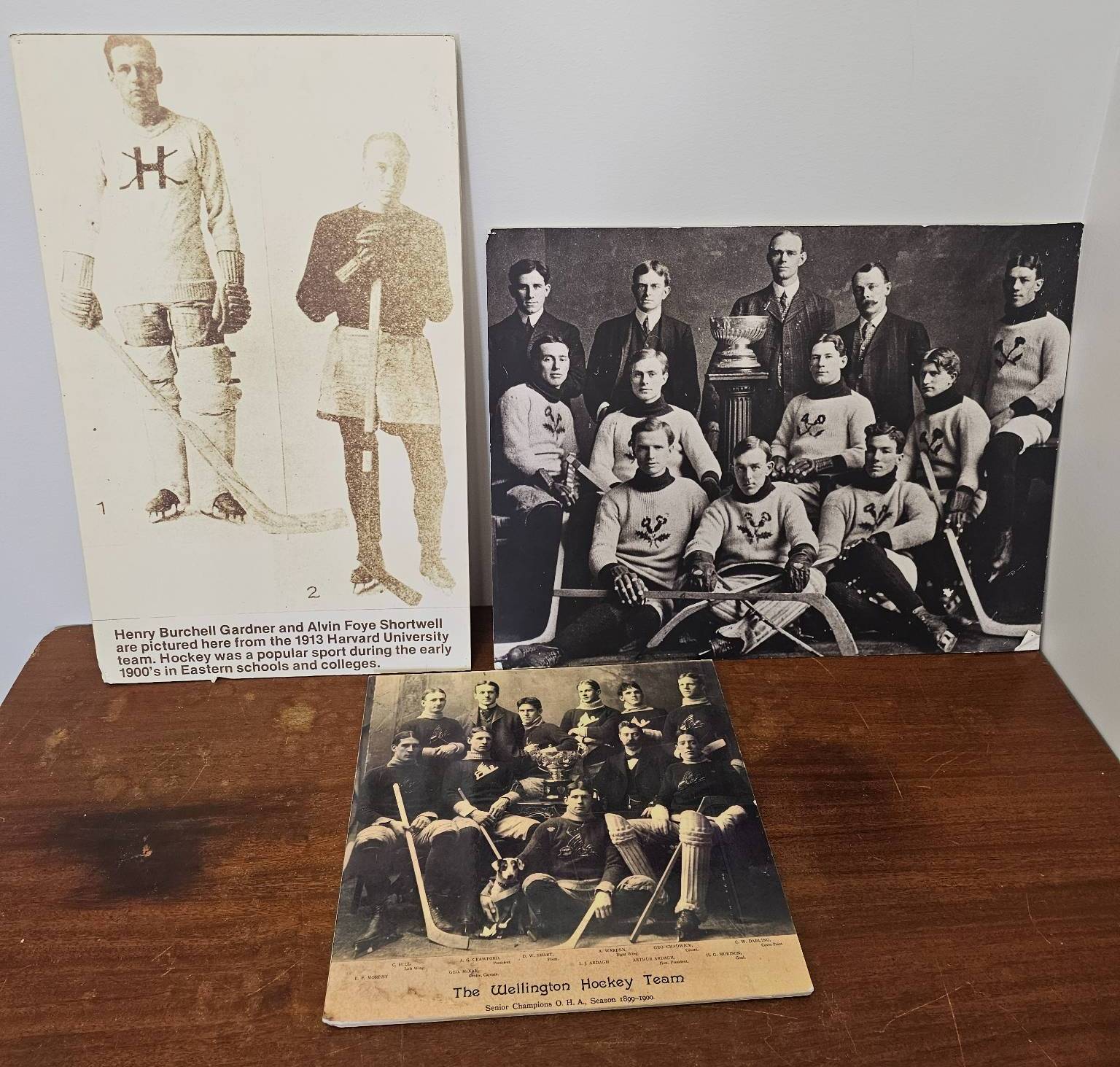 Vintage hockey-themed items includes three black-and-white photographs featuring early 20th-century hockey teams. One photograph features the Harvard University hockey team in 1913. The others showcase additional team portraits with equipment of the era. One photograph has handwritten "Wellington's" on the reverse. These prints highlight historical hockey uniforms and equipment, offering a glimpse into the sport's early history.