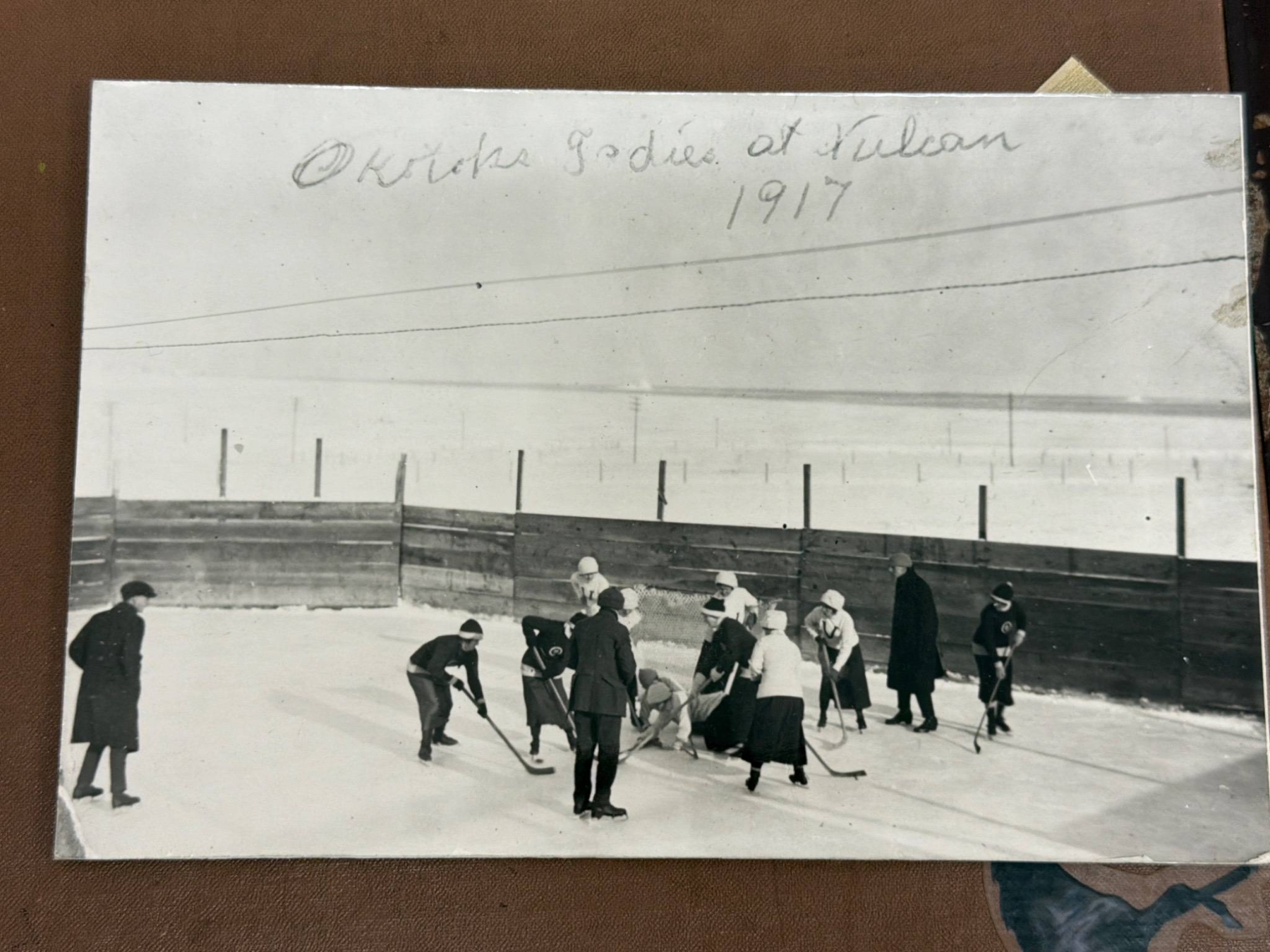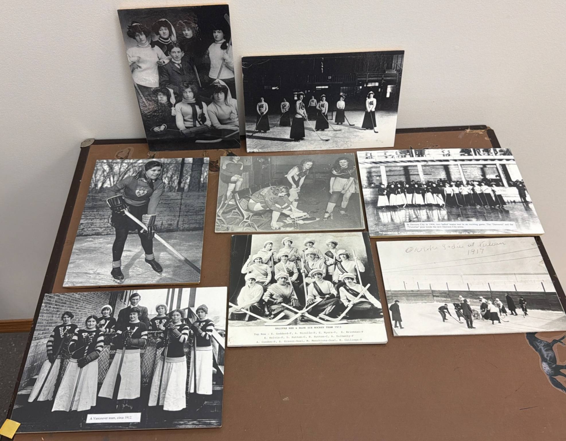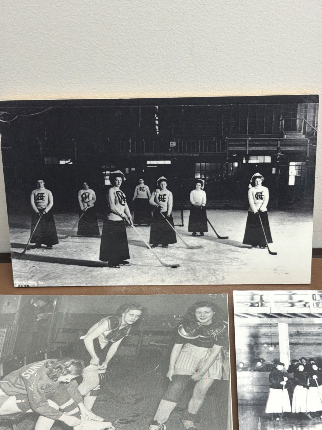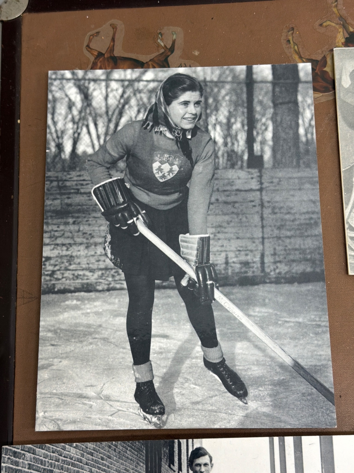 A remarkable collection of vintage photographs depicting women's hockey teams and players from the early 20th century. Highlights include team group photos, action shots on outdoor and indoor rinks, and historical notes referencing games from 1917 to 1949. These black-and-white images are an excellent window into the history of the sport and women's roles in athletics. Ideal for sports history enthusiasts or collectors of historical memorabilia.